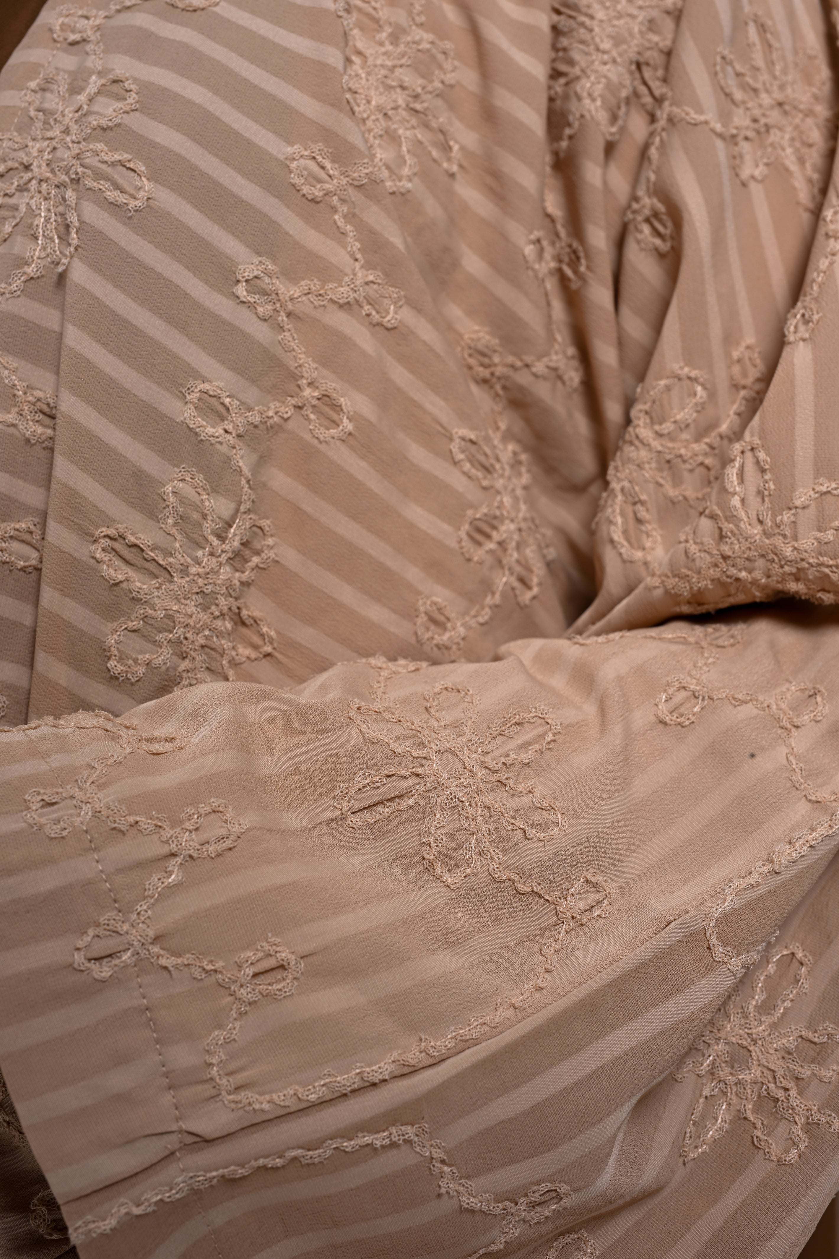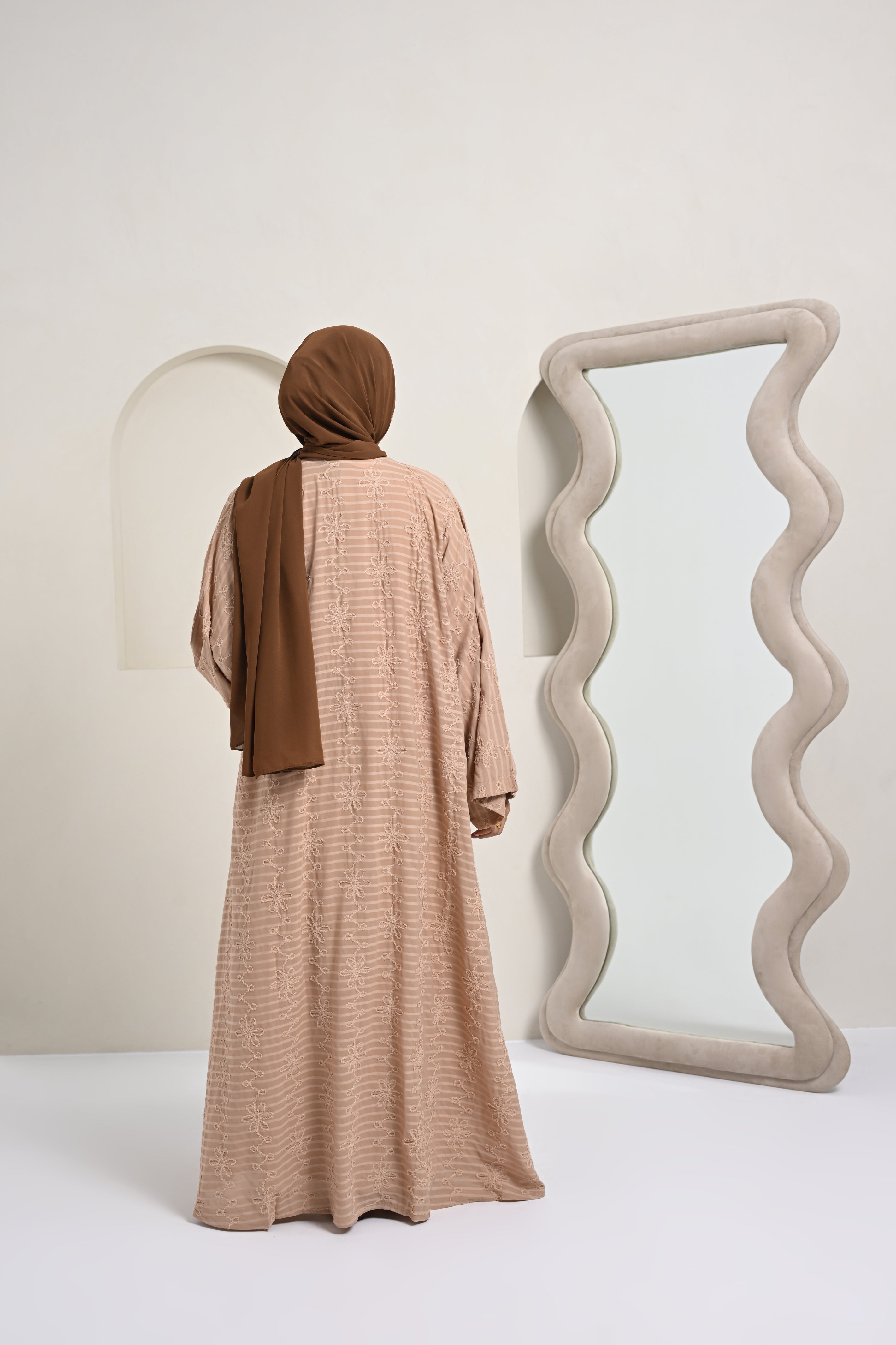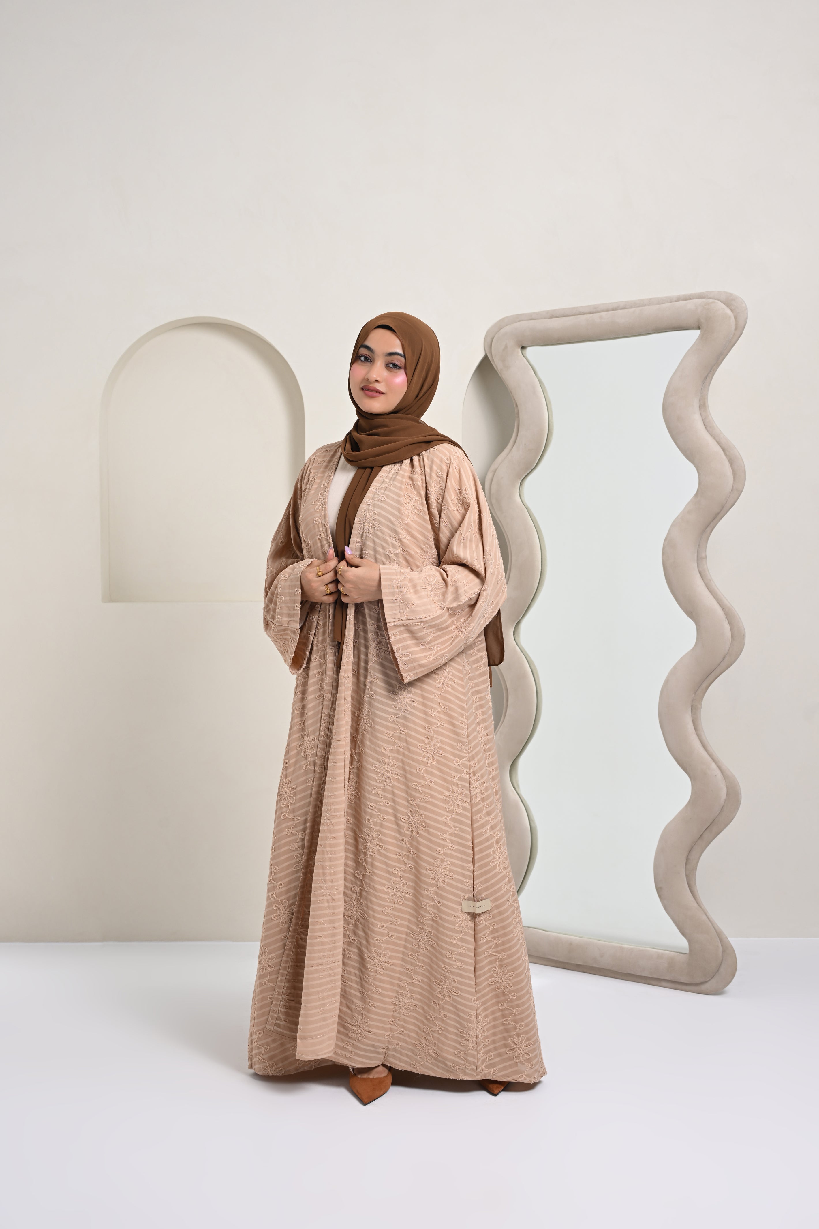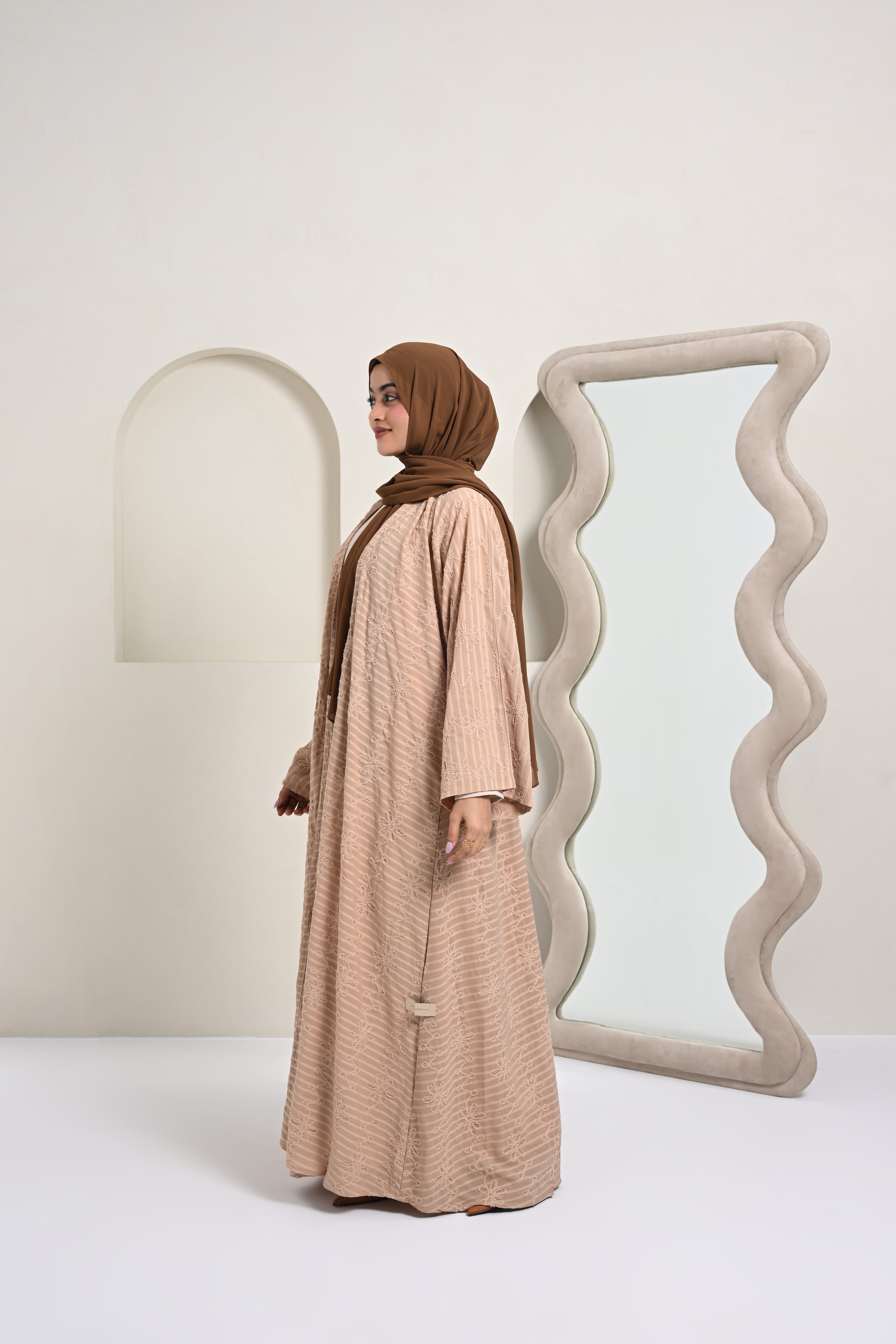 A modern kaftan abaya featuring subtle stripes for an effortless statement.