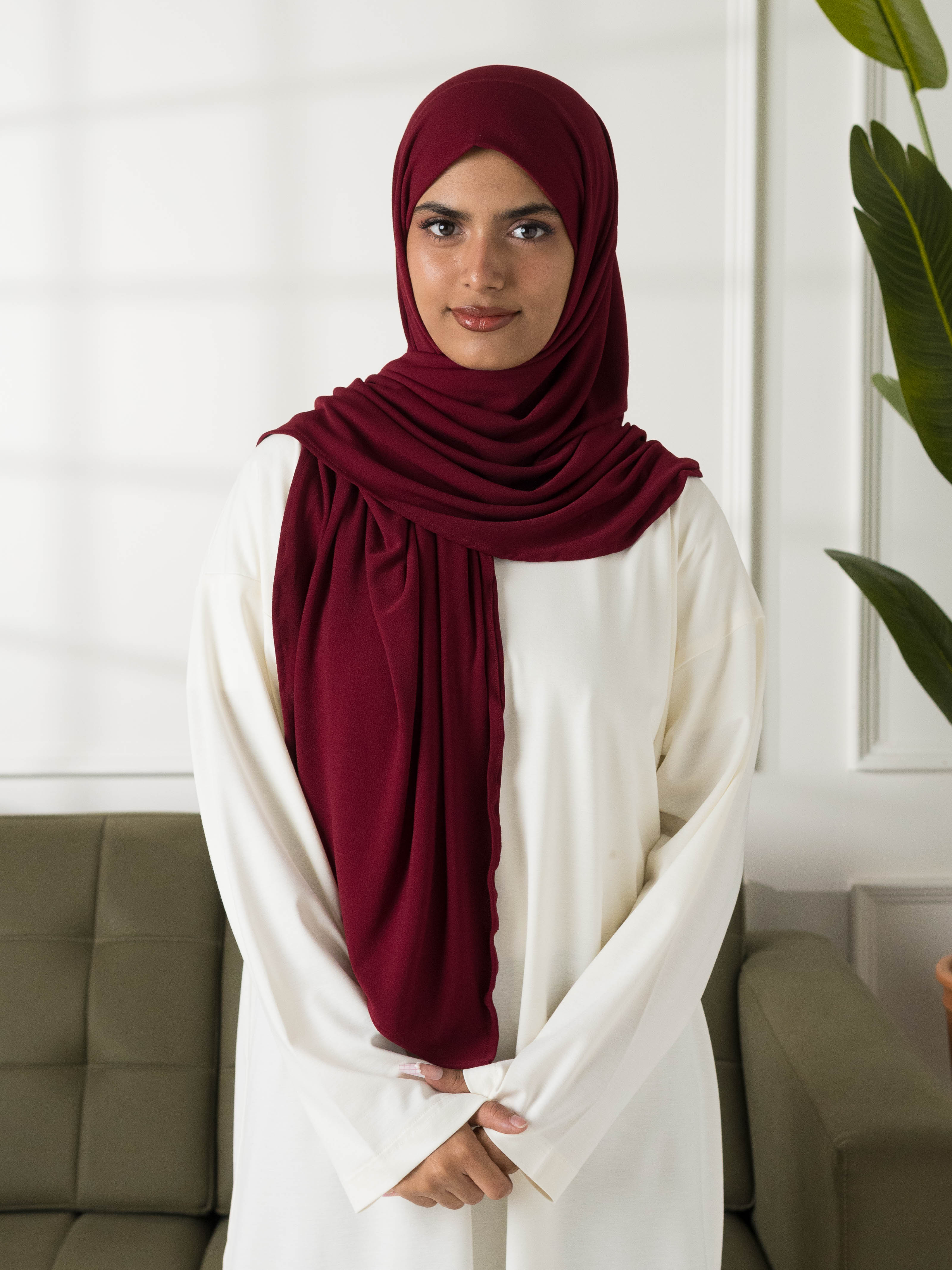 PINLESS AND IRONLESS! Easy to wear, beautiful colours, lots of styles , our new Easy Hijab - Cherry Red will always spelled ''pretty'' when worn for work, Zoom meeting, any outing or even just stay at home. Made from light and cool moss crepe material, your daily activity, whether gardening or even exercising will be made easier.