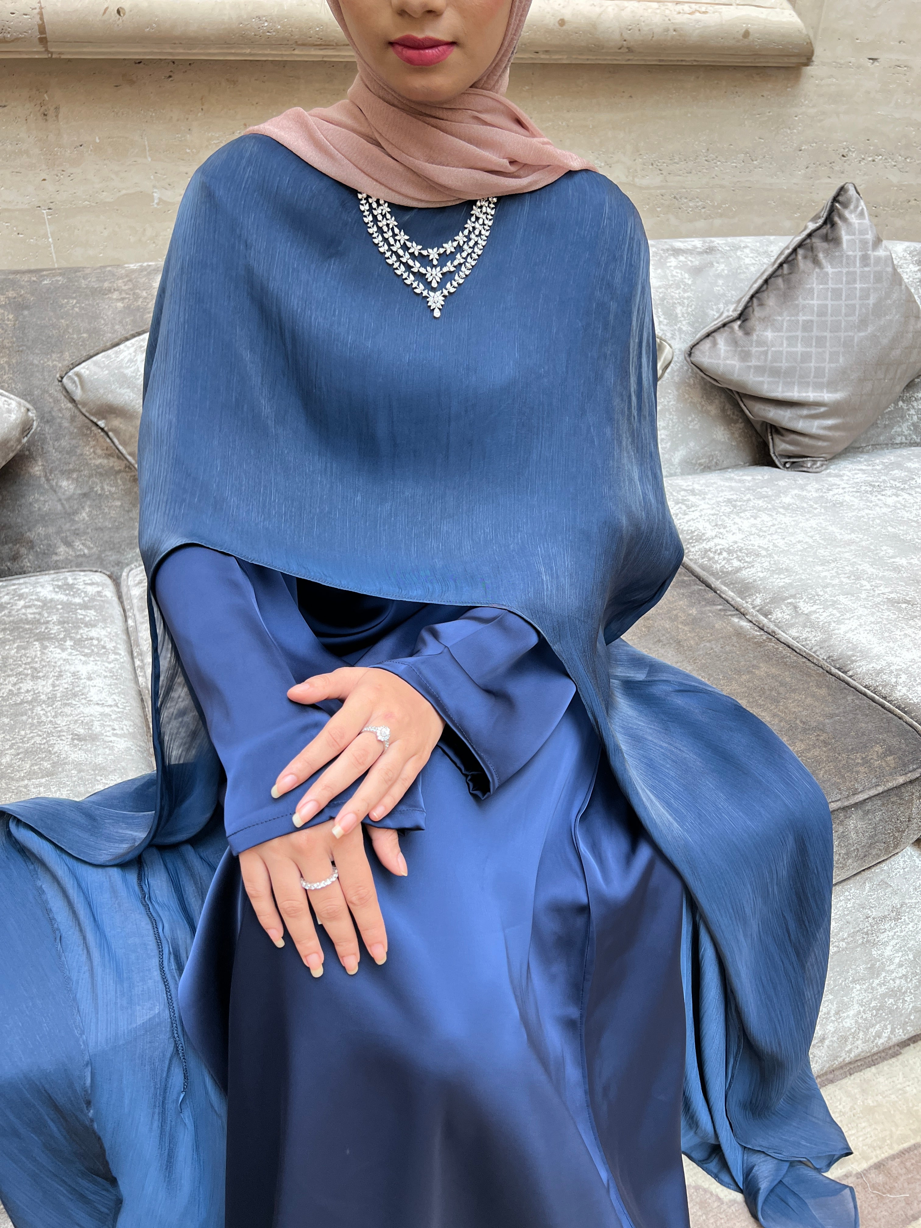 Elevate your Eid wardrobe with our luxurious Christie Cape Dress, designed to offer both elegance and comfort. This dress features a flowing long cape, adding a dramatic and sophisticated touch to your festive attire. Paired with a full sleeve inner, it ensures a perfectly modest fit, while the lightweight material keeps you comfortable throughout the celebrations.
