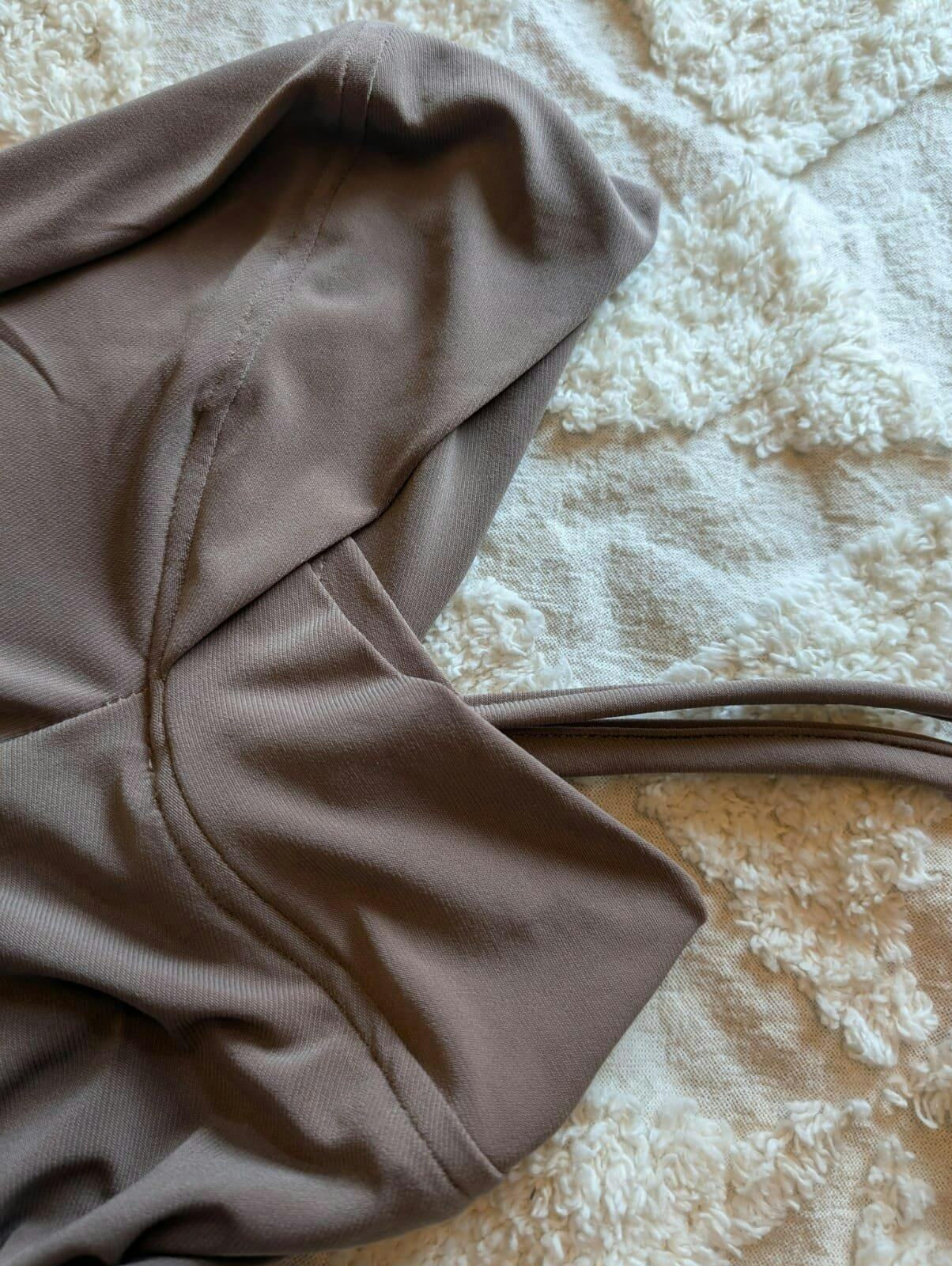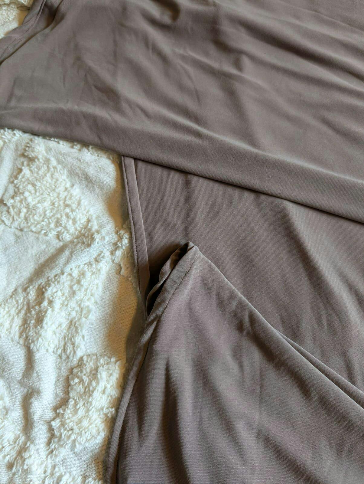 The overall look is lovely and modest. The length is slightly long for me, so a customization option would be great. Overall, it’s a beautiful abaya with great fabric and a stunning color.