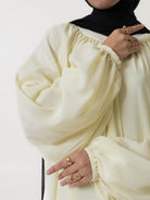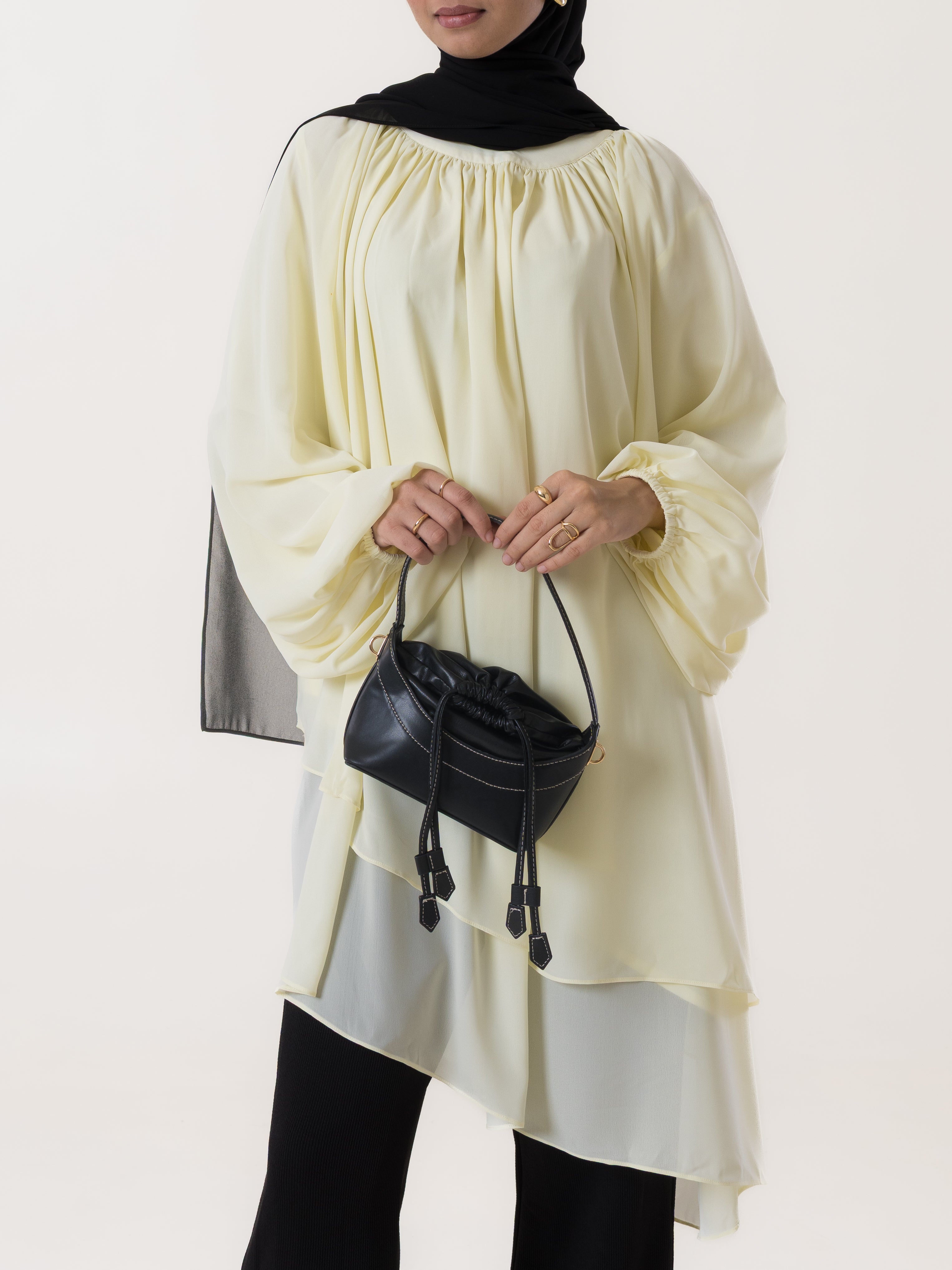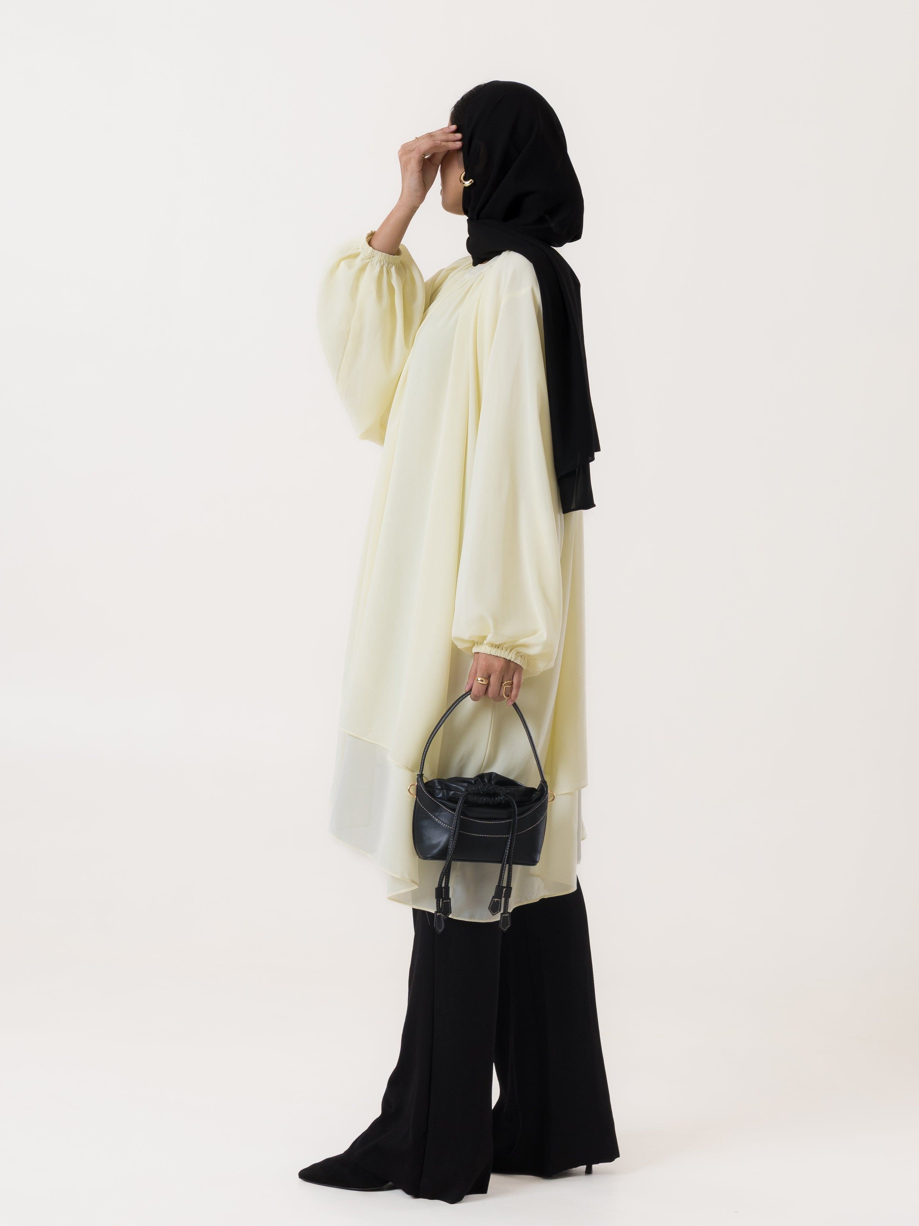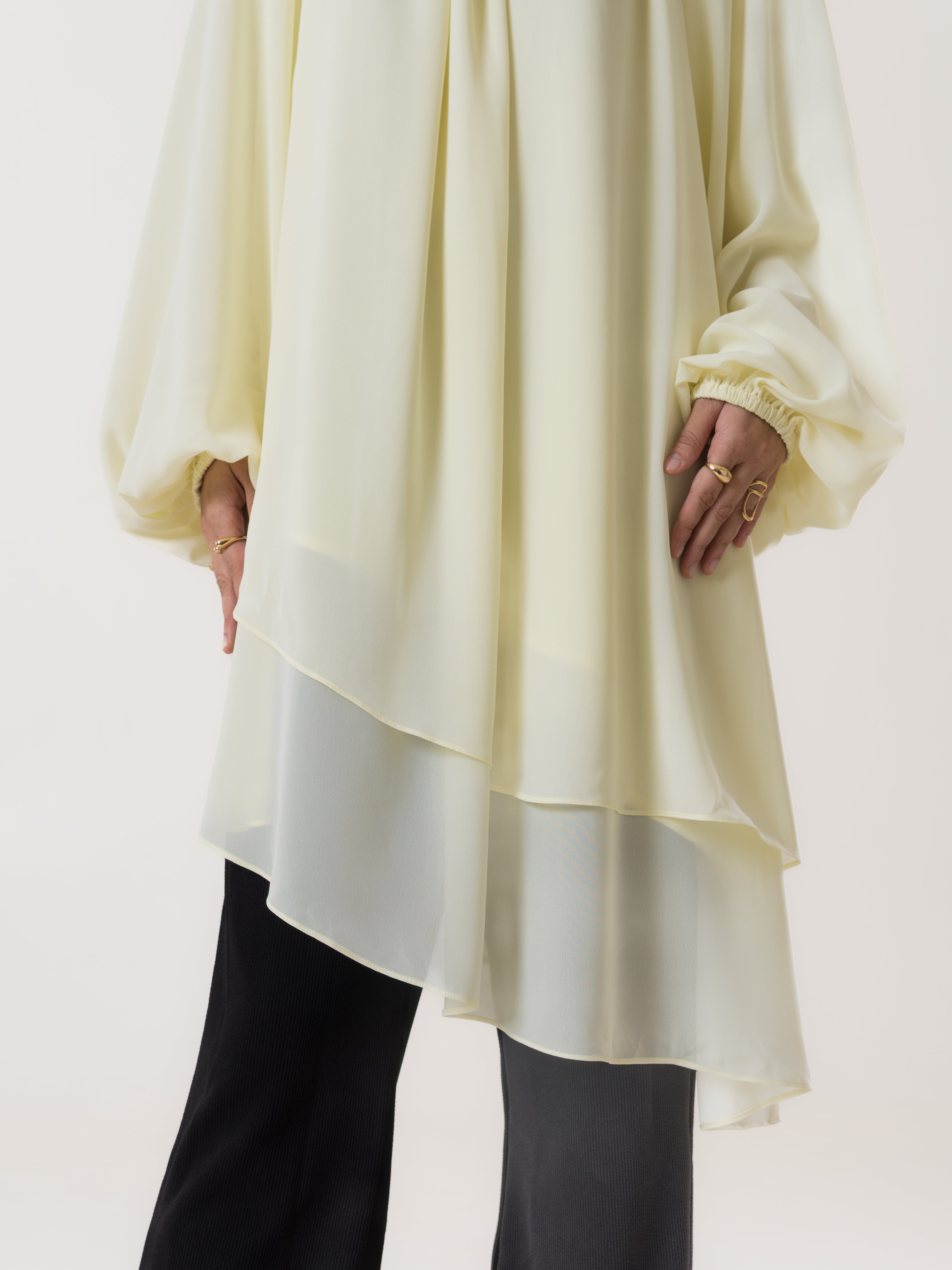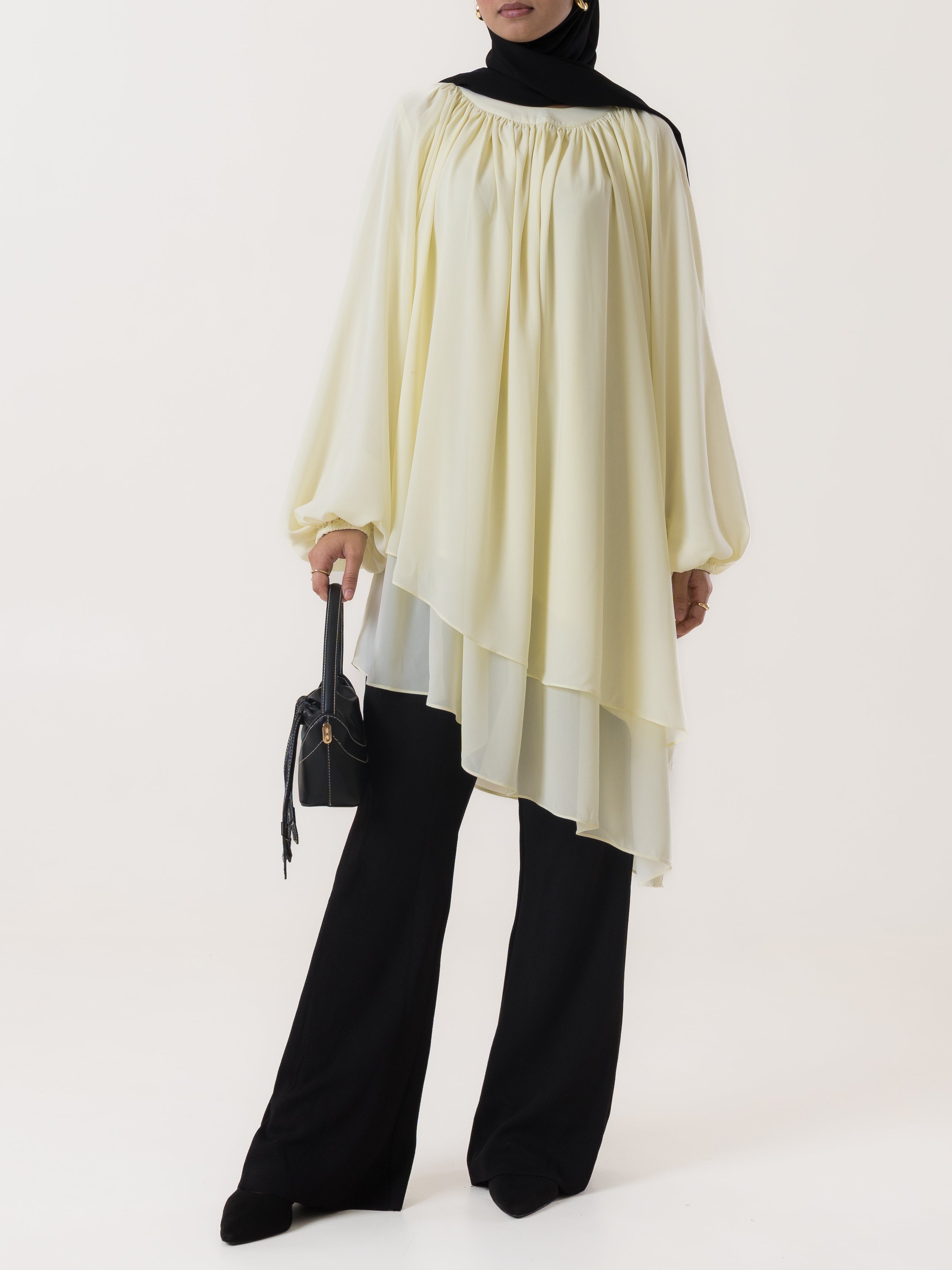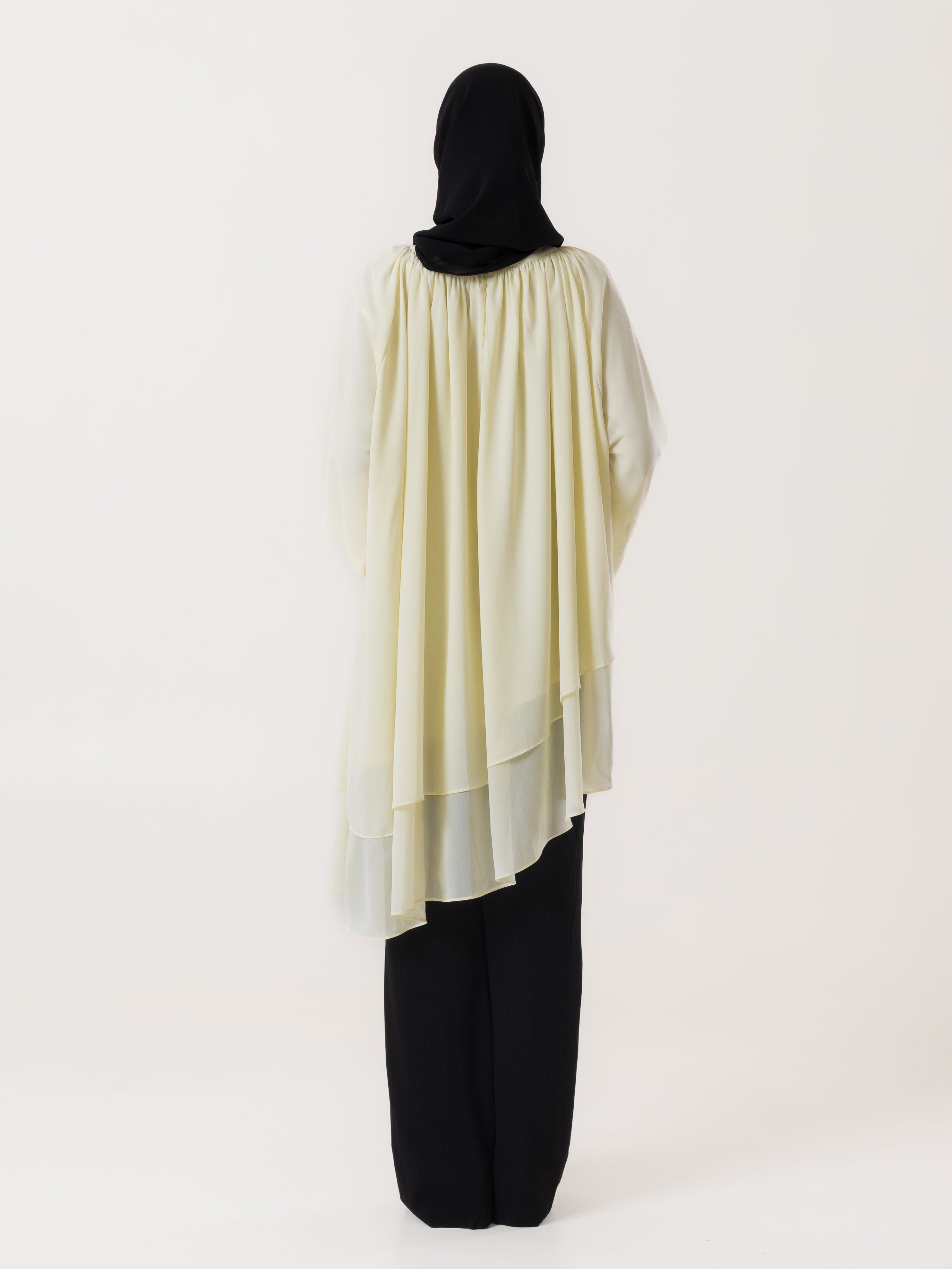 Elevate your wardrobe with our asymmetric layered chiffon top — a flowy, modest essential designed for effortless elegance. Featuring a gathered neckline, airy silhouette, and full sleeves with elasticated cuffs, this versatile piece comes with an inner for comfortable coverage, making it perfect for both everyday wear and special occasions.
