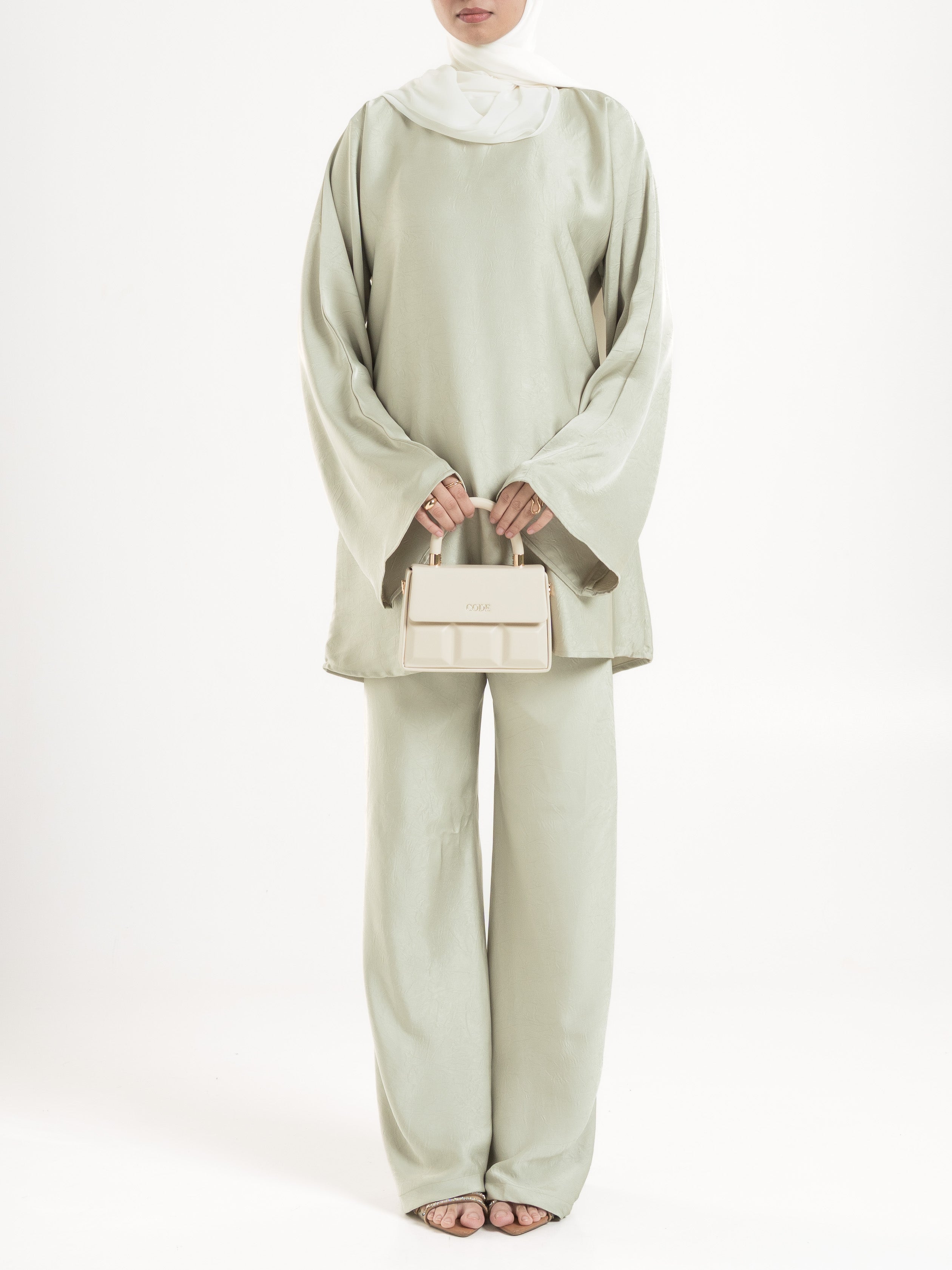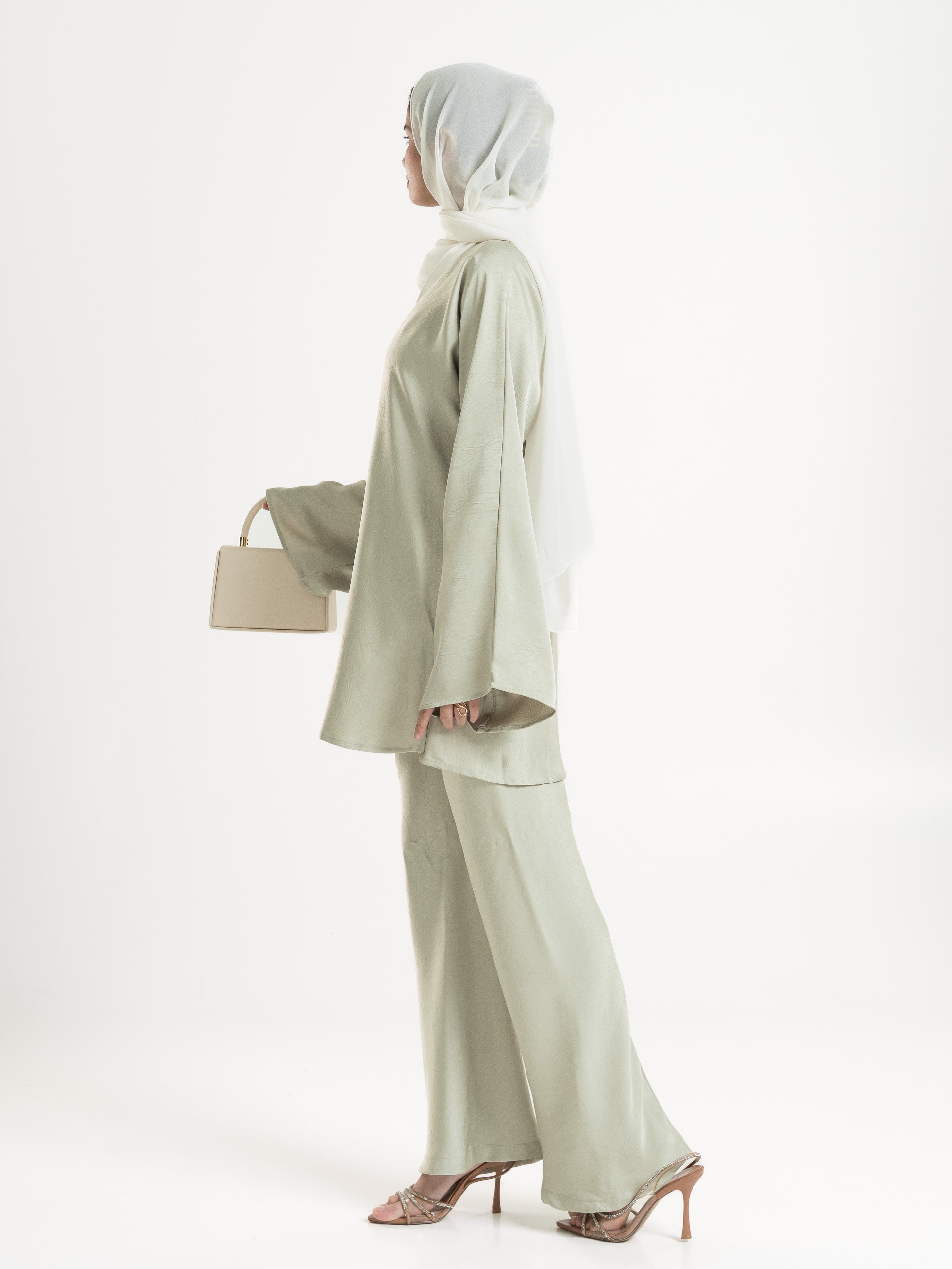 Crafted from luxurious textured satin, this co-ord set is designed to blend elegance with everyday comfort. Its soft sheen and graceful flow make it a versatile choice for both elevated daywear and chic evening outings.