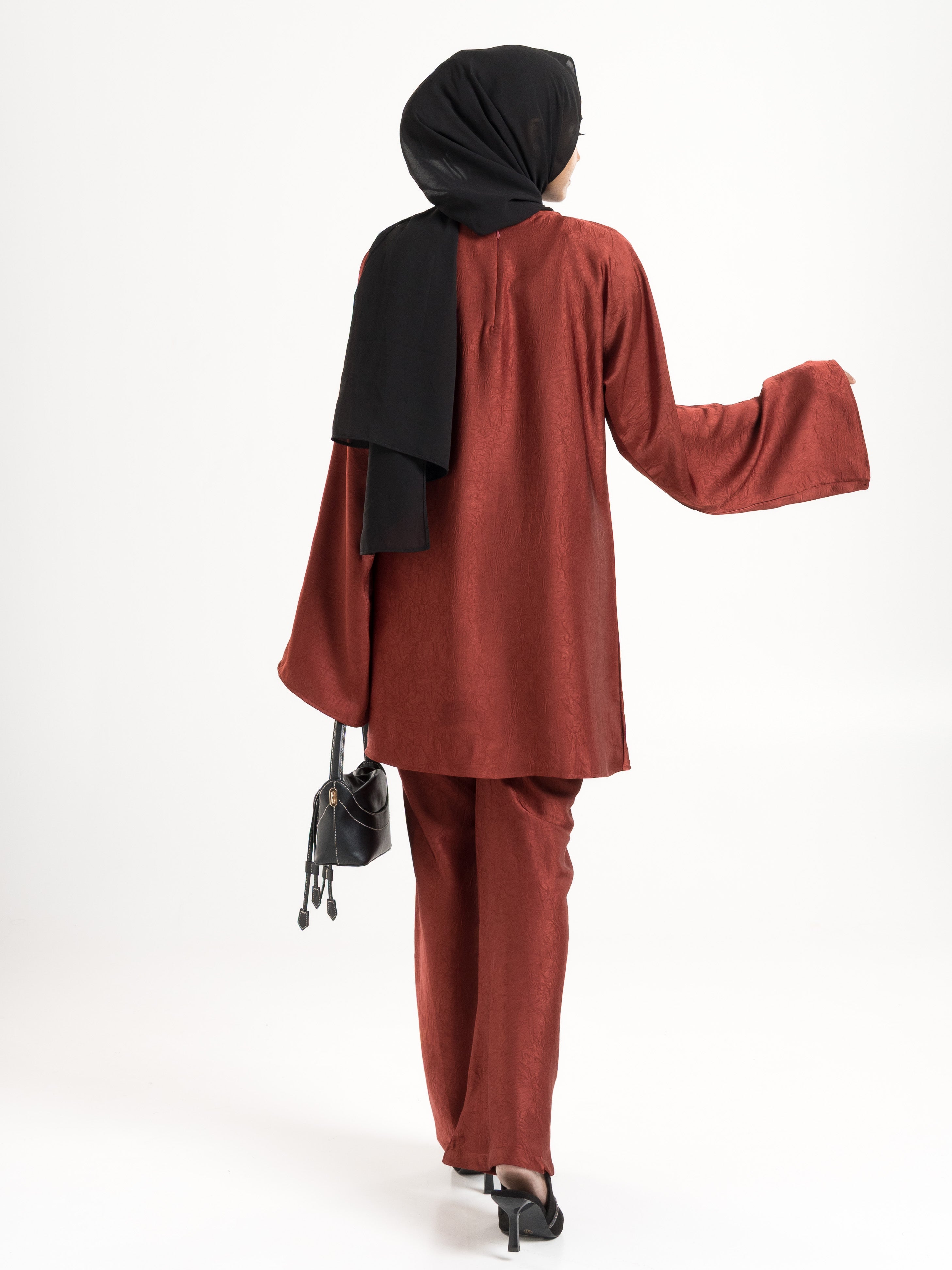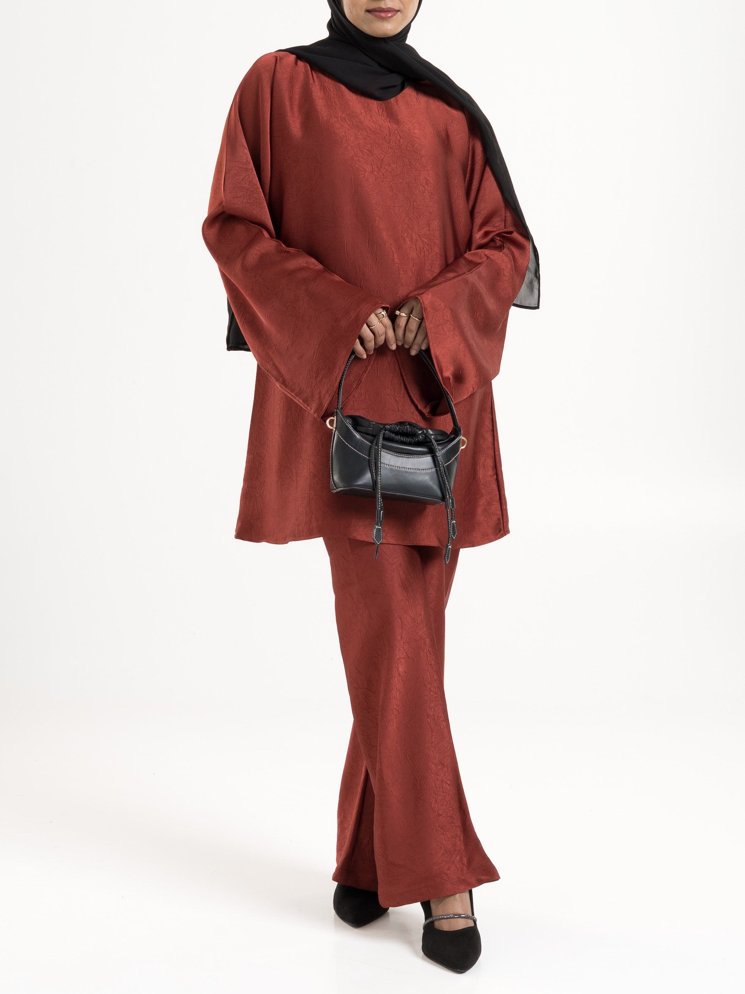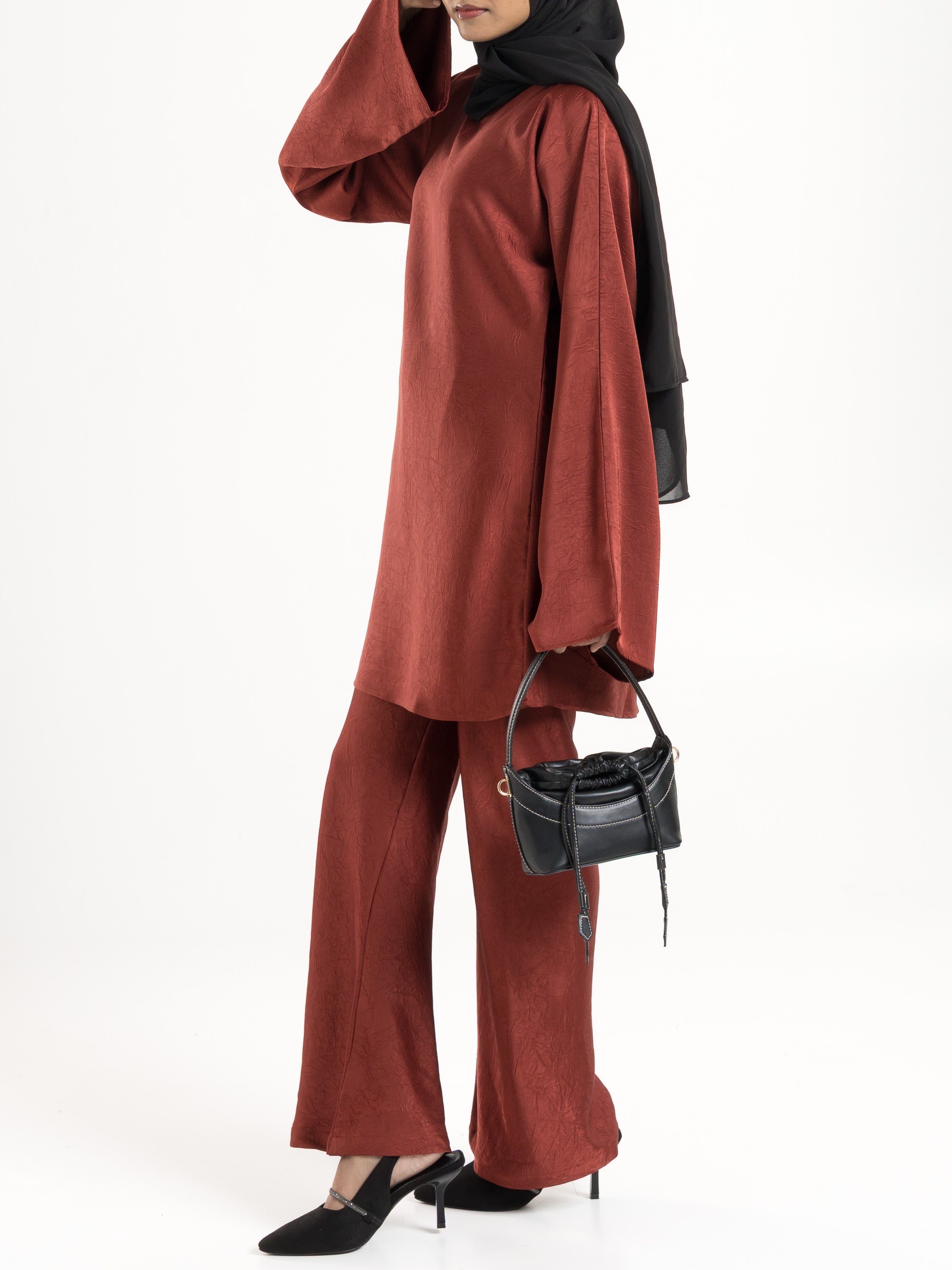 Crafted from luxurious textured satin, this co-ord set is designed to blend elegance with everyday comfort. Its soft sheen and graceful flow make it a versatile choice for both elevated daywear and chic evening outings.