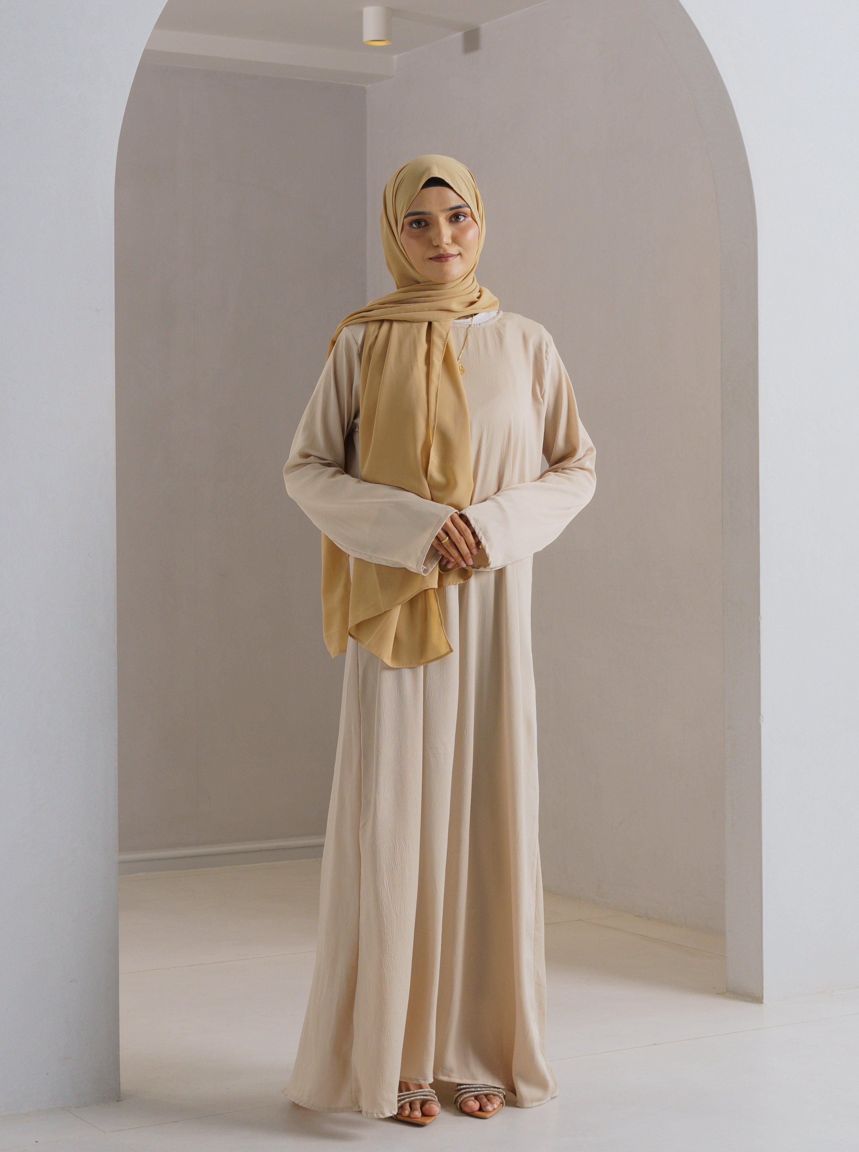 Introducing the Beige Full-Sleeve Base Dress - a harmonious blend of modesty and contemporary style. Meticulously crafted from crinkled satin fabric, this elegant dress offers the perfect combination of comfort and luxury.