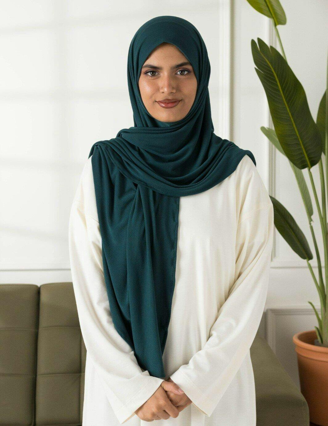 PINLESS AND IRONLESS! Easy to wear, beautiful colours, lots of styles , our new Easy Hijab - Forest Green will always spelled ''pretty'' when worn for work, Zoom meeting, any outing or even just stay at home. Made from light and cool moss crepe material, your daily activity, whether gardening or even exercising will be made easier.