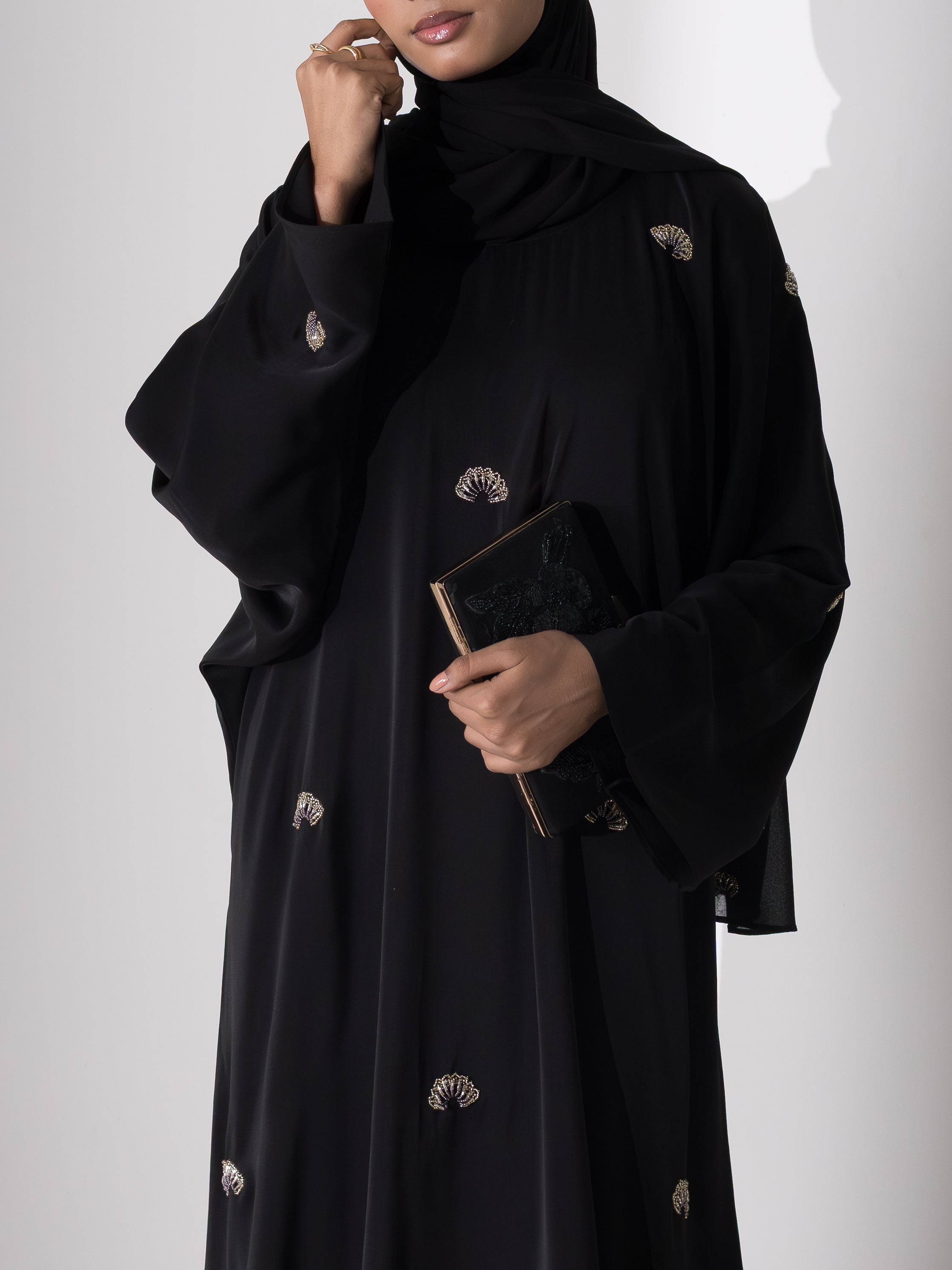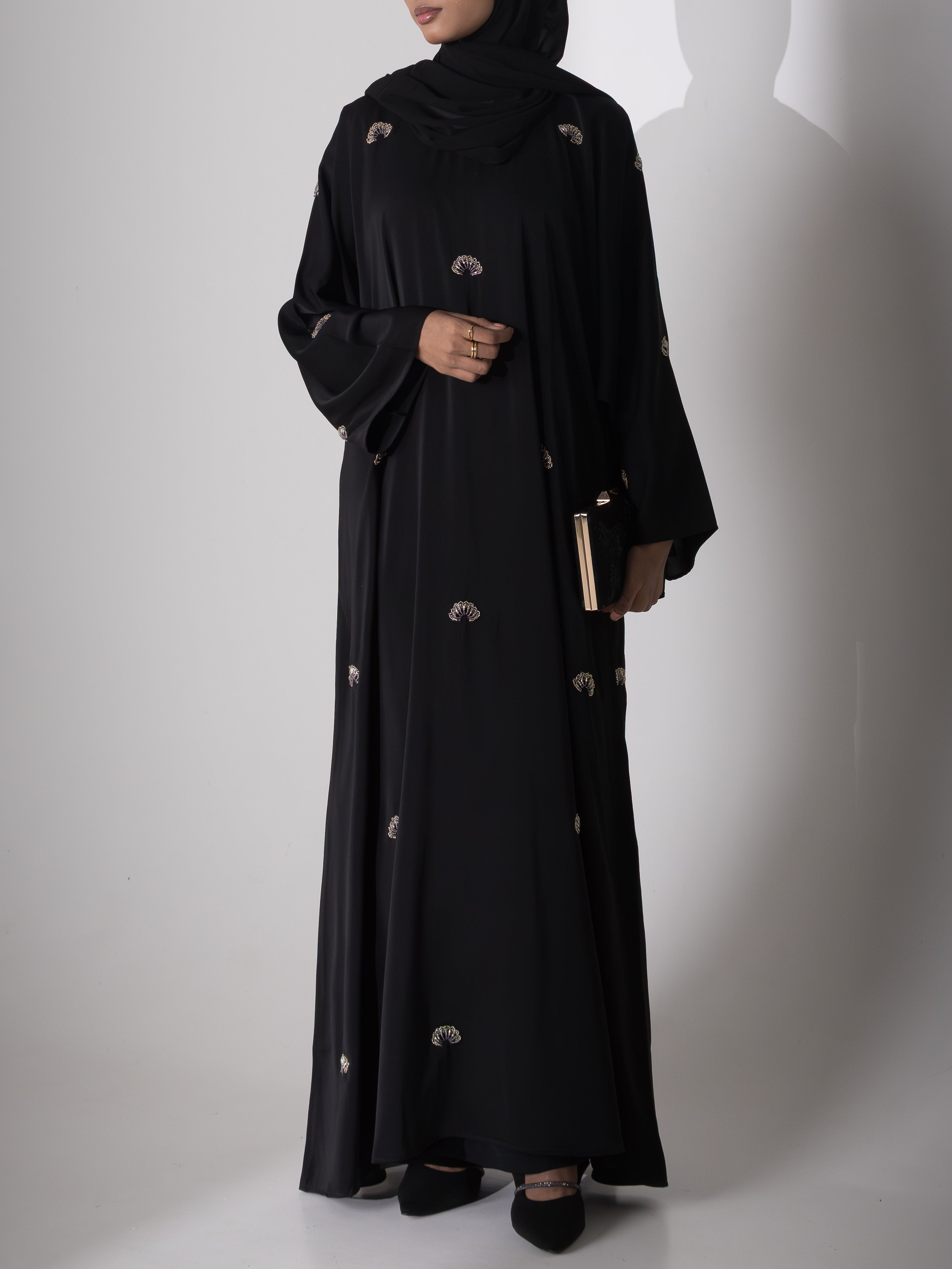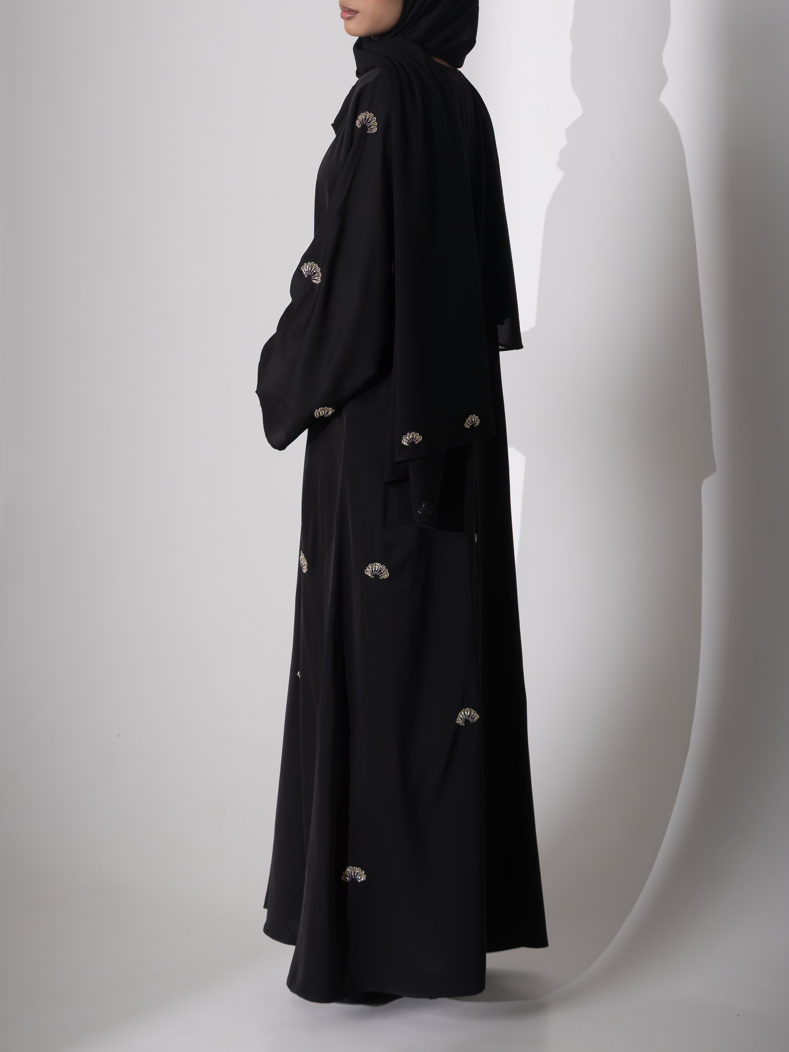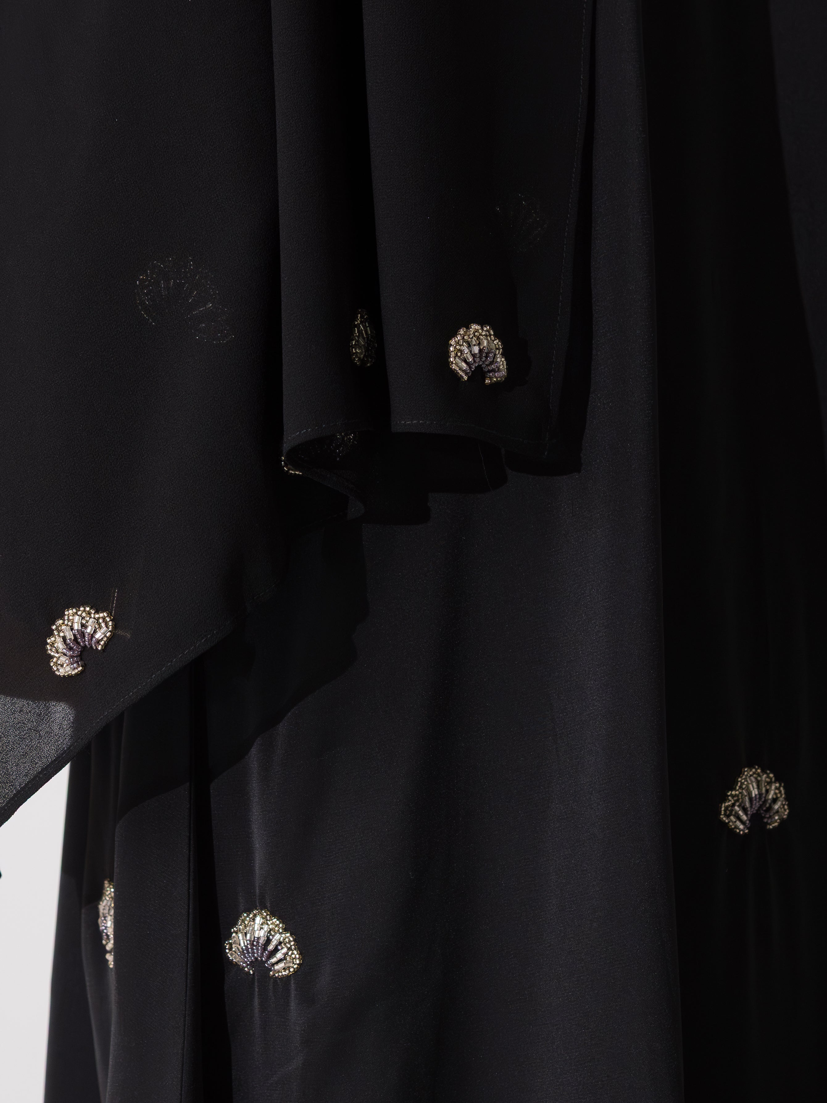 – A luxe abaya adorned with delicate shell hand-work detailing all over