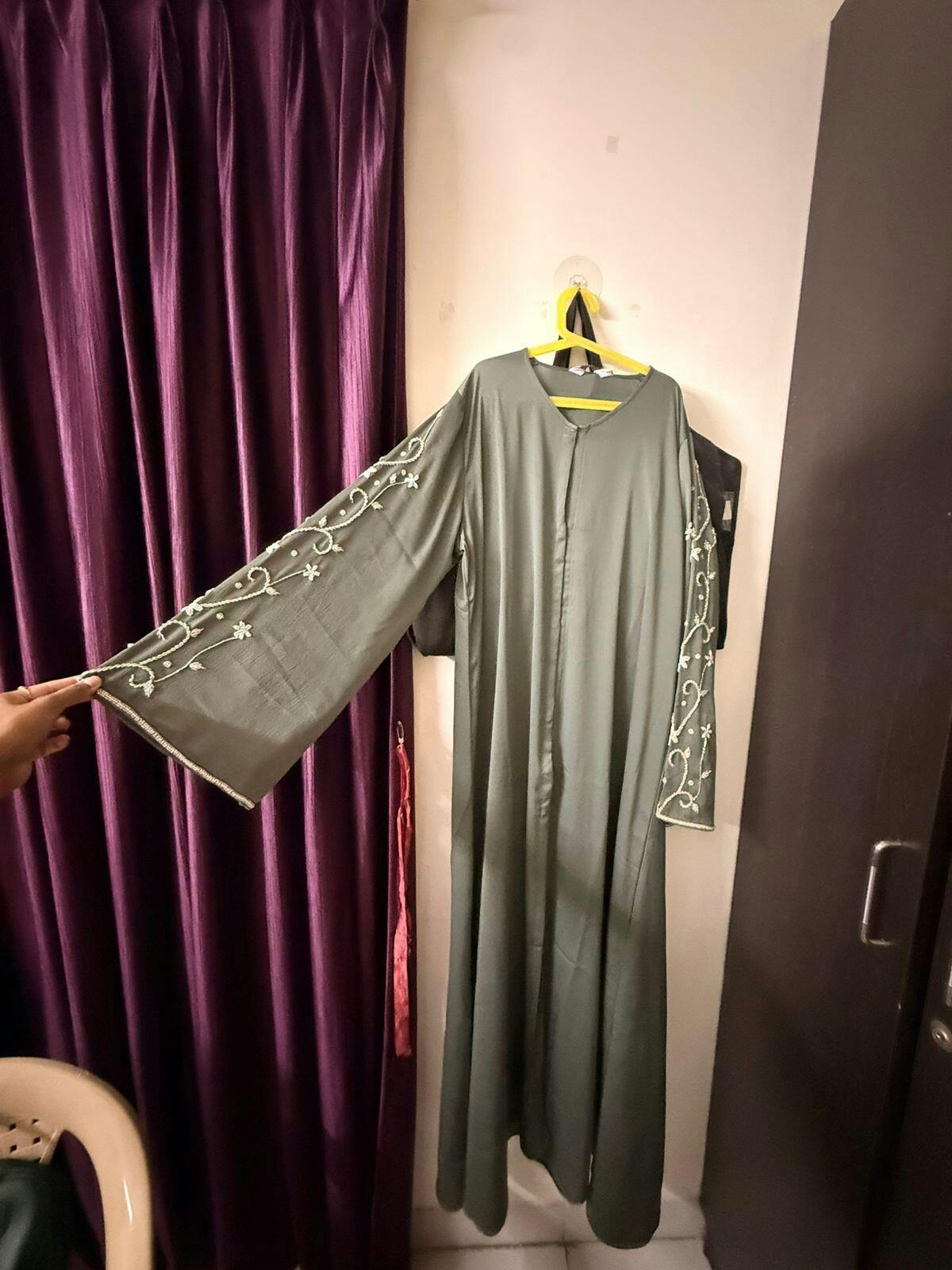 The Nashmia Abaya exudes elegance with its full sleeves adorned with delicate cutdana work and a classic button-down front. Paired with a matching hijab, it's perfect for Eid and minimal yet special occasions.