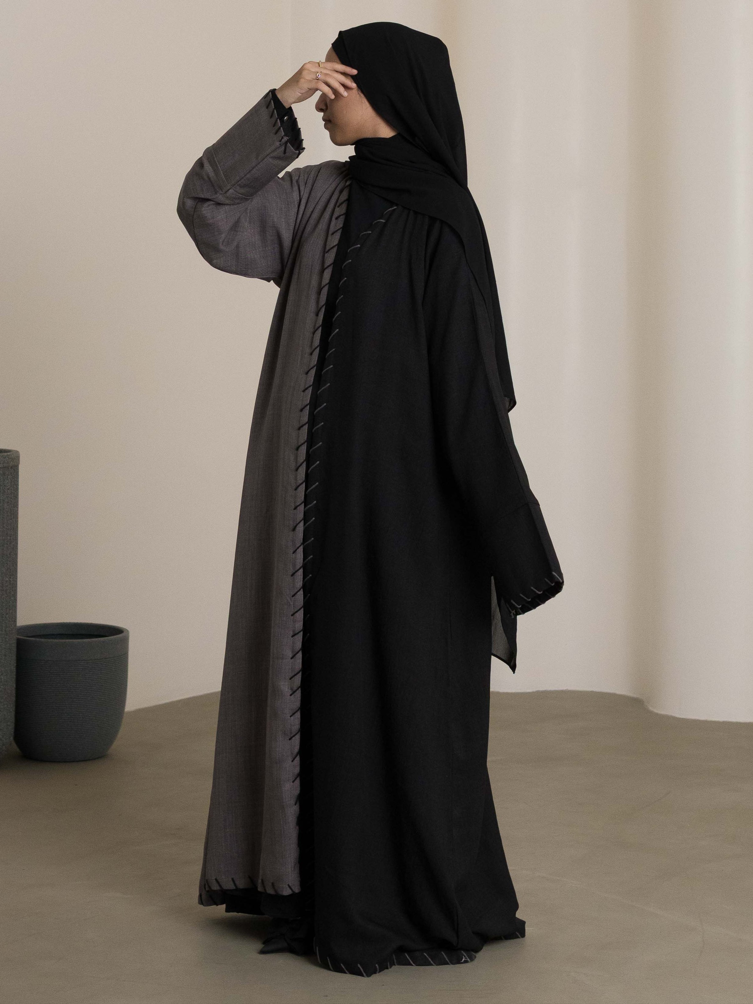 The Maliha Abaya features exquisite thread contrast work, creating a unique and refined look. With its flowy silhouette and striking color contrast, it exudes chic sophistication while ensuring comfort and ease of movement.