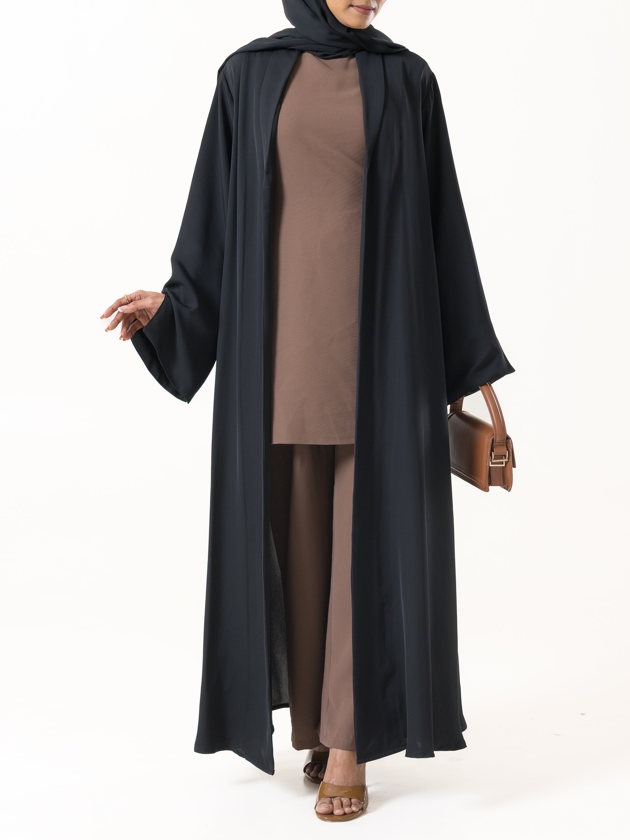 Vanessa Open Abaya, a versatile piece that redefines modest fashion with its contemporary, jacket-inspired silhouette. Crafted from a smooth, soft, and lightweight fabric, this abaya drapes beautifully, offering the elegance of a traditional robe with the structure of a modern coat. It's the ultimate layering piece, easily transitioning from an office look to weekend casual.