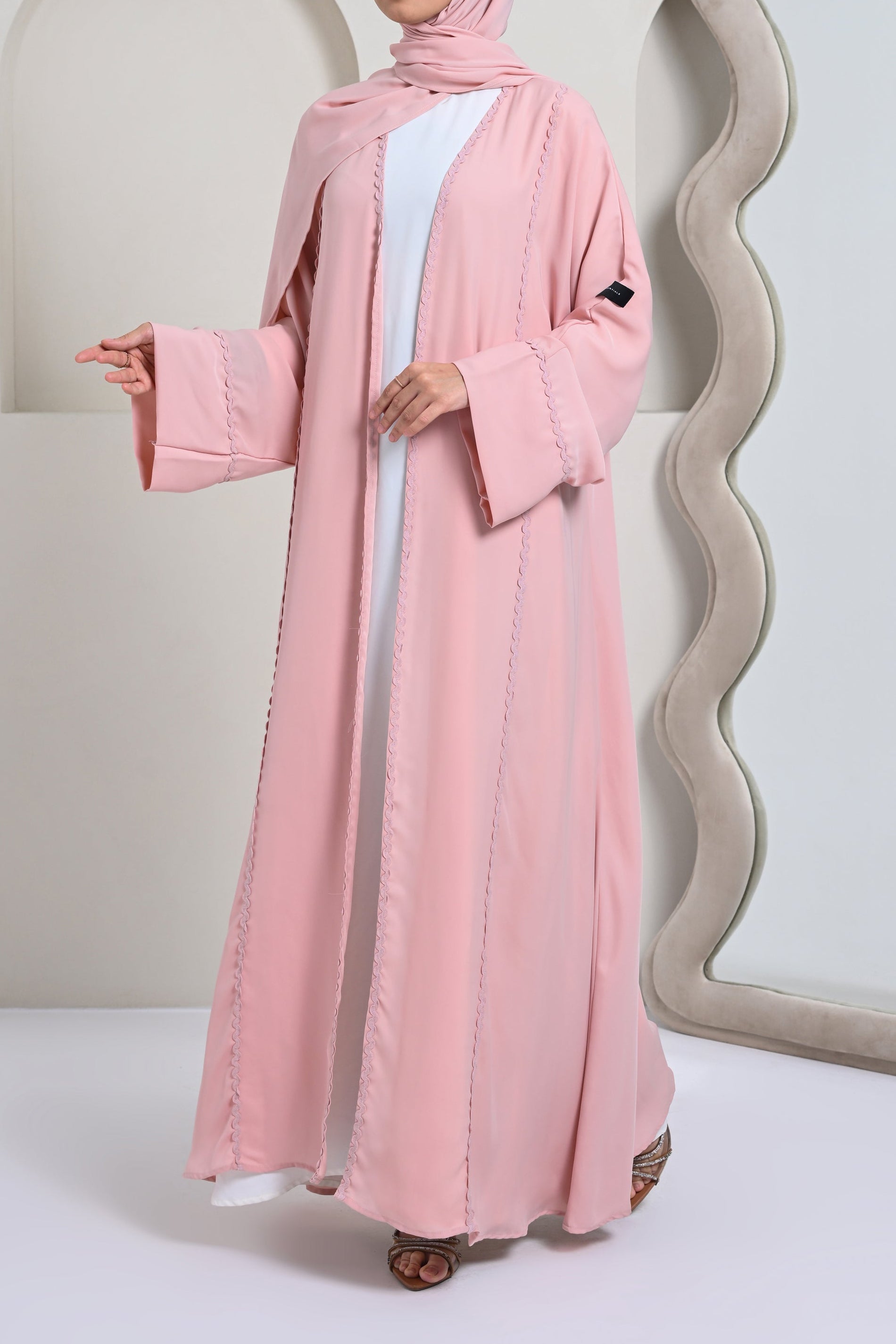 An elegant abaya highlighted with intricate swirl lace detailing.