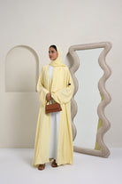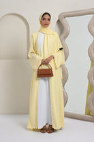 An elegant abaya highlighted with intricate swirl lace detailing.
