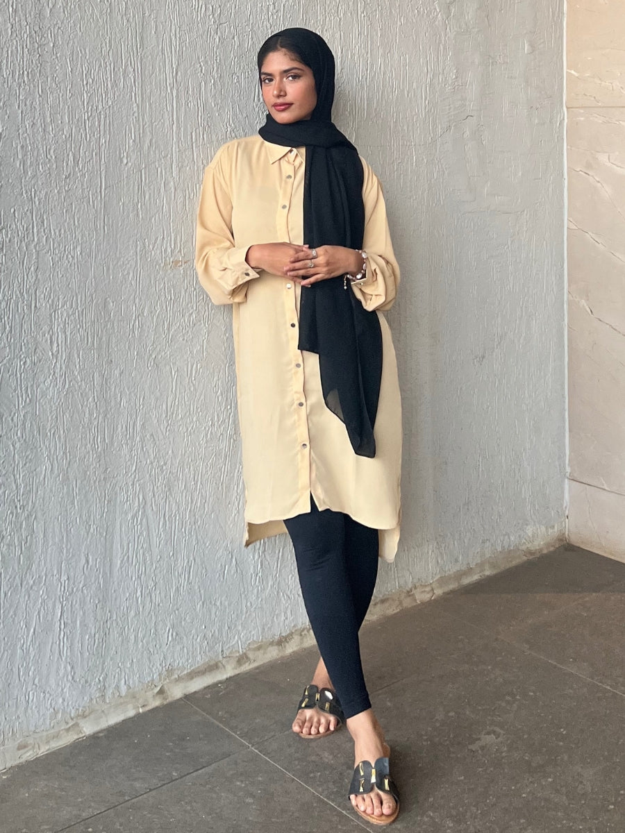 Our Satin Shirt - Soft Beige crafted with utmost care and attention to detail, this thigh-length shirt is designed to make heads turn. The luxurious satin fabric drapes your body with a touch of sophistication, while the full sleeves and cuffs add a refined finishing touch. Whether you're attending a formal event or simply want to elevate your everyday style, this satin shirt is the perfect choice.
