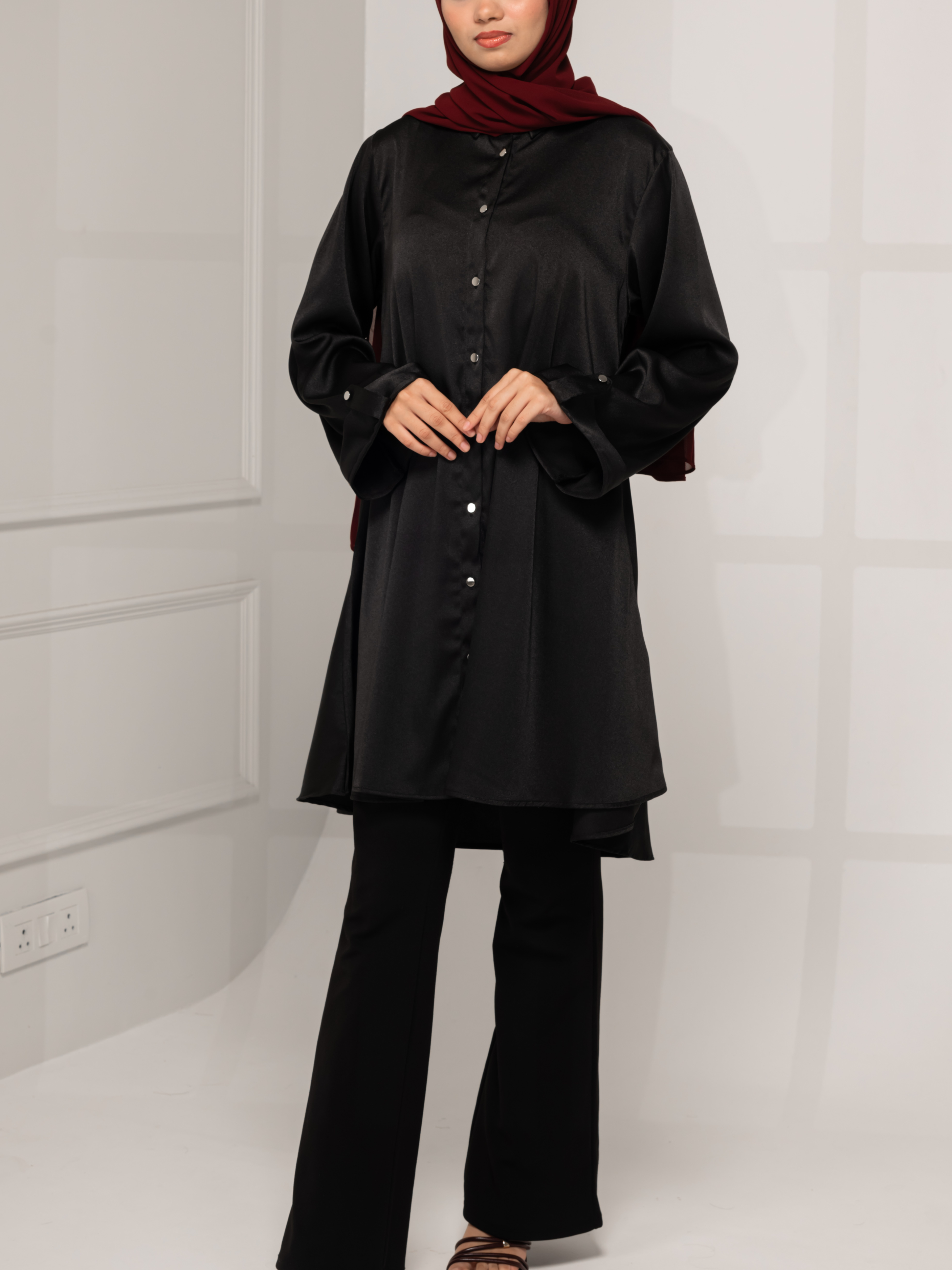 Introducing our sleek satin shirt, a perfect blend of modesty and modernity. Featuring long cuff sleeves and a flattering A-line design, this shirt gracefully falls to thigh length, providing ample coverage. The luxurious satin silk fabric adds a touch of elegance, making it an ideal choice for both casual and formal occasions.