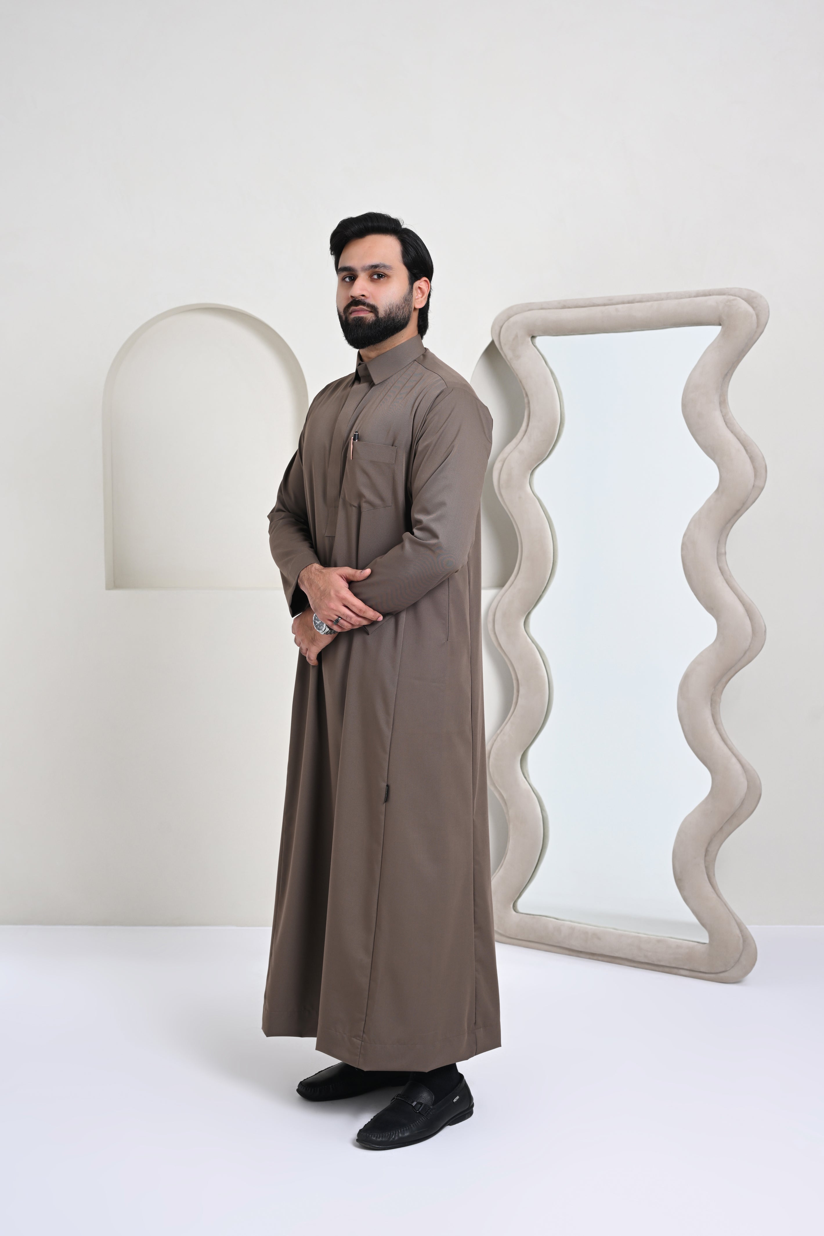 Structured Collar Band: Defined collar construction that enhances the formal character of the thobe.