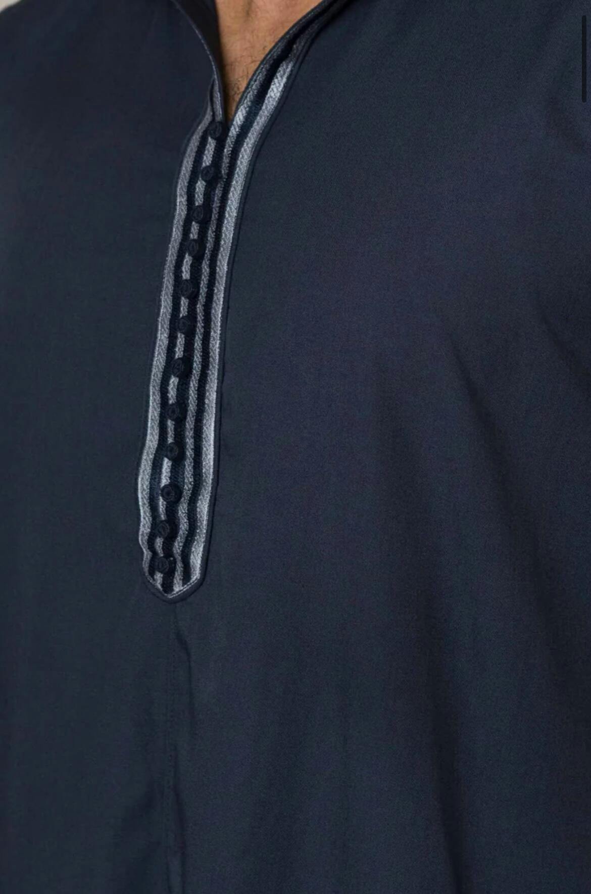• Thread Button Detail: Elegant thread button detailing on the neck enhances the thobe’s sophisticated look.