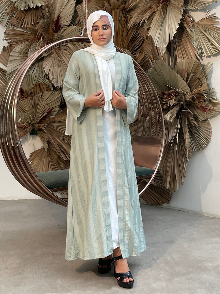 The Striped Abaya modernizes the traditional garment. This style of modest clothing has an overall striped pattern that lends a sense of modernity and elegance to your look. It has a cotton belt to cinch the waist and create a flattering silhouette. This abaya can be worn traditionally as an abaya/burqa or a shrug, making it a capsule wardrobe essential. The soft and airy fabric used in its making is ideal for summer, offering comfort without sacrificing style.