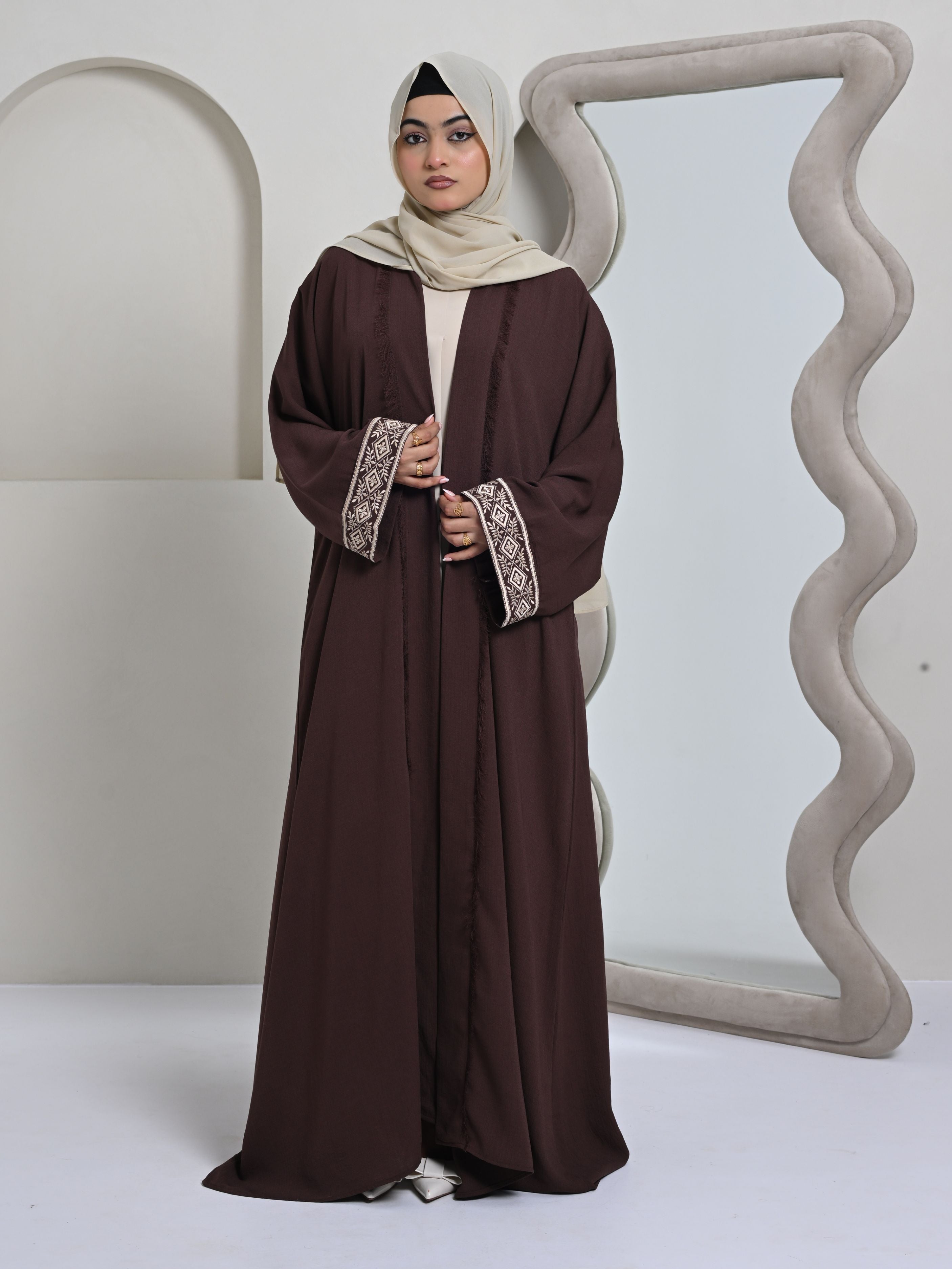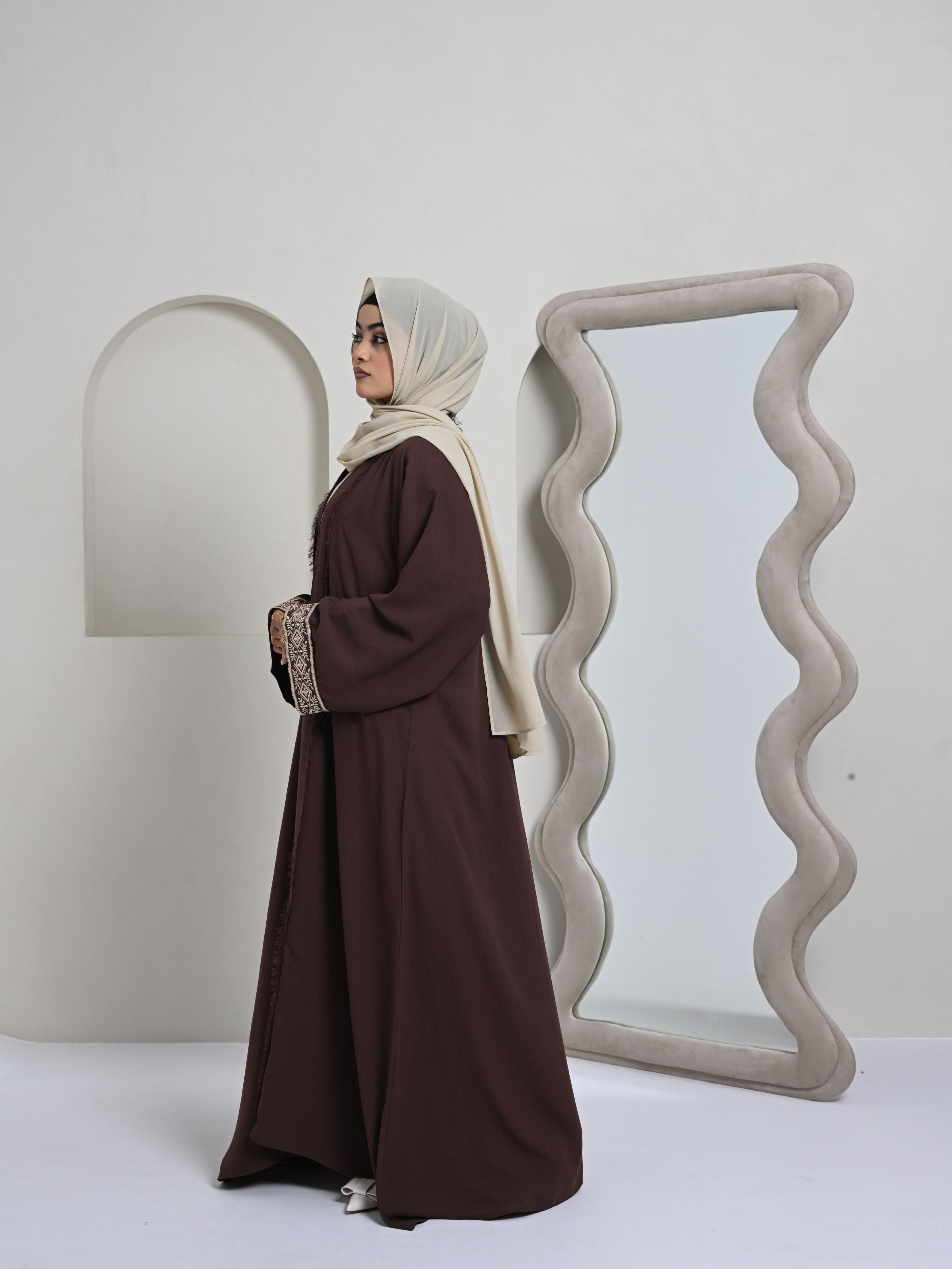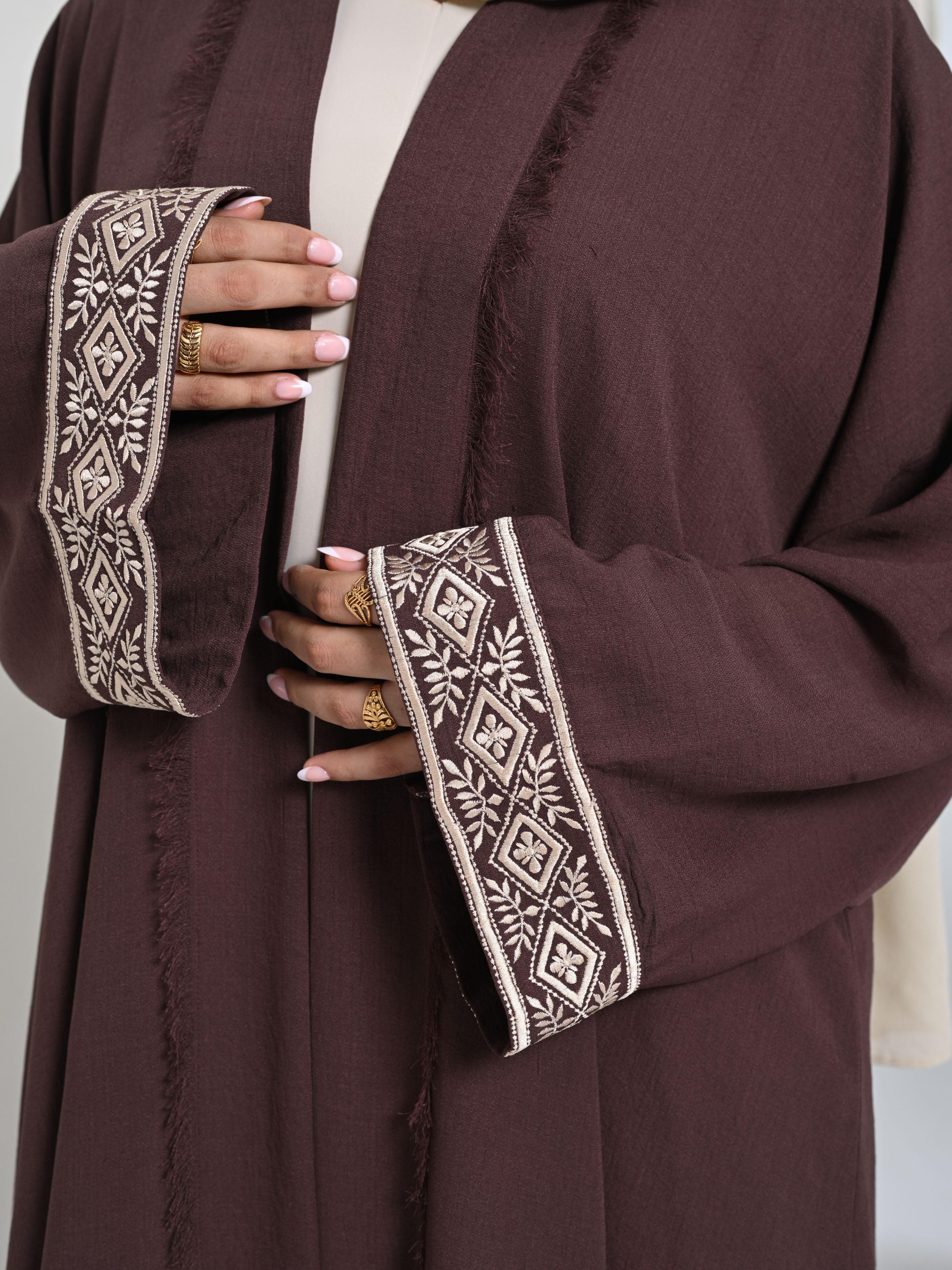 An expressive abaya combining embroidered lace with soft fringe movement.