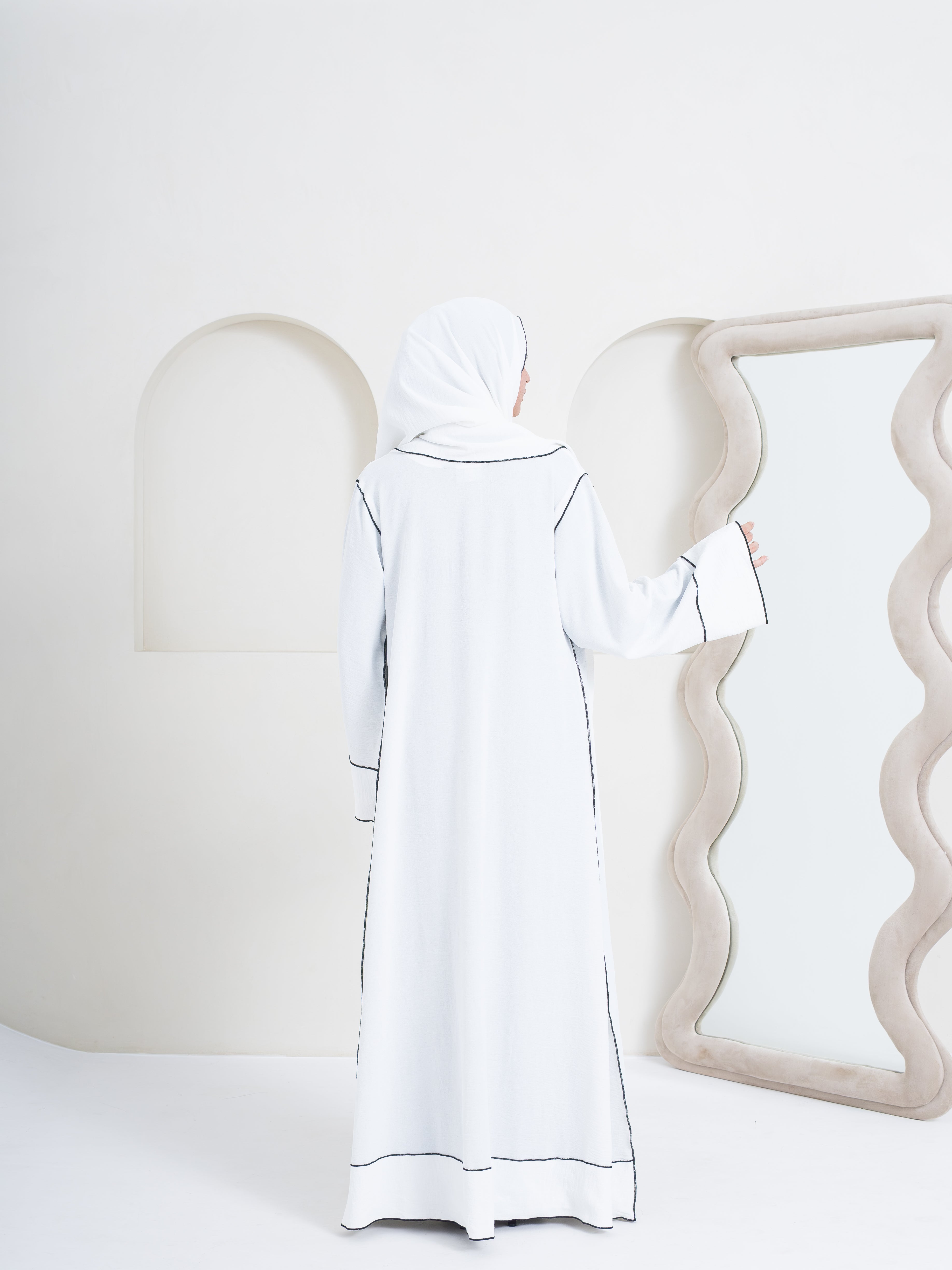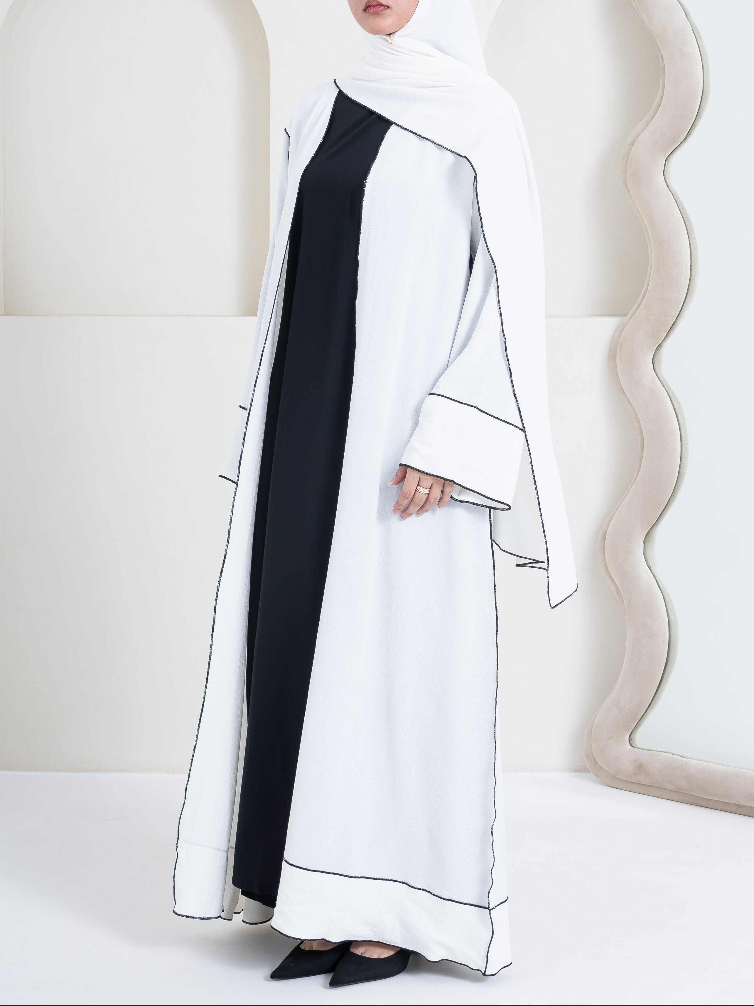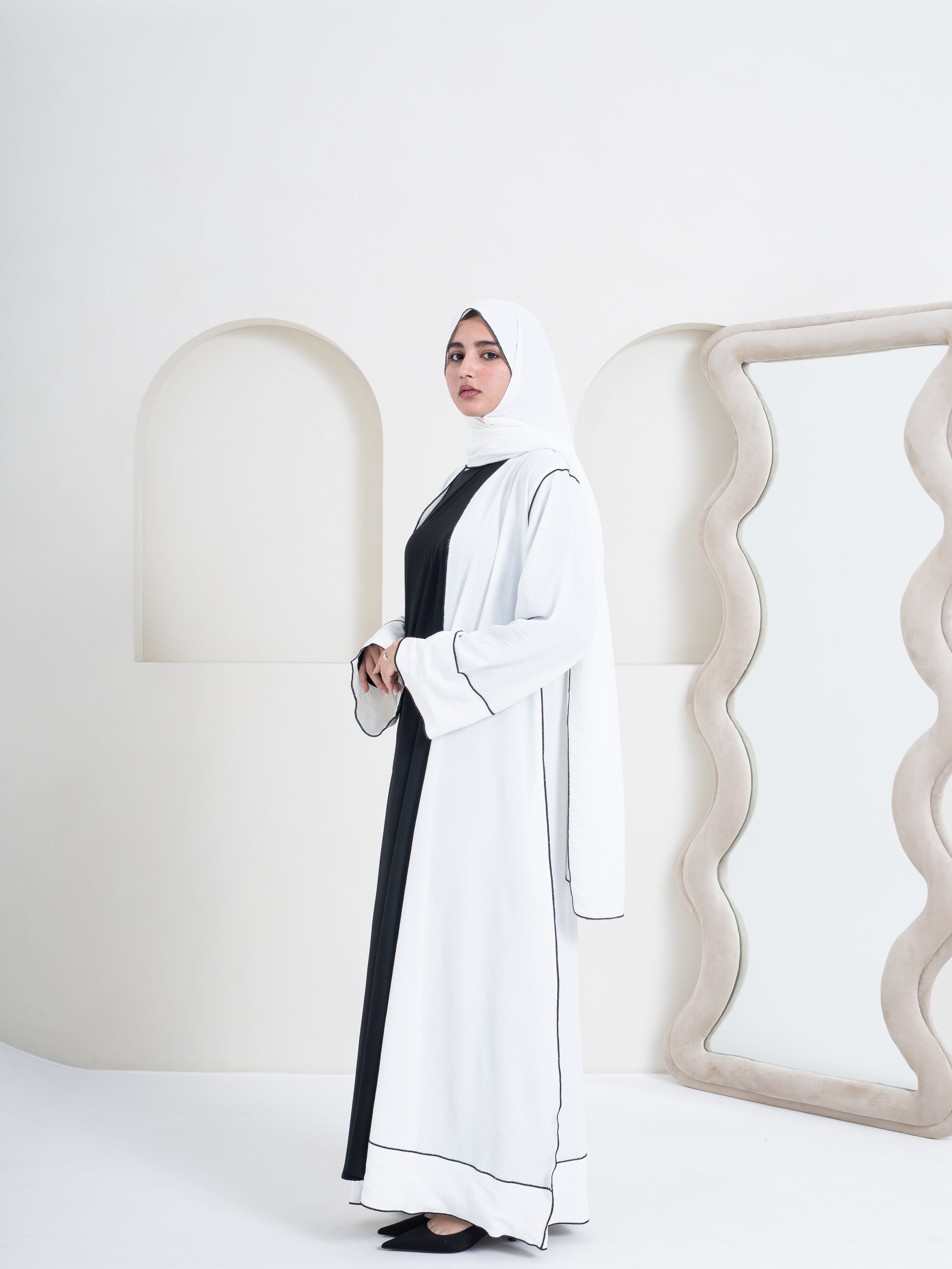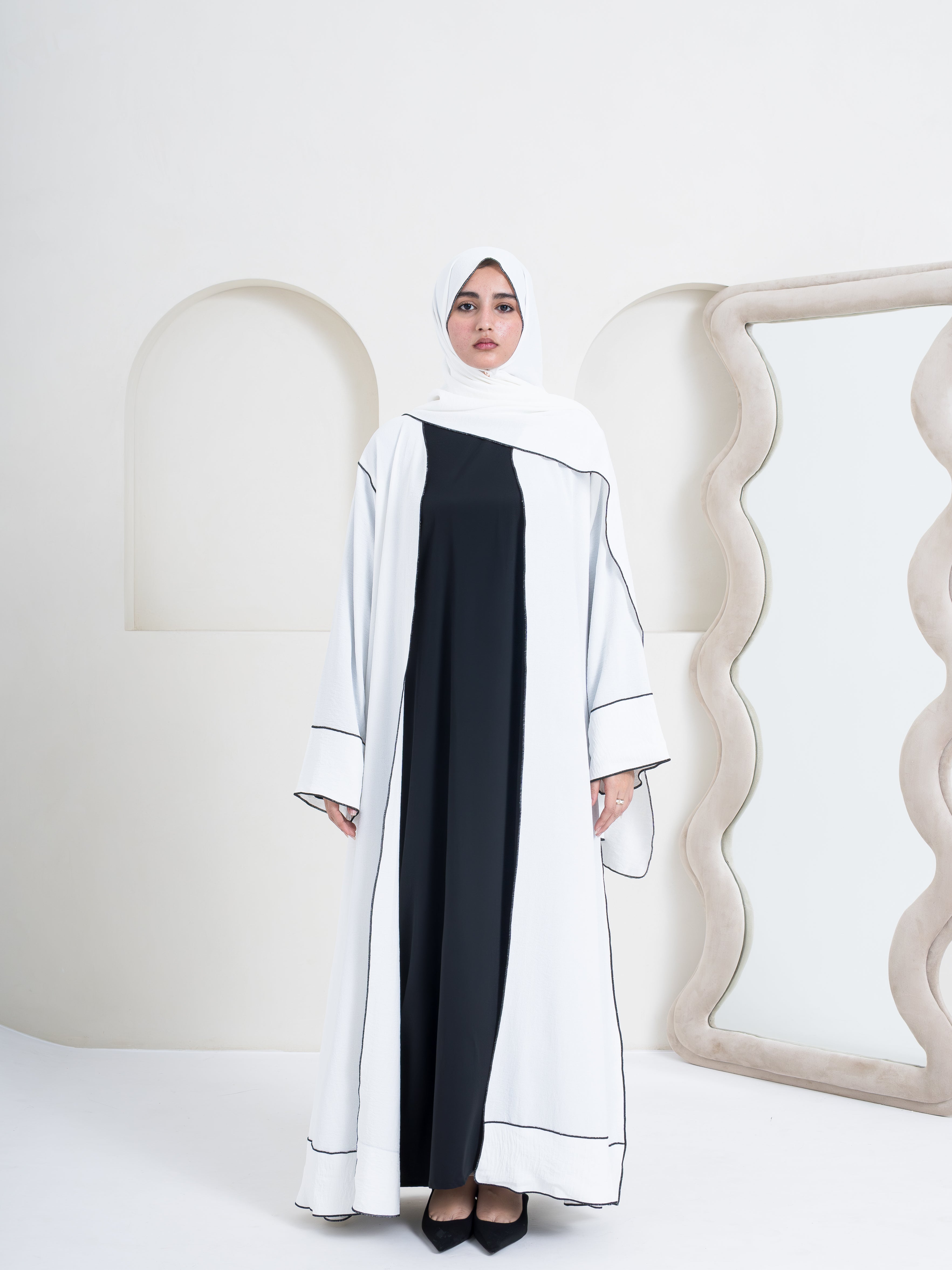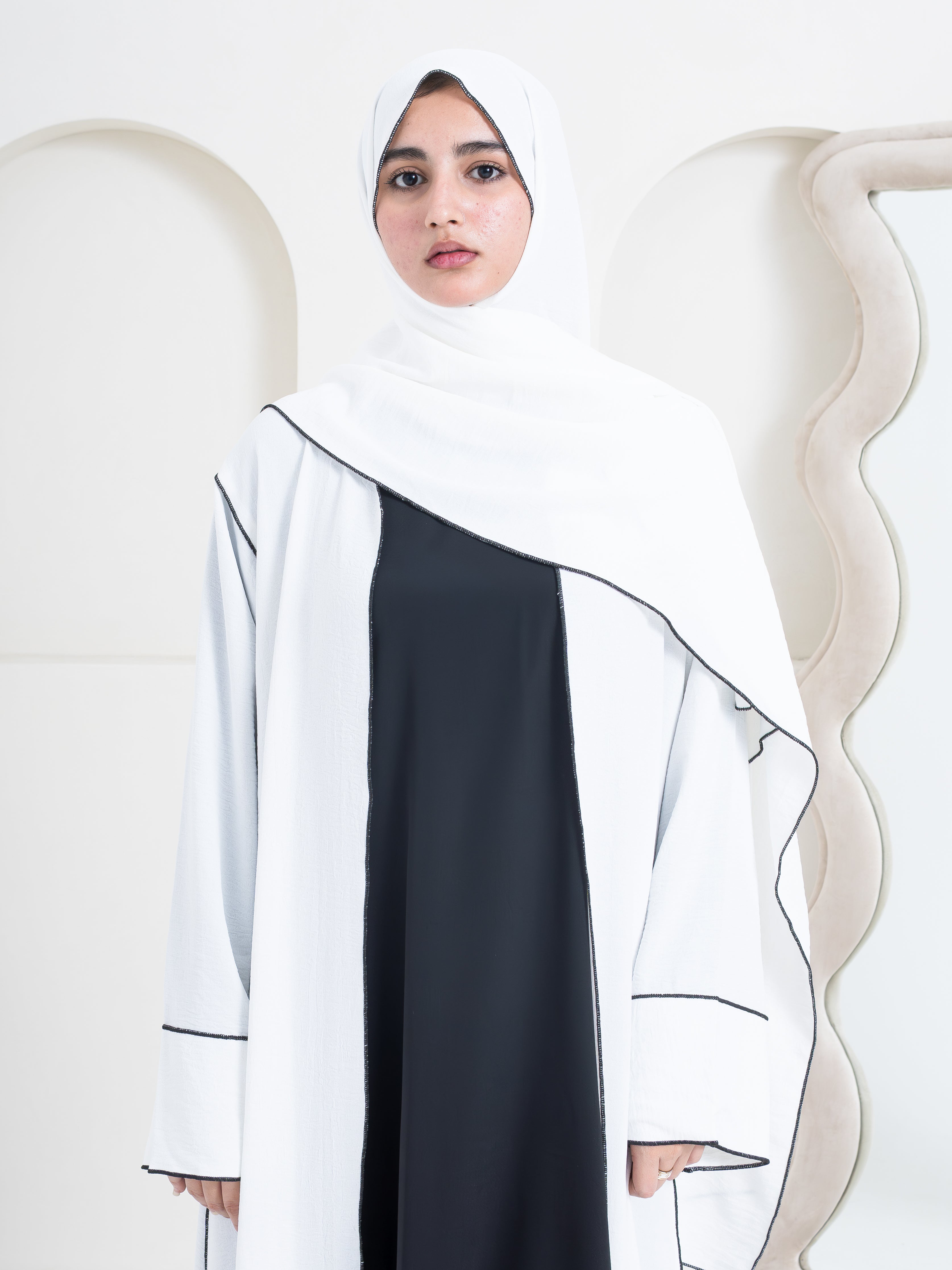 The Lihaf Abaya is a timeless expression of elegance and versatility. Designed as an open abaya, it drapes beautifully, creating a fluid and graceful silhouette. Paired with a matching hijab, it offers a refined yet effortless look, perfect for layering over any outfit