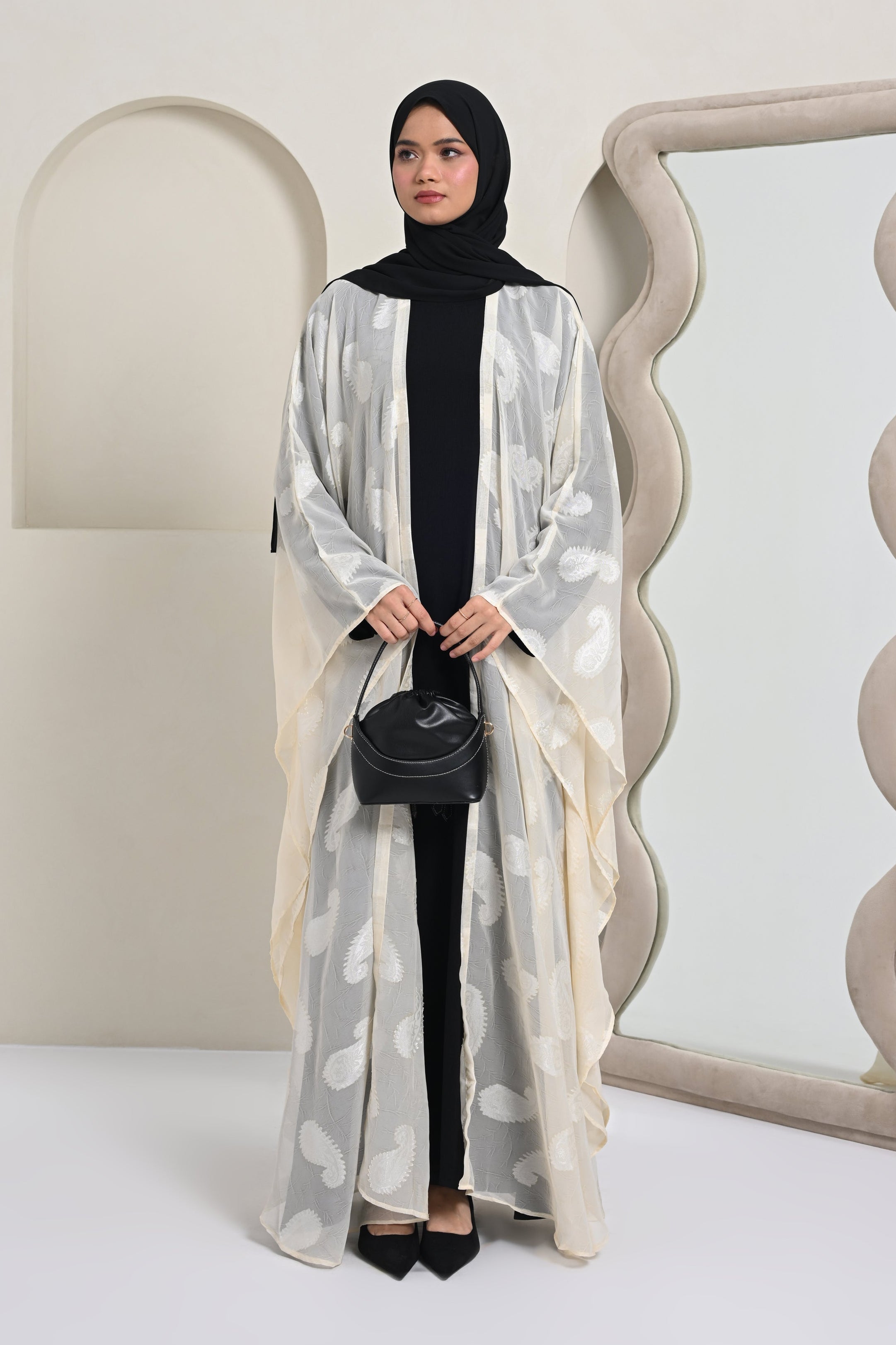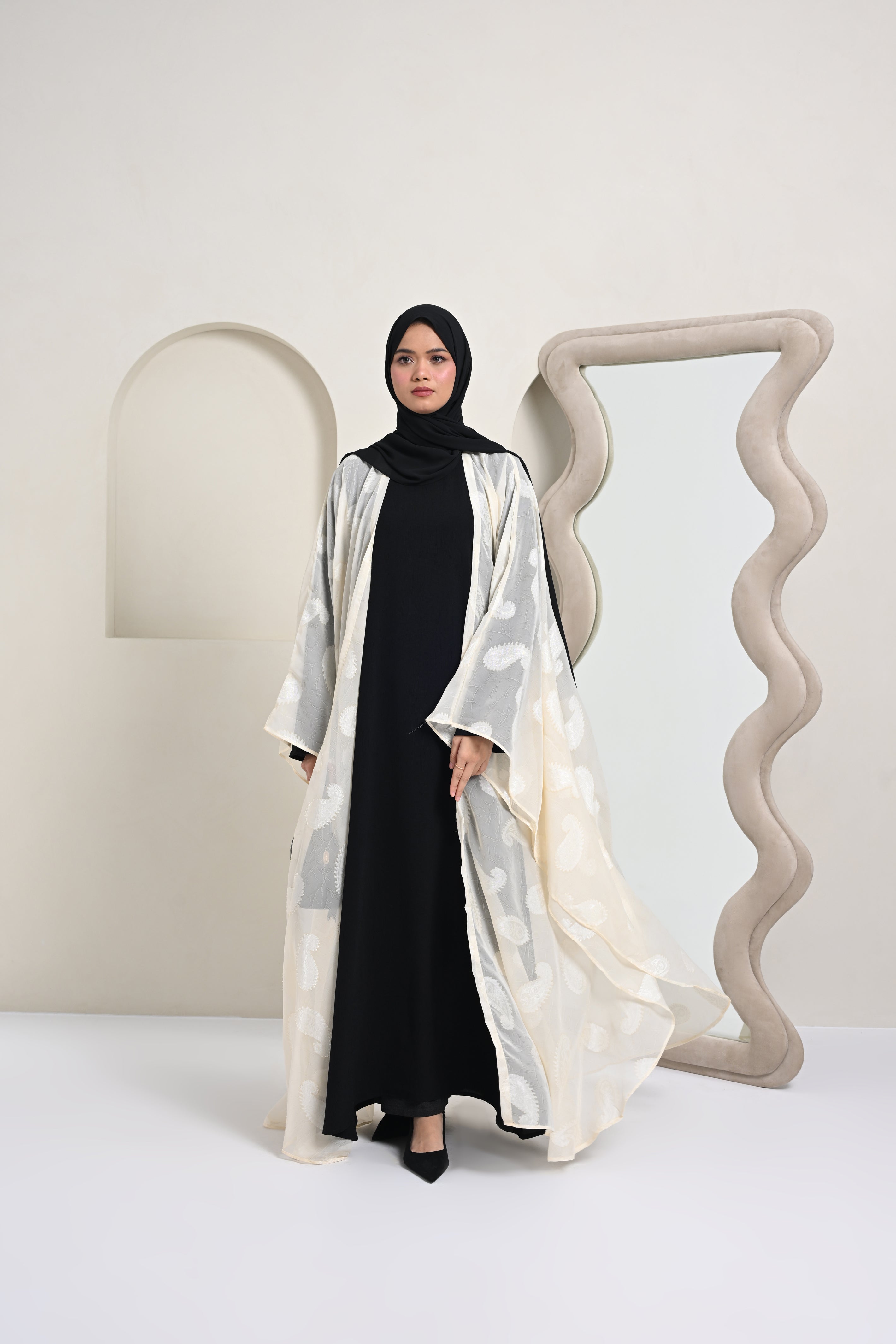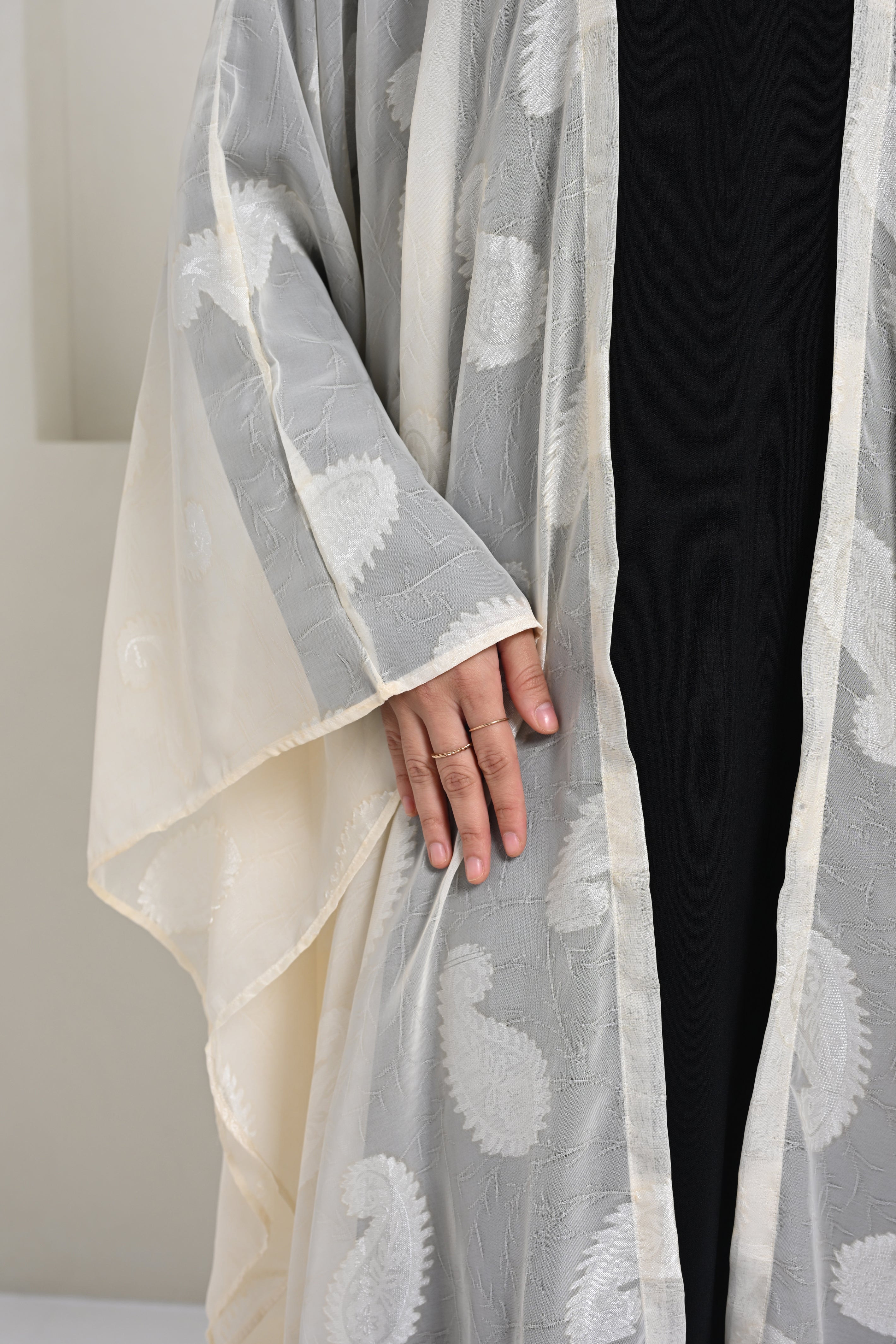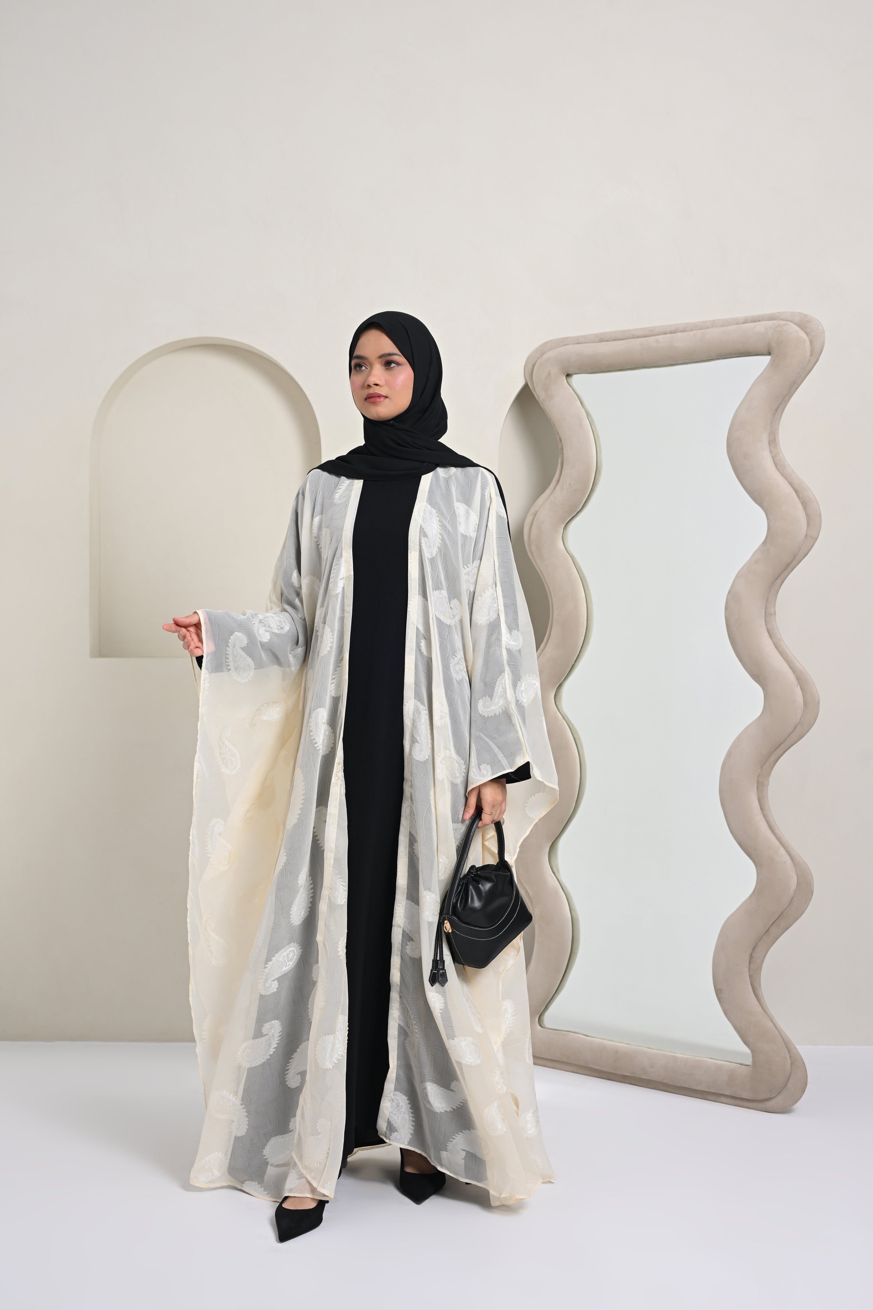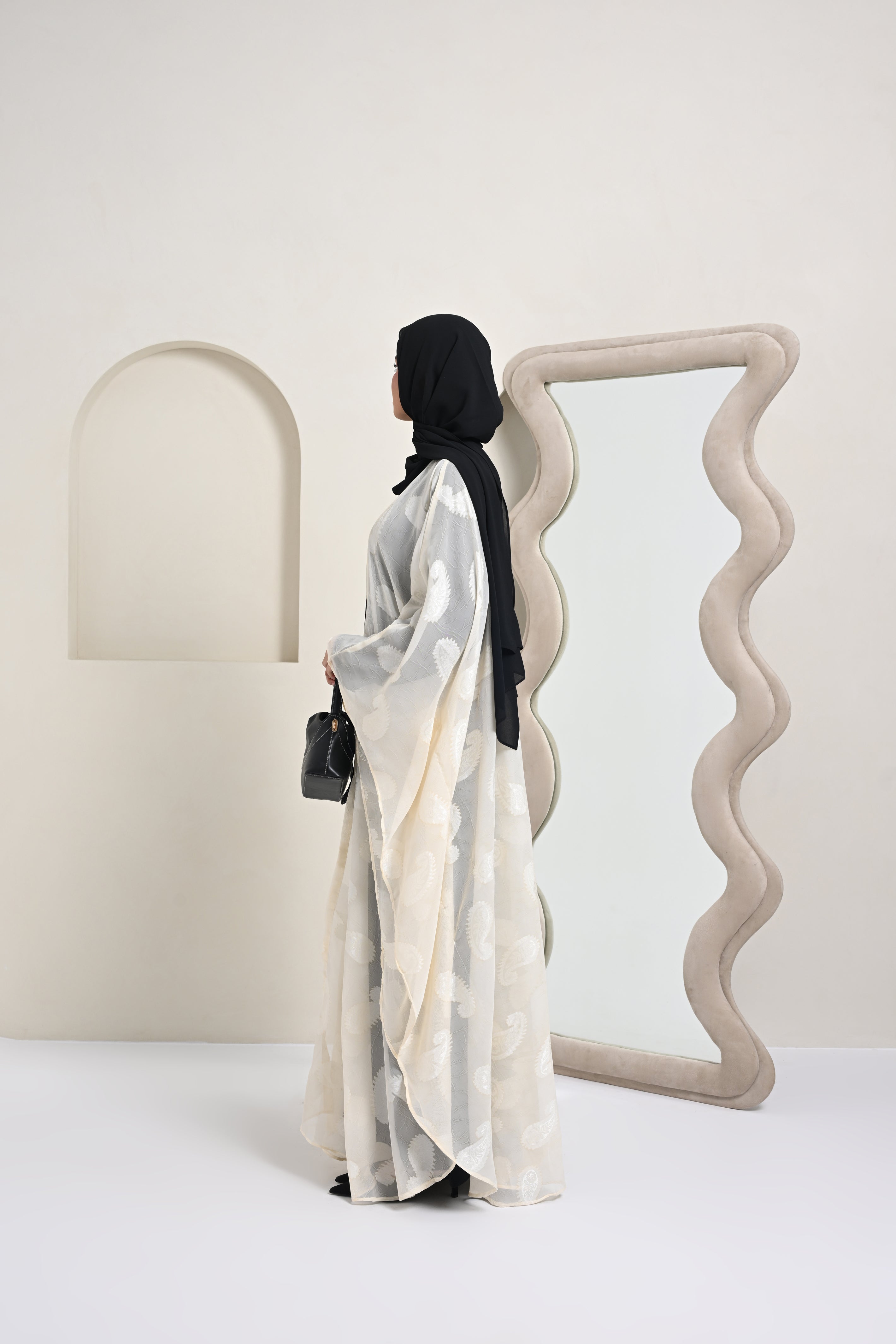 A statement abaya featuring an intricate paisley print with a soft, graceful drape.