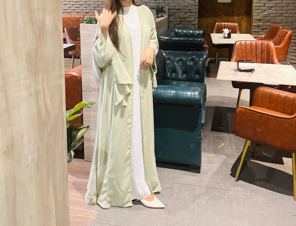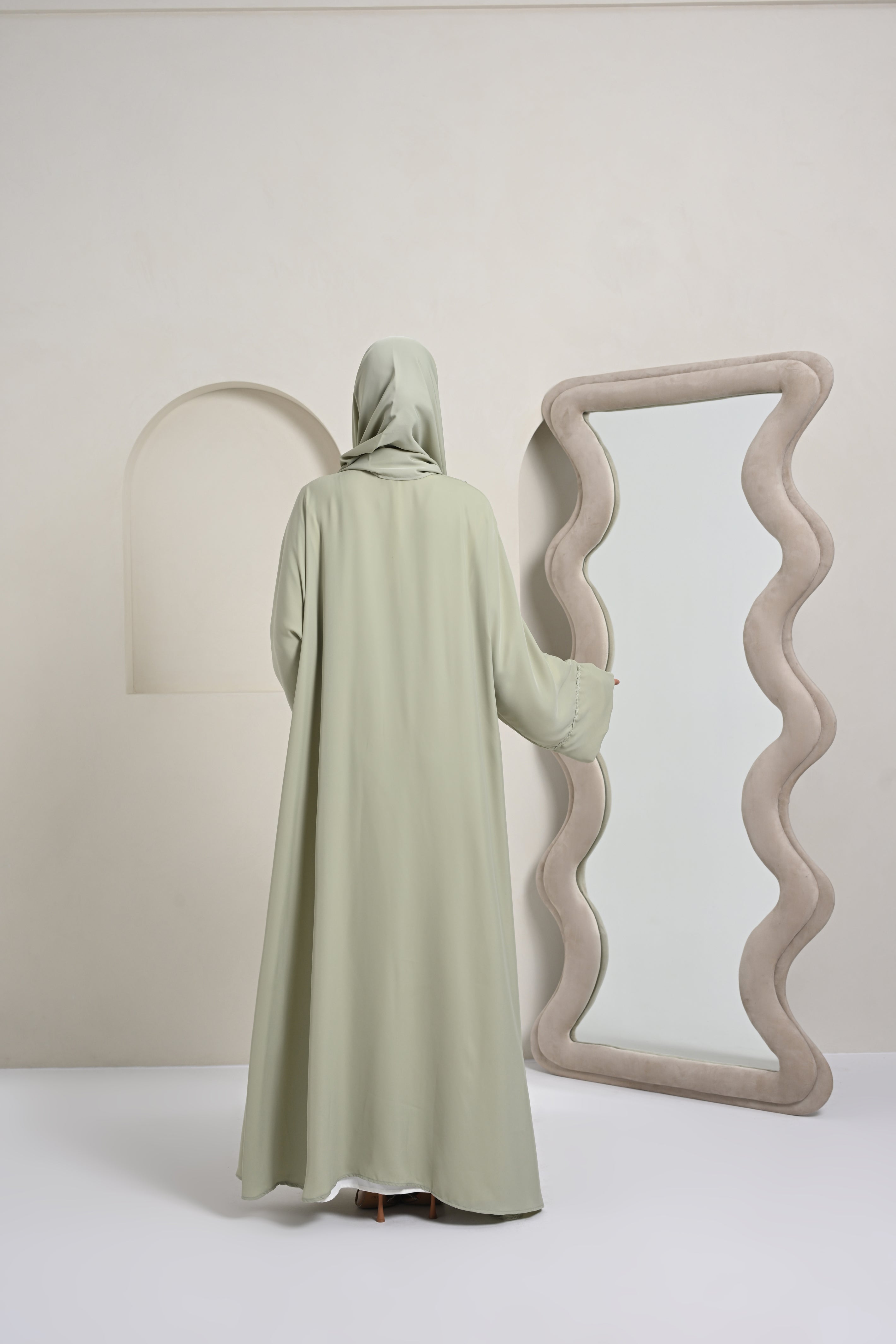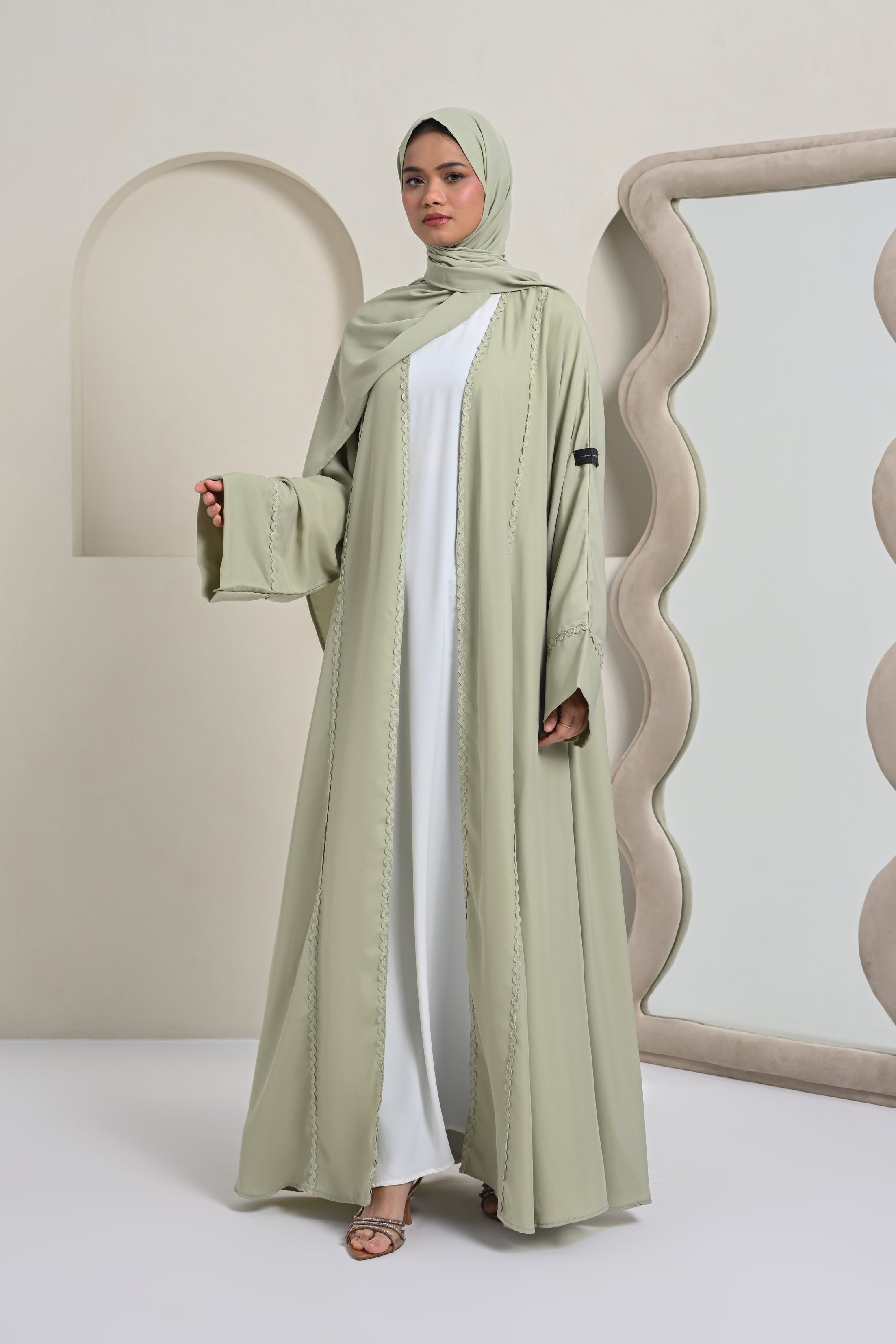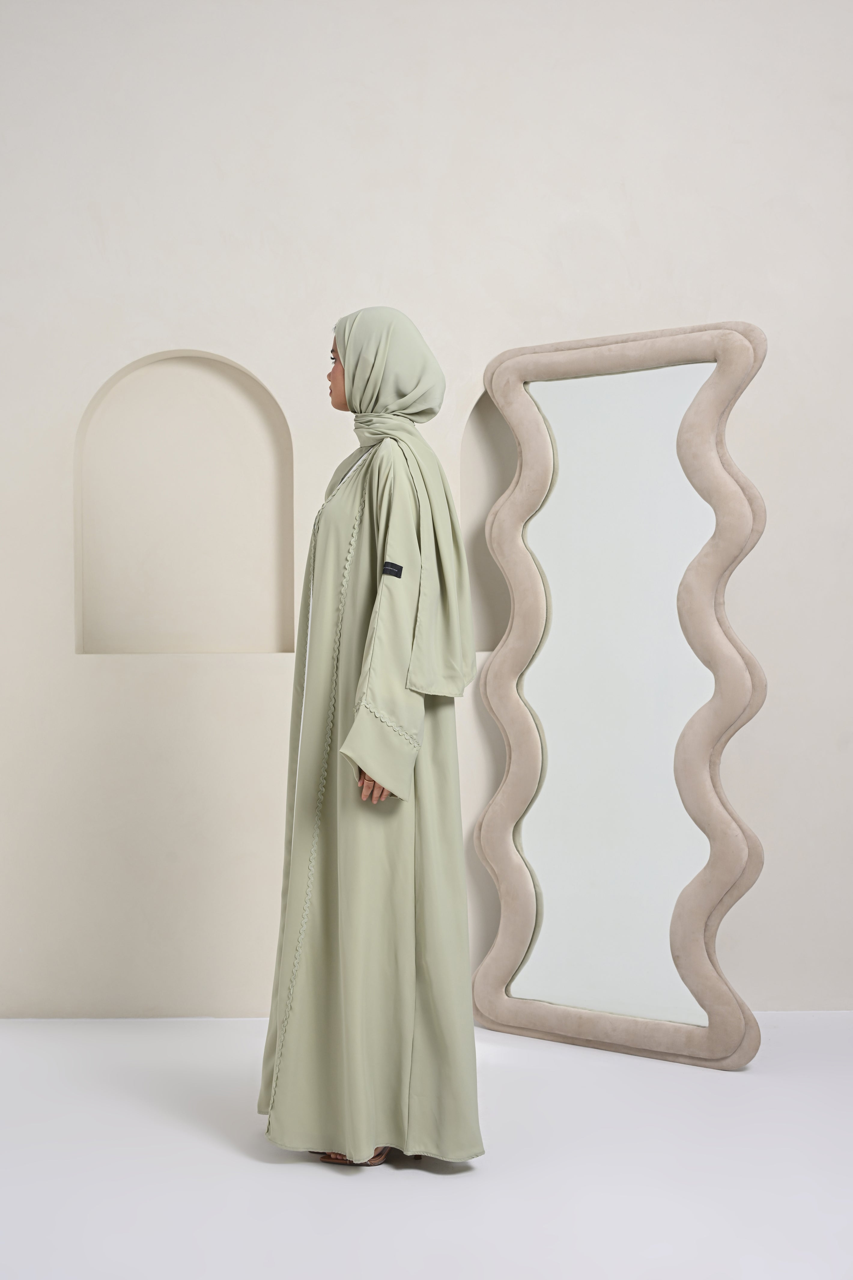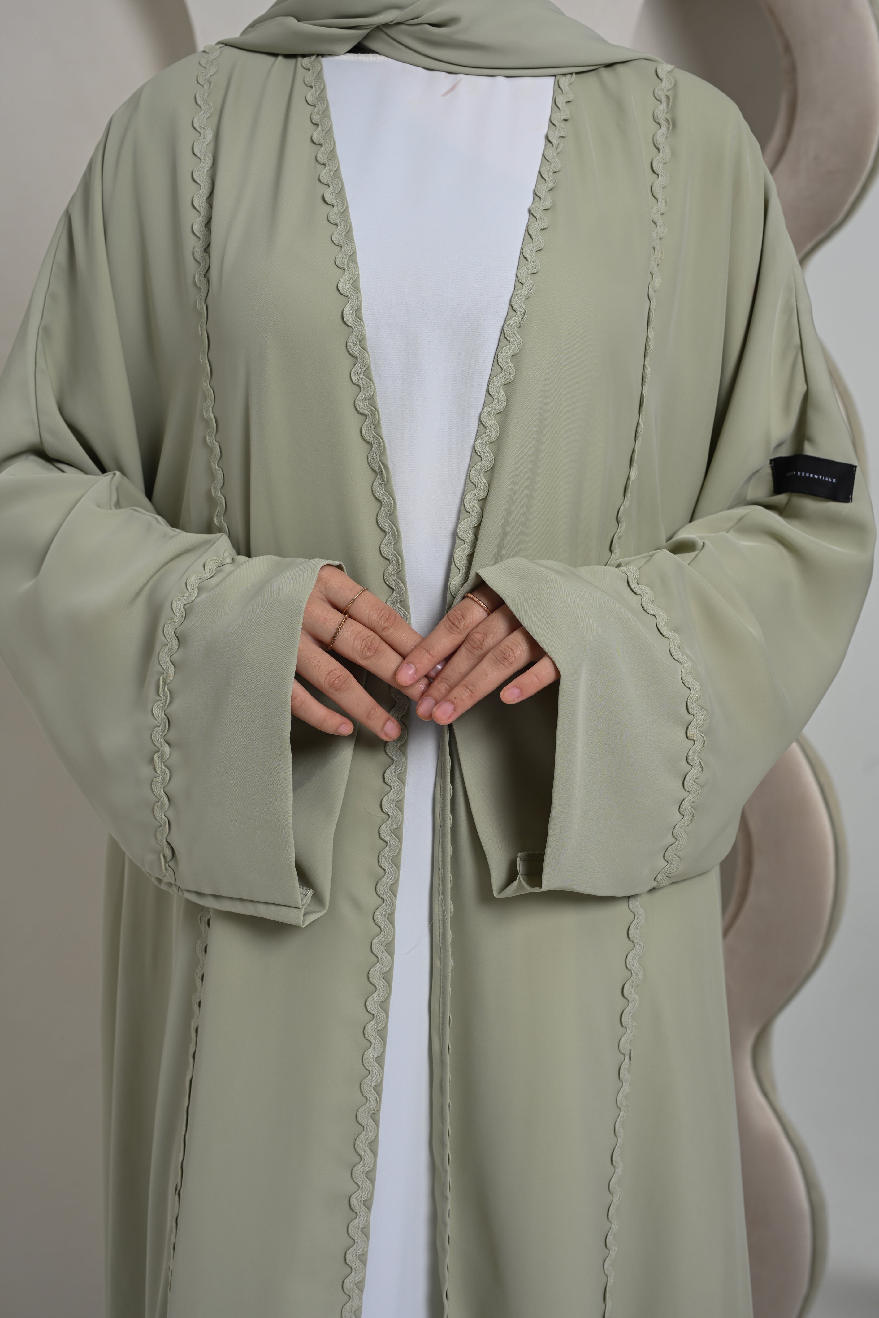 An elegant abaya highlighted with intricate swirl lace detailing.