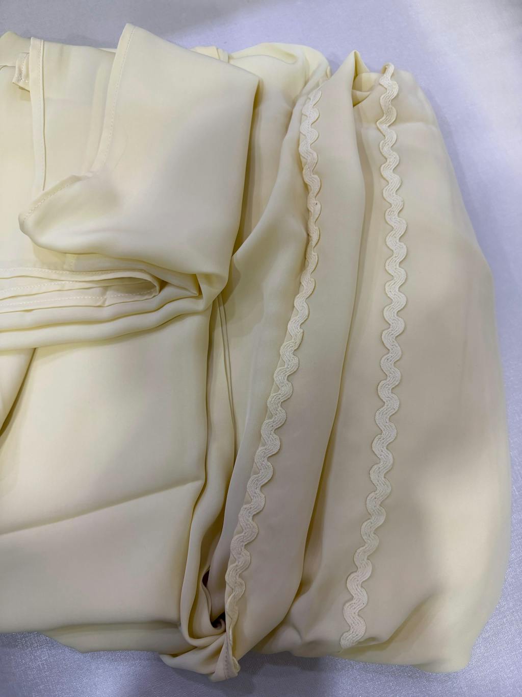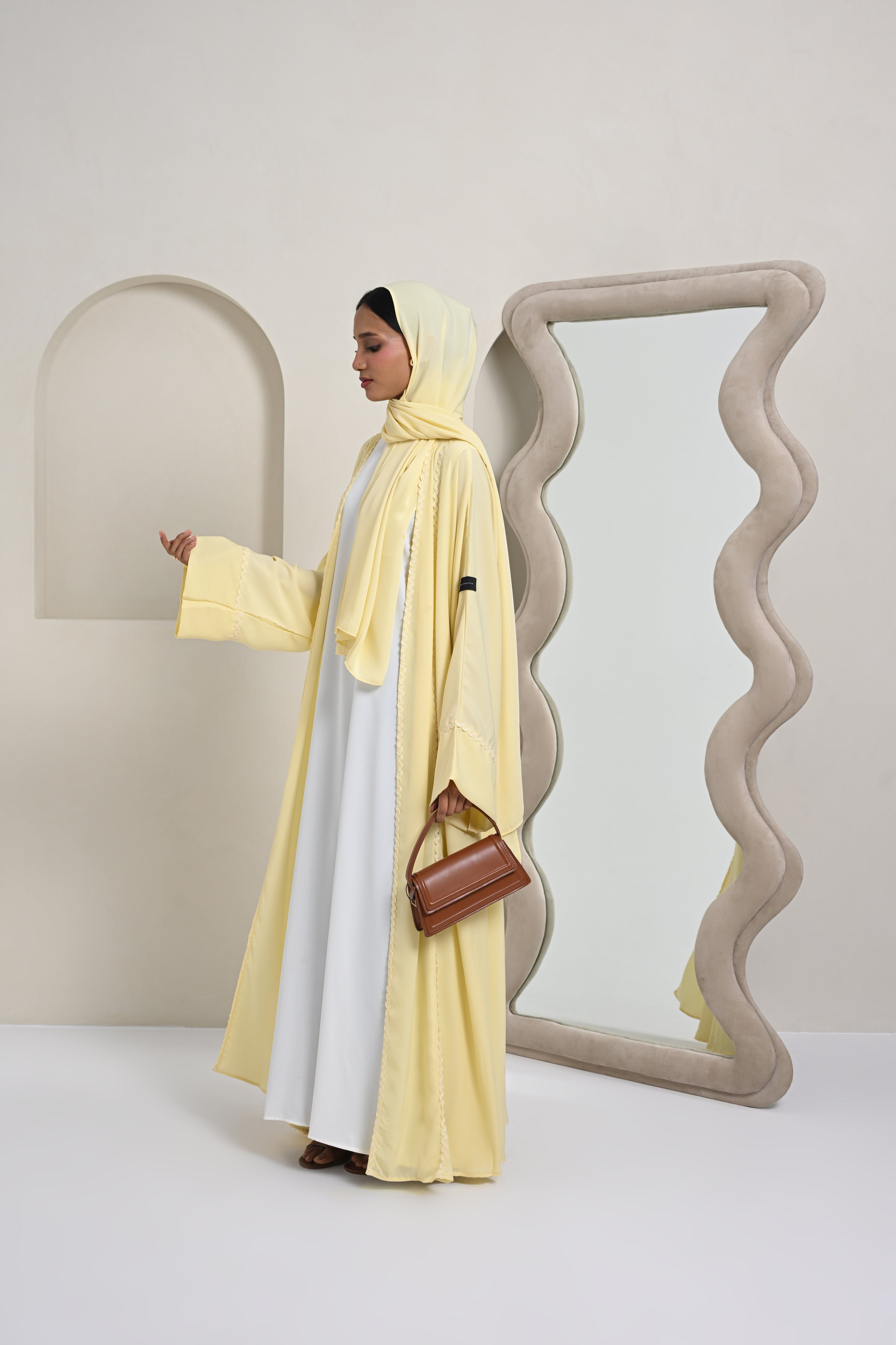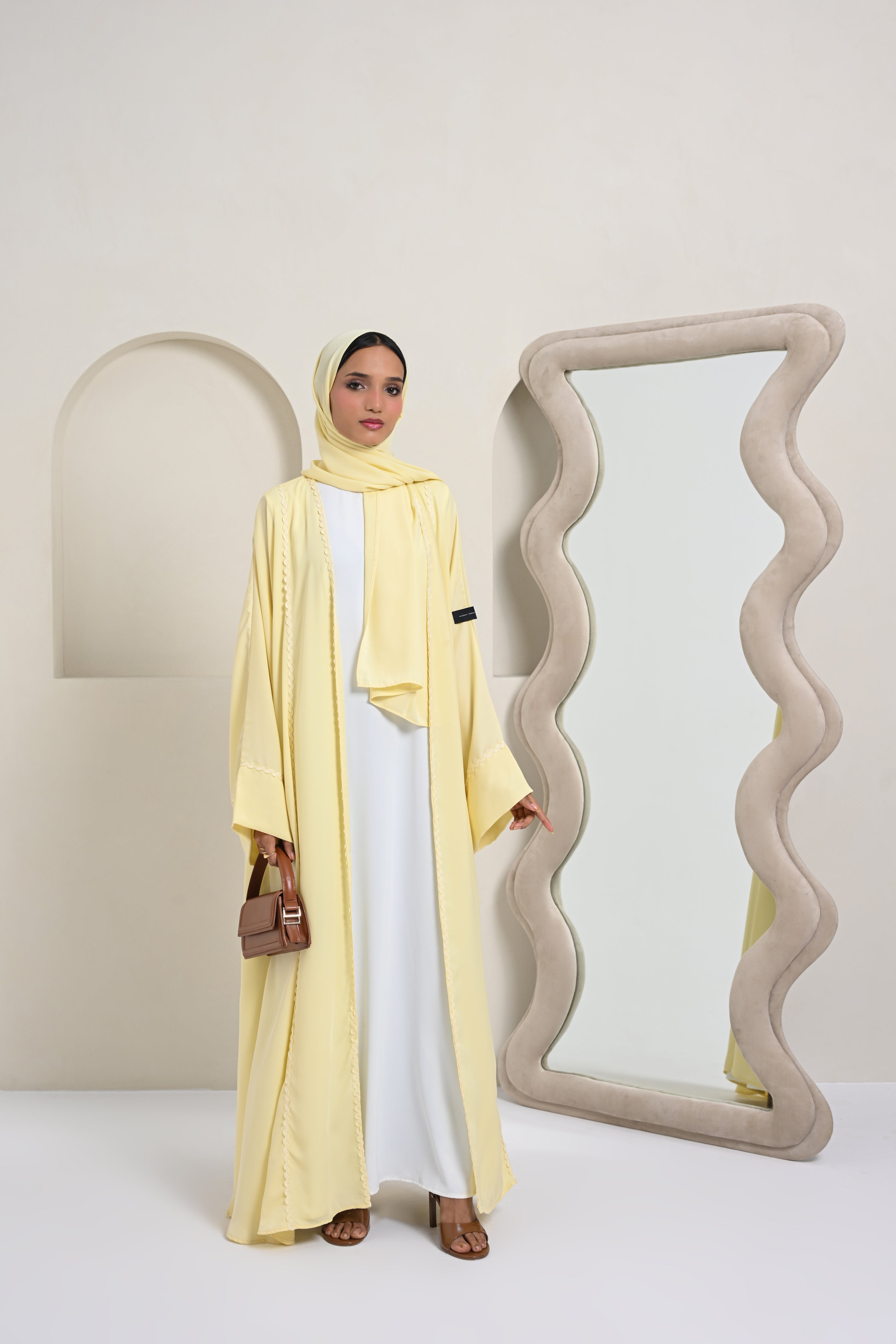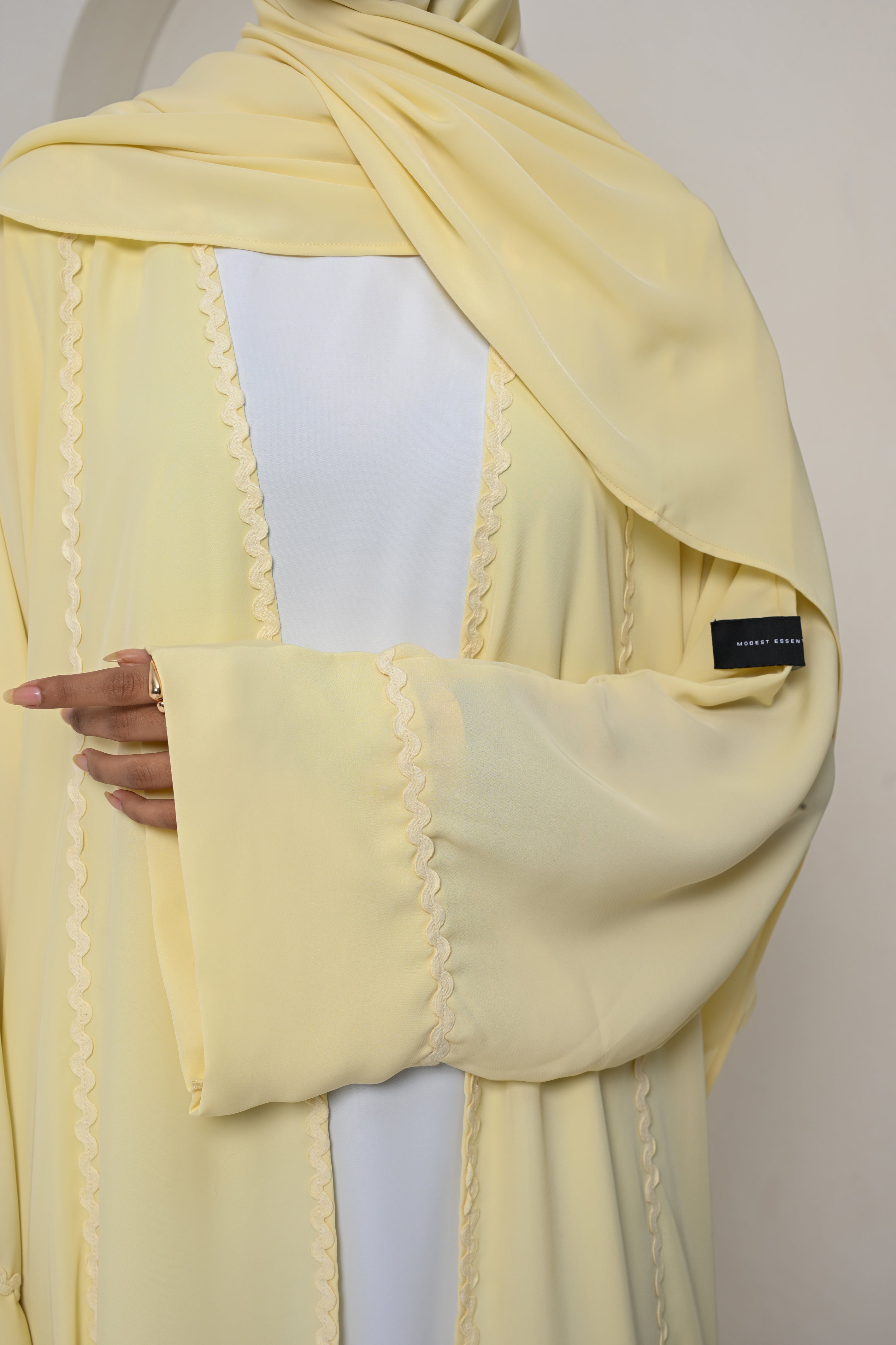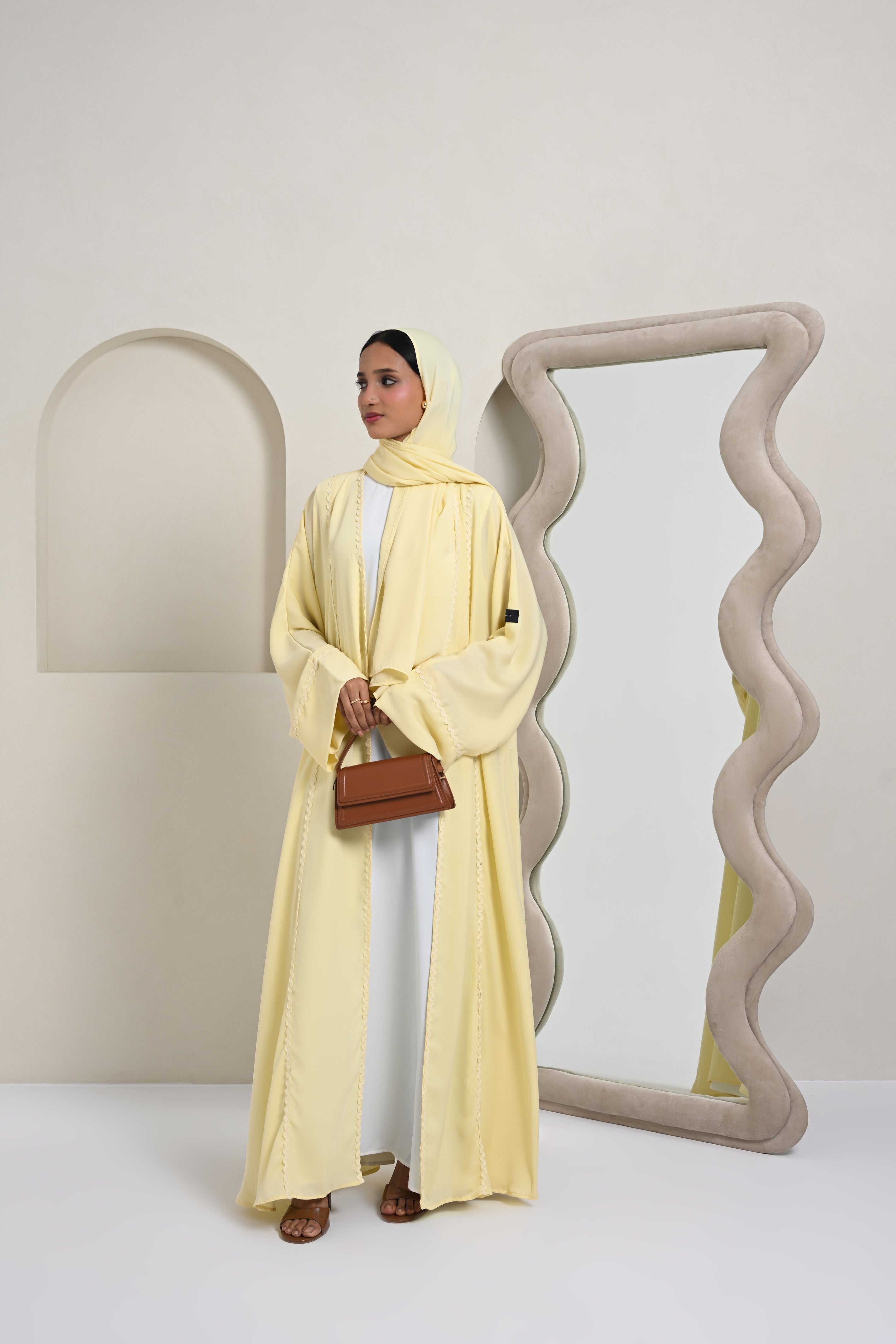 An elegant abaya highlighted with intricate swirl lace detailing.