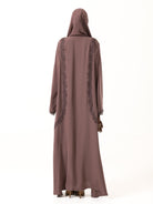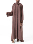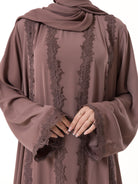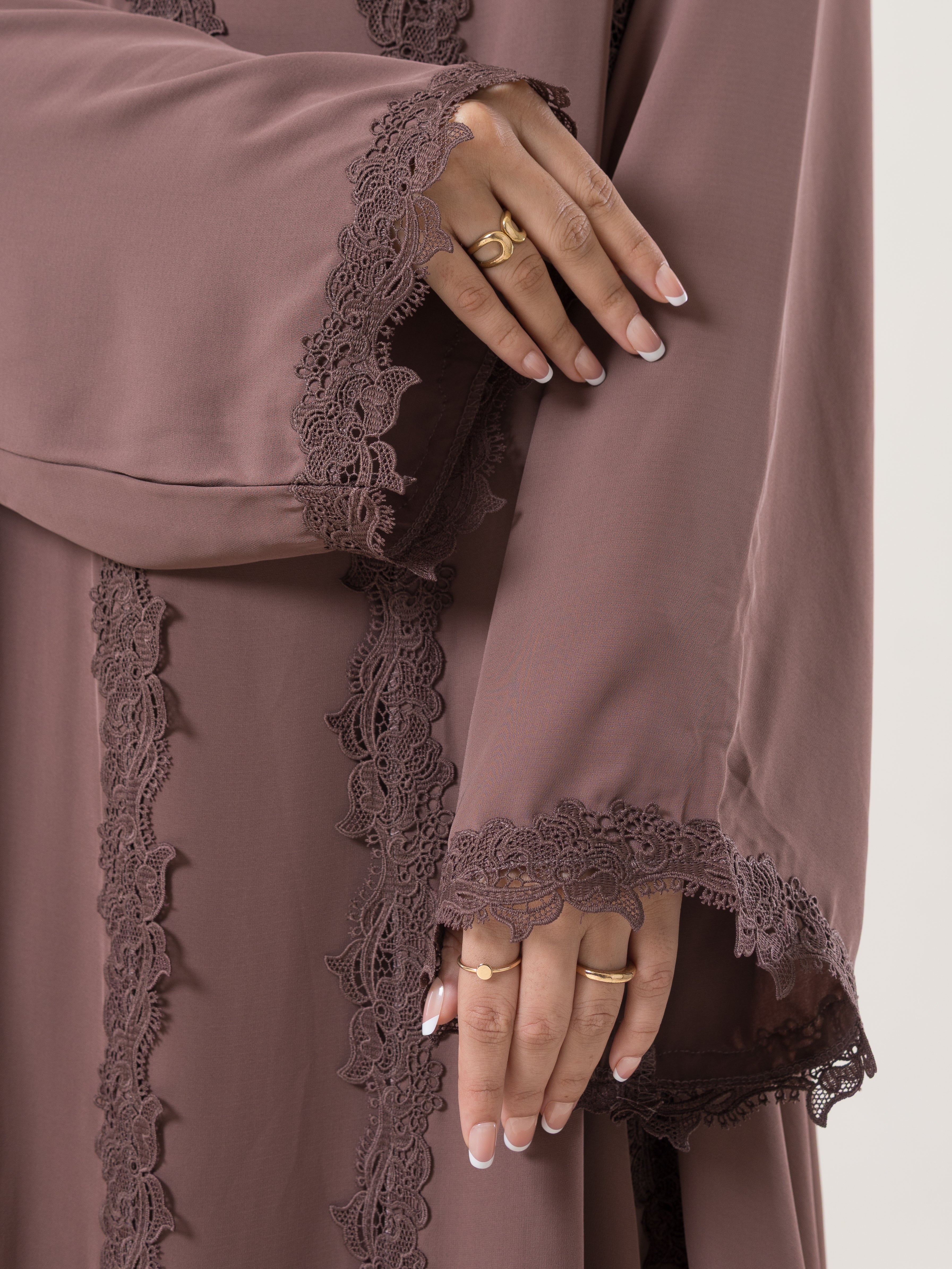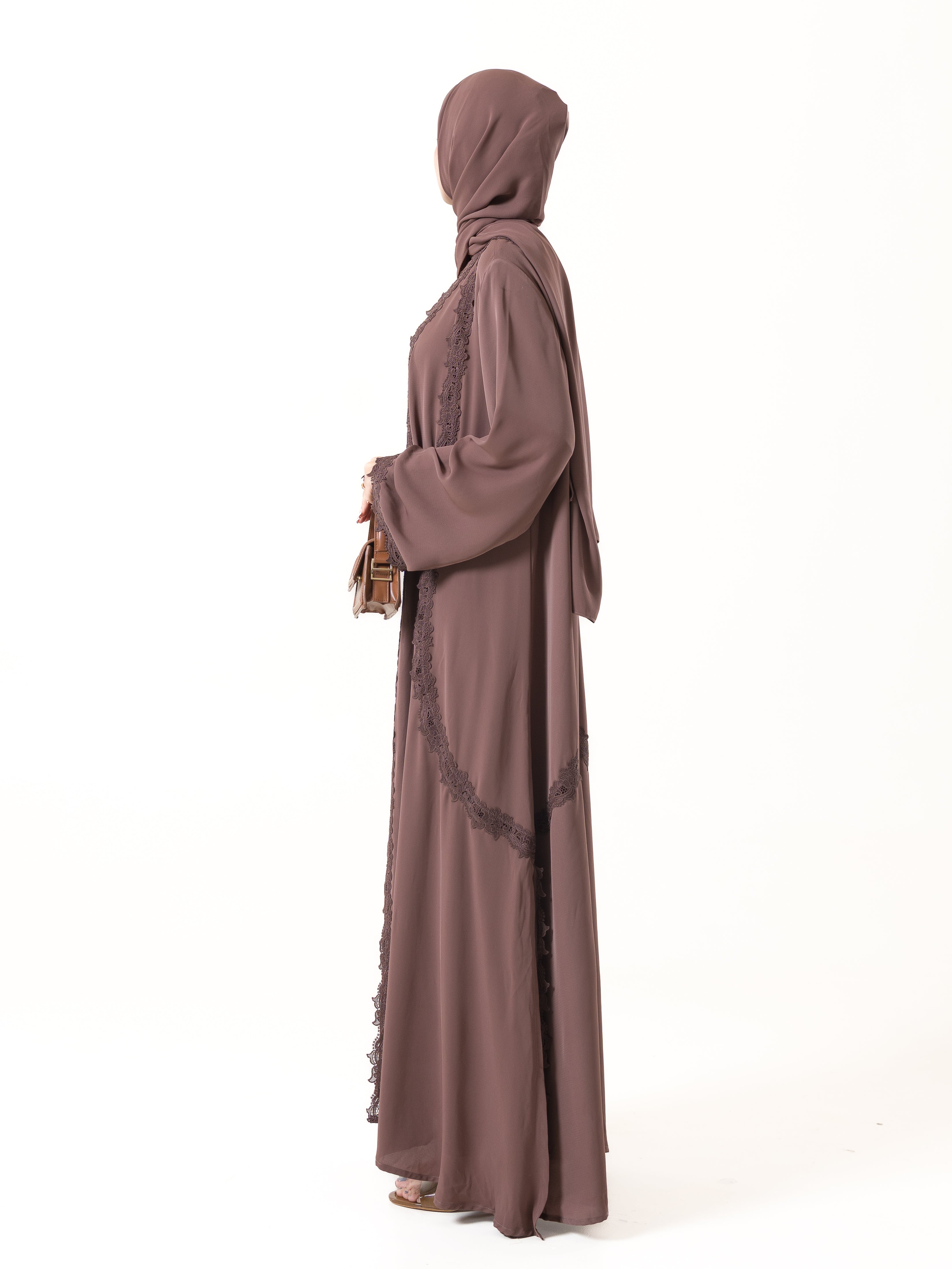 The Fathma Two-Piece Abaya blends sophistication and grace with delicate lace detailing along the borders. Crafted from luxurious Goya silk, it comes with a matching inner and hijab for a complete, refined look.