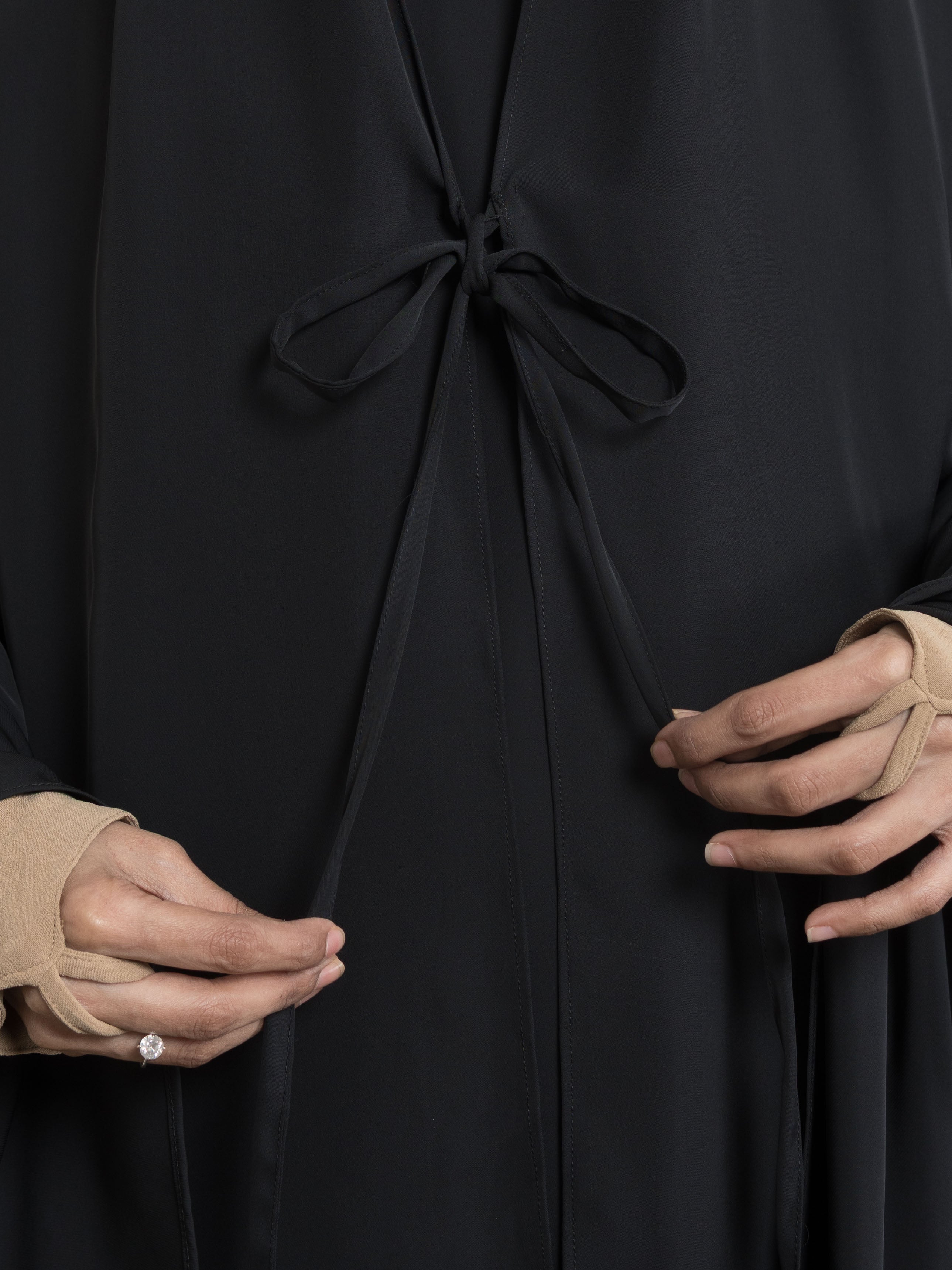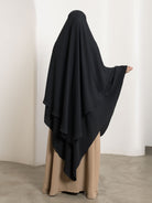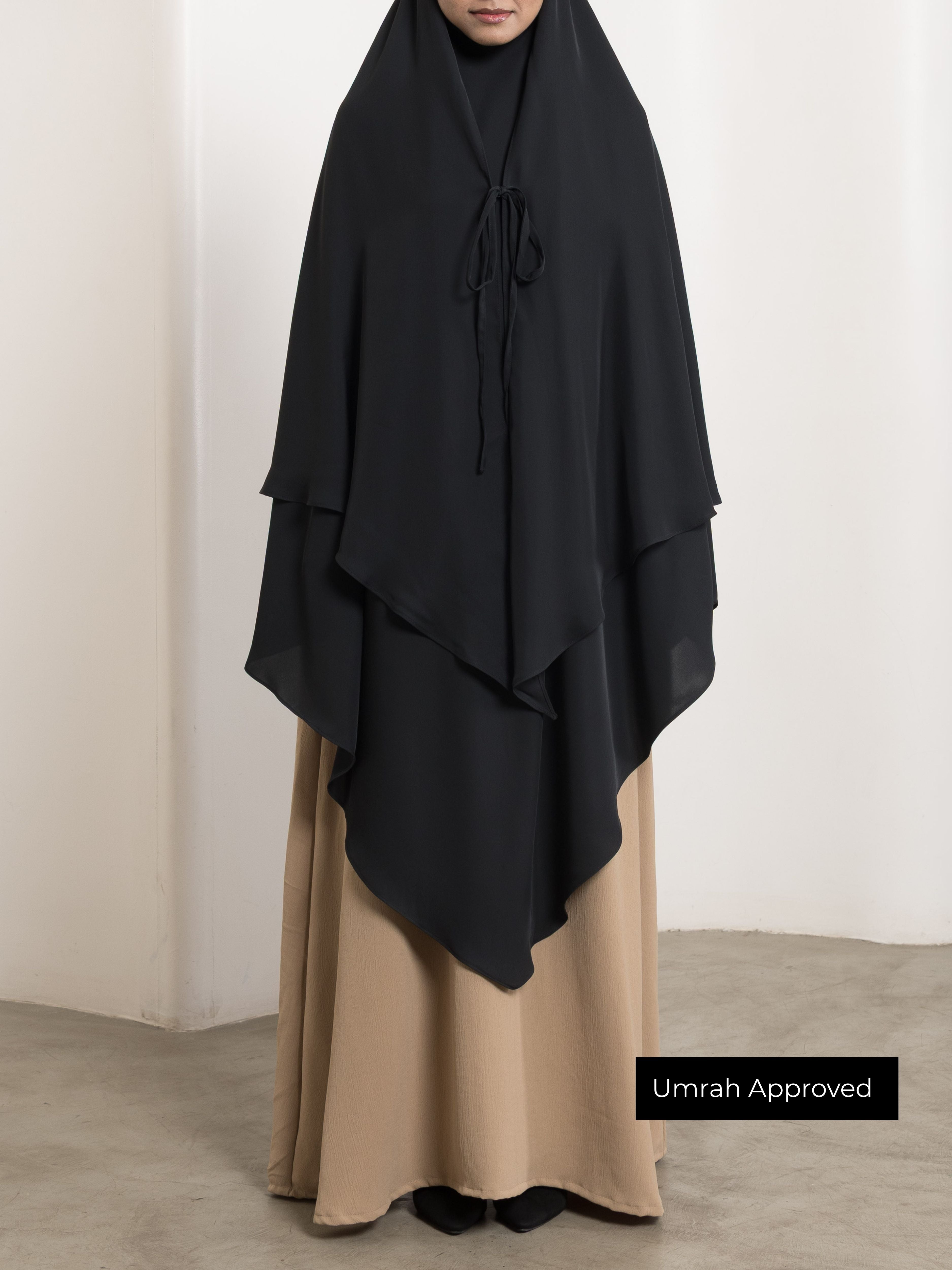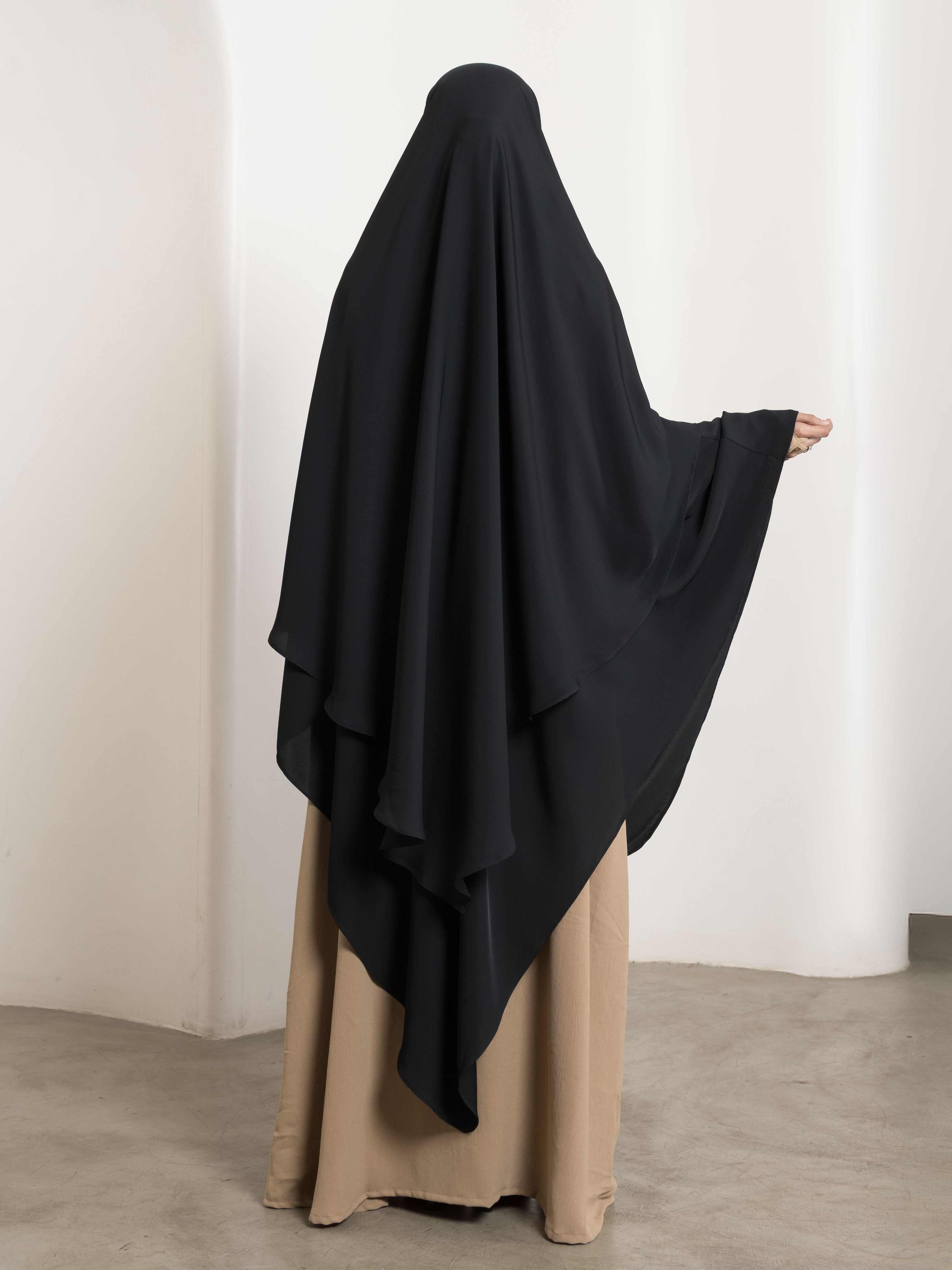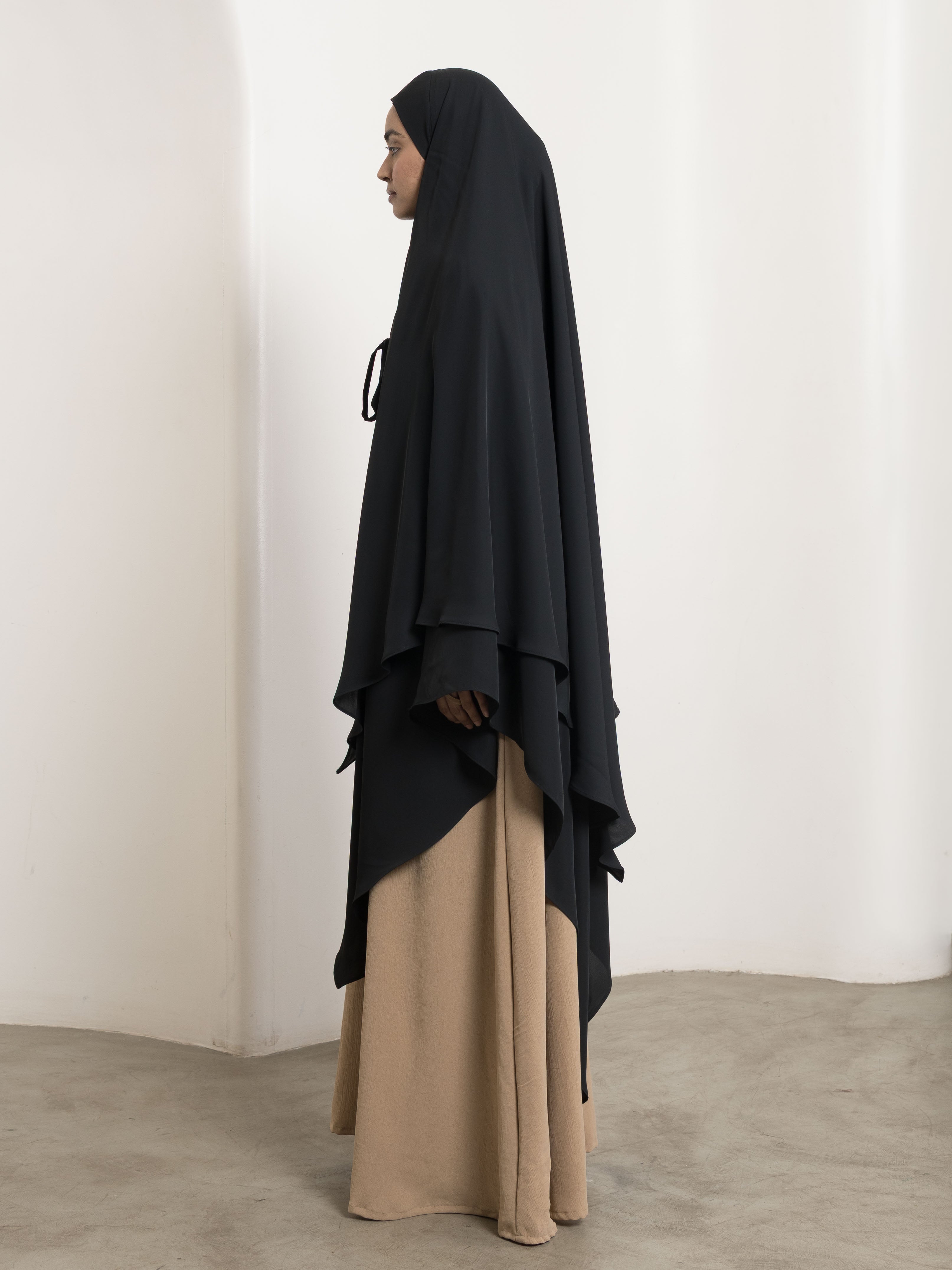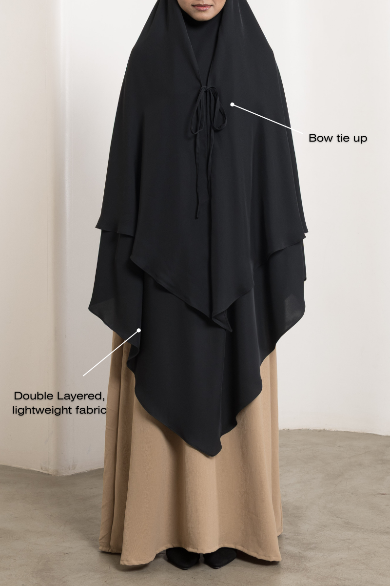 A graceful blend of elegance and modesty — the Bow Khimar features a soft double-layered design that offers extra coverage and flow. The delicate bow tie-up detail adds a feminine touch, while the inner elastic ensures a secure and comfortable fit throughout the day. Perfect for both everyday wear and special occasions.