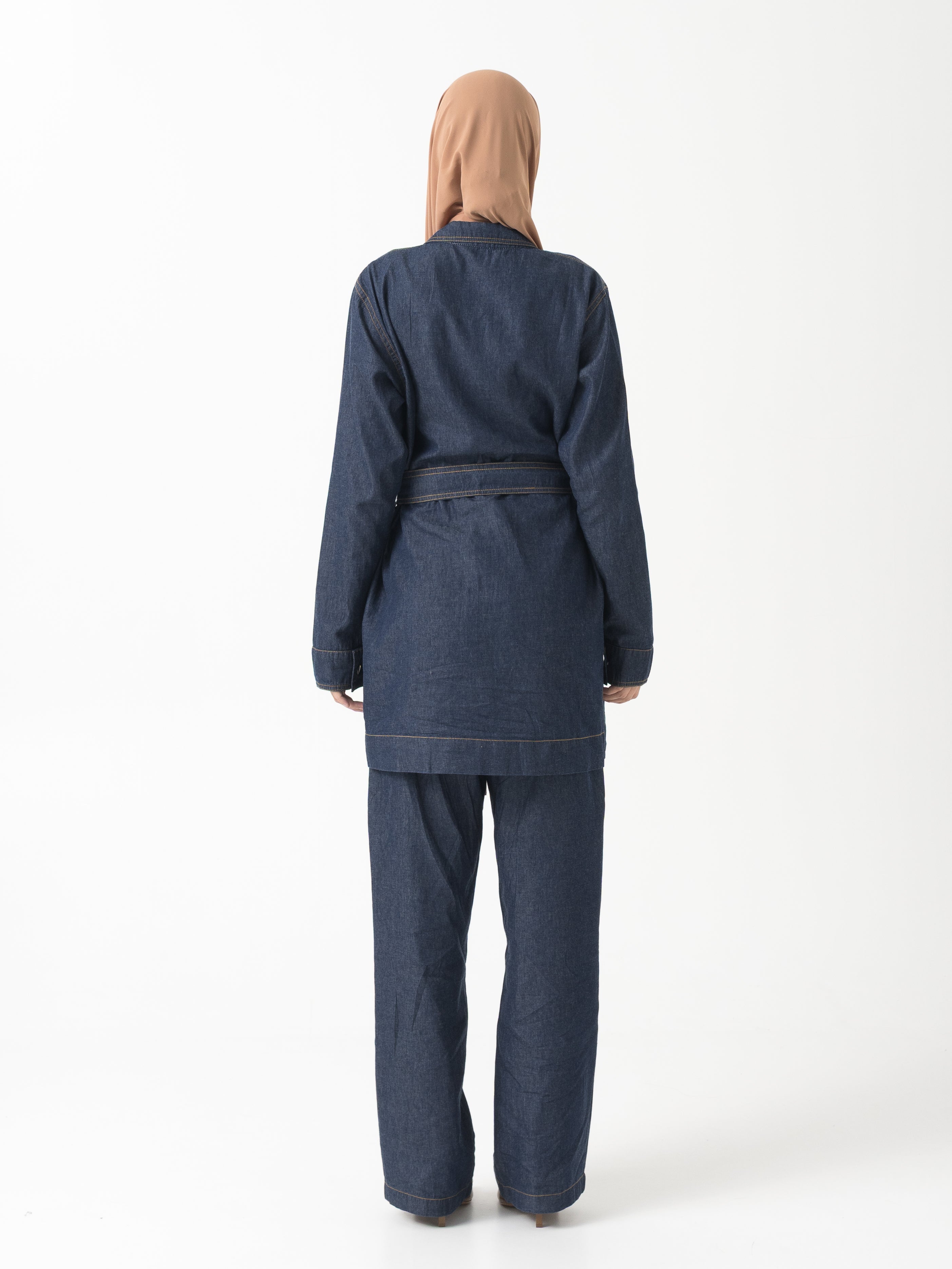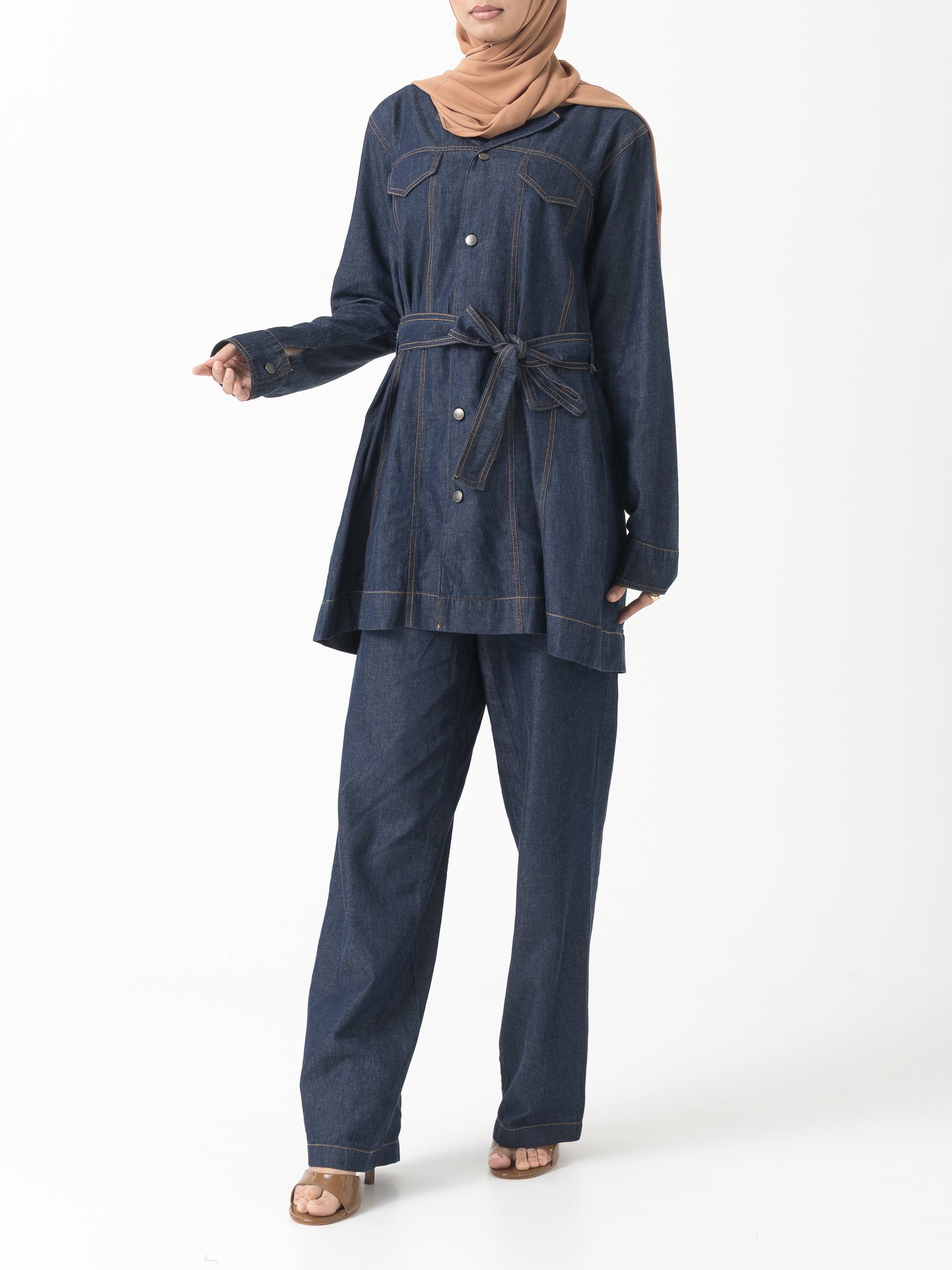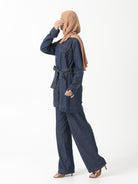 This sophisticated collared top and straight leg pant set delivers effortless elegance in premium lightweight denim that moves with you throughout the day. The thoughtfully designed ensemble includes a matching belt to cinch the waist and create a flattering silhouette, while the modest top length ensures appropriate coverage. Perfect for professional settings or elevated casual wear, this versatile two-piece set combines comfort with polished style.
