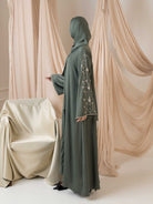 The Nashmia Abaya exudes elegance with its full sleeves adorned with delicate cutdana work and a classic button-down front. Paired with a matching hijab, it's perfect for Eid and minimal yet special occasions.
