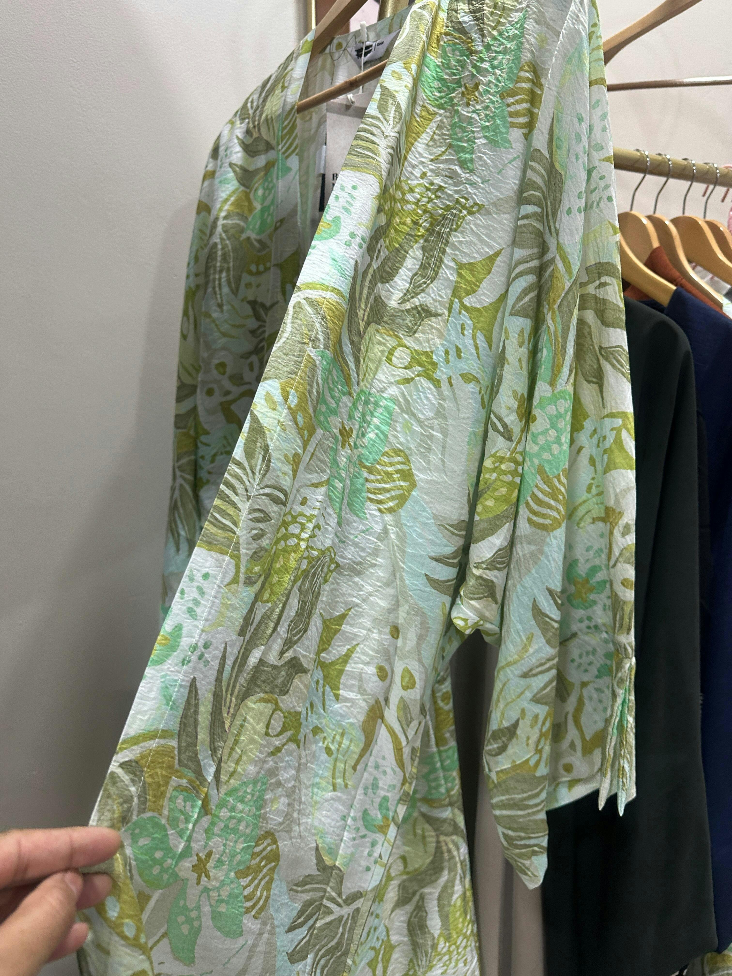 - Open-front shrug style with whimsical nature-inspired prints
