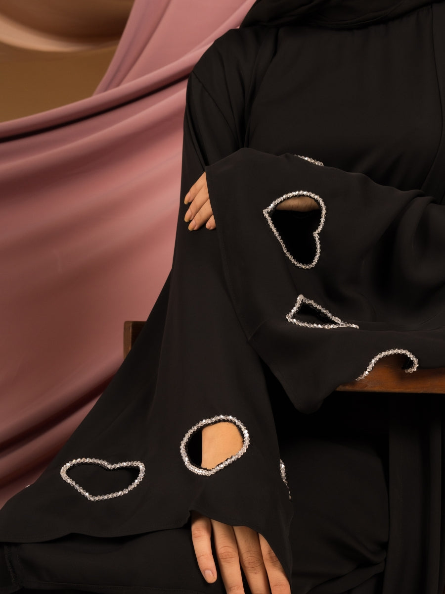 Naila Embroidered Abaya, a stylish and Pinterest-worthy ensemble that combines elegance, charm, and modesty. Naila Embroidered Abaya comes with a matching inner for complete coverage and comfort, while the outer abaya features intricate heart-shaped cutwork and embroidery on the sleeves, along with a beautifully embroidered single heart on the back. These delicate details add a unique touch to the design, making it both classy and eye-catching.