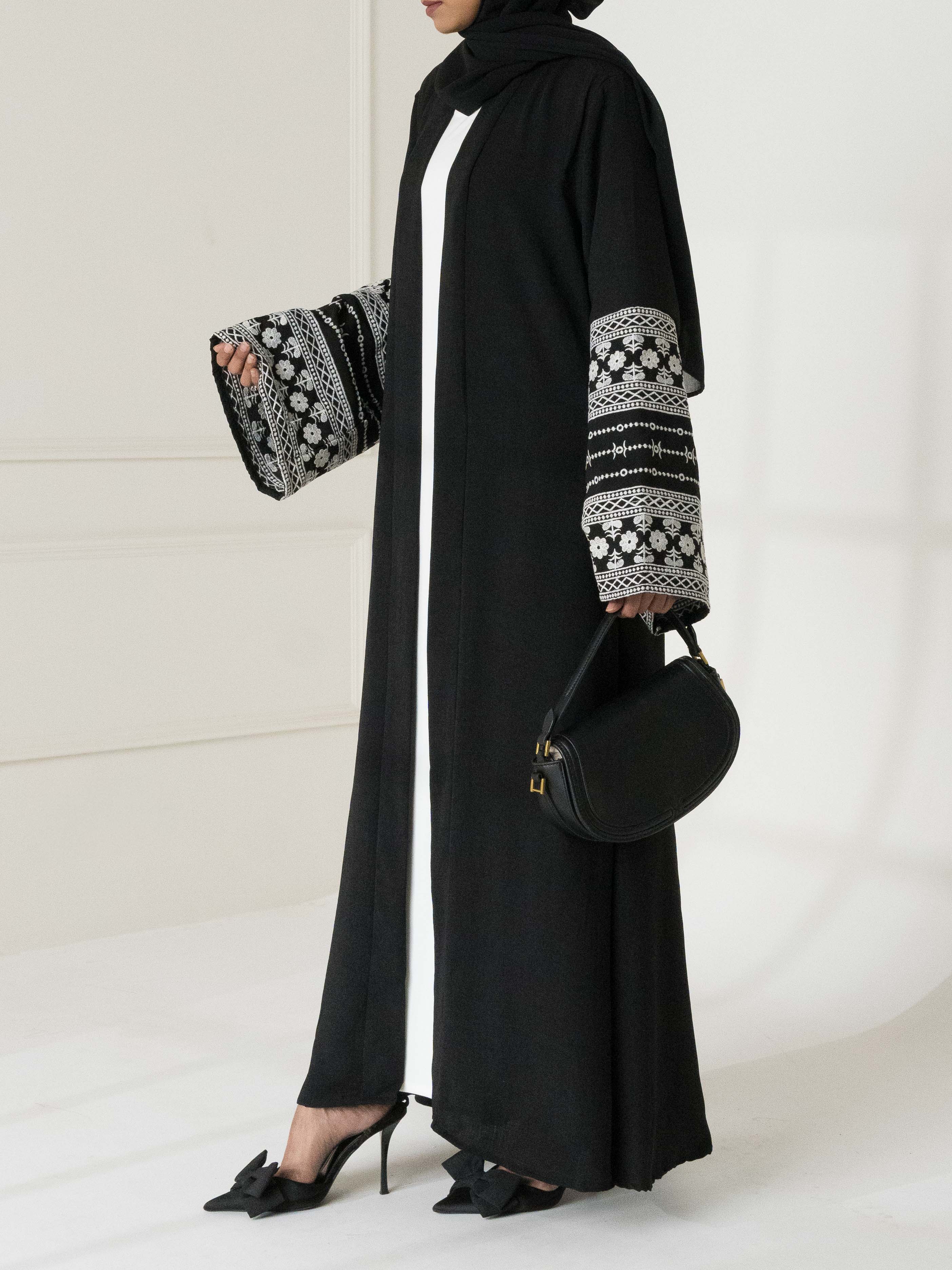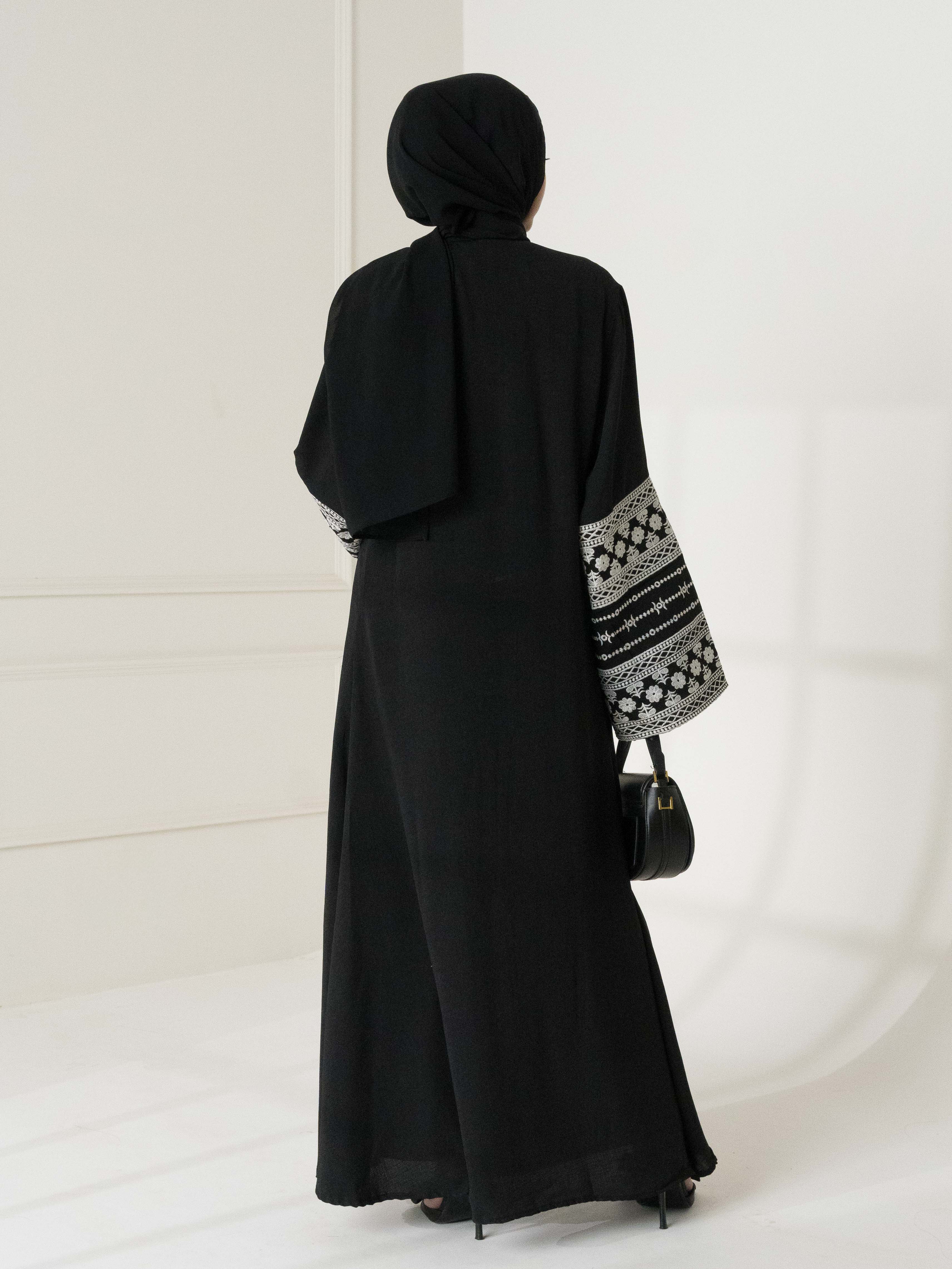 Perfect for both formal and casual occasions, the Kaya abaya combines style and modesty. A must-have two-piece abaya set for those seeking a linen blend abaya with refined details and a unique embroidered sleeve abaya design.