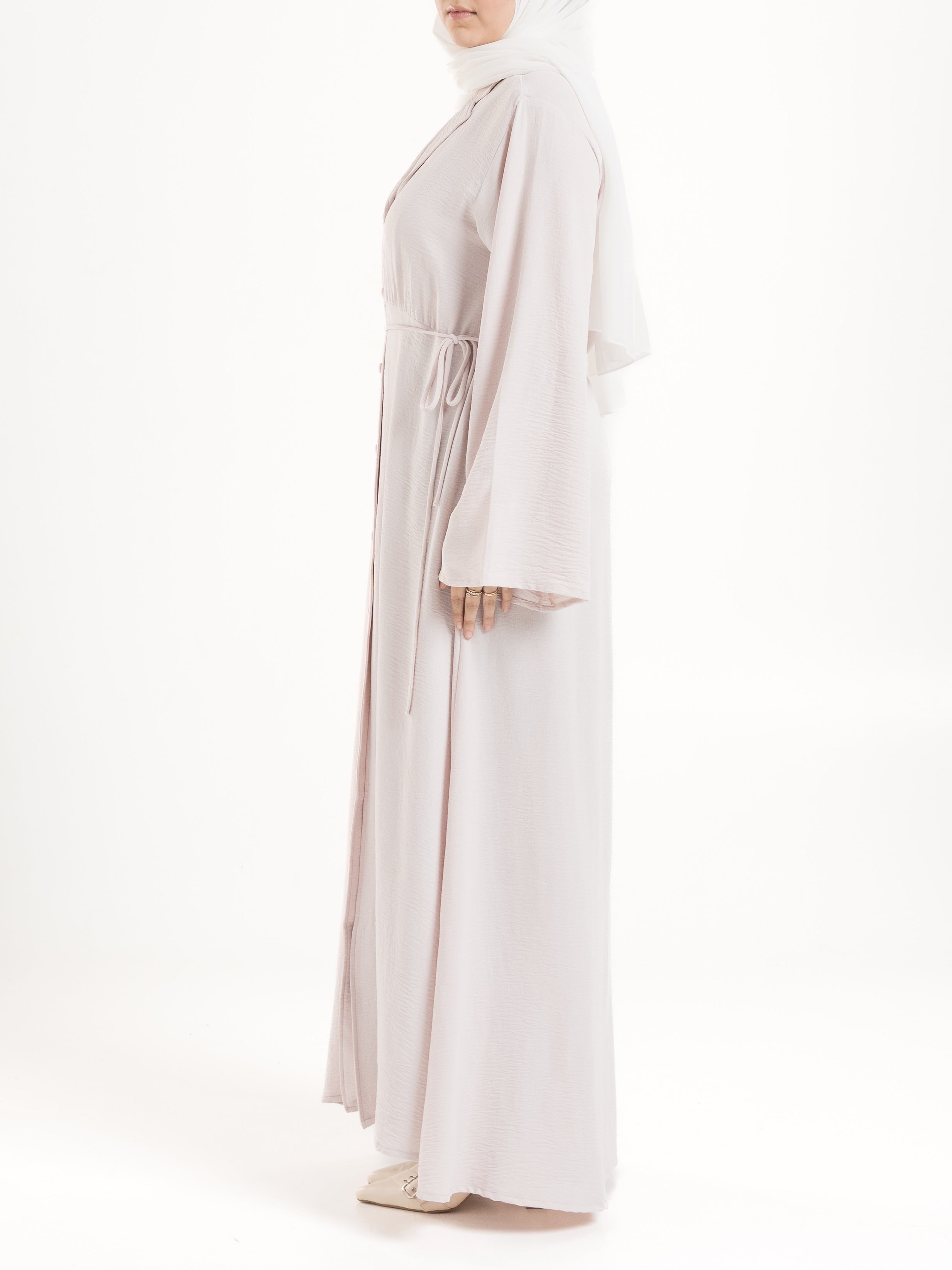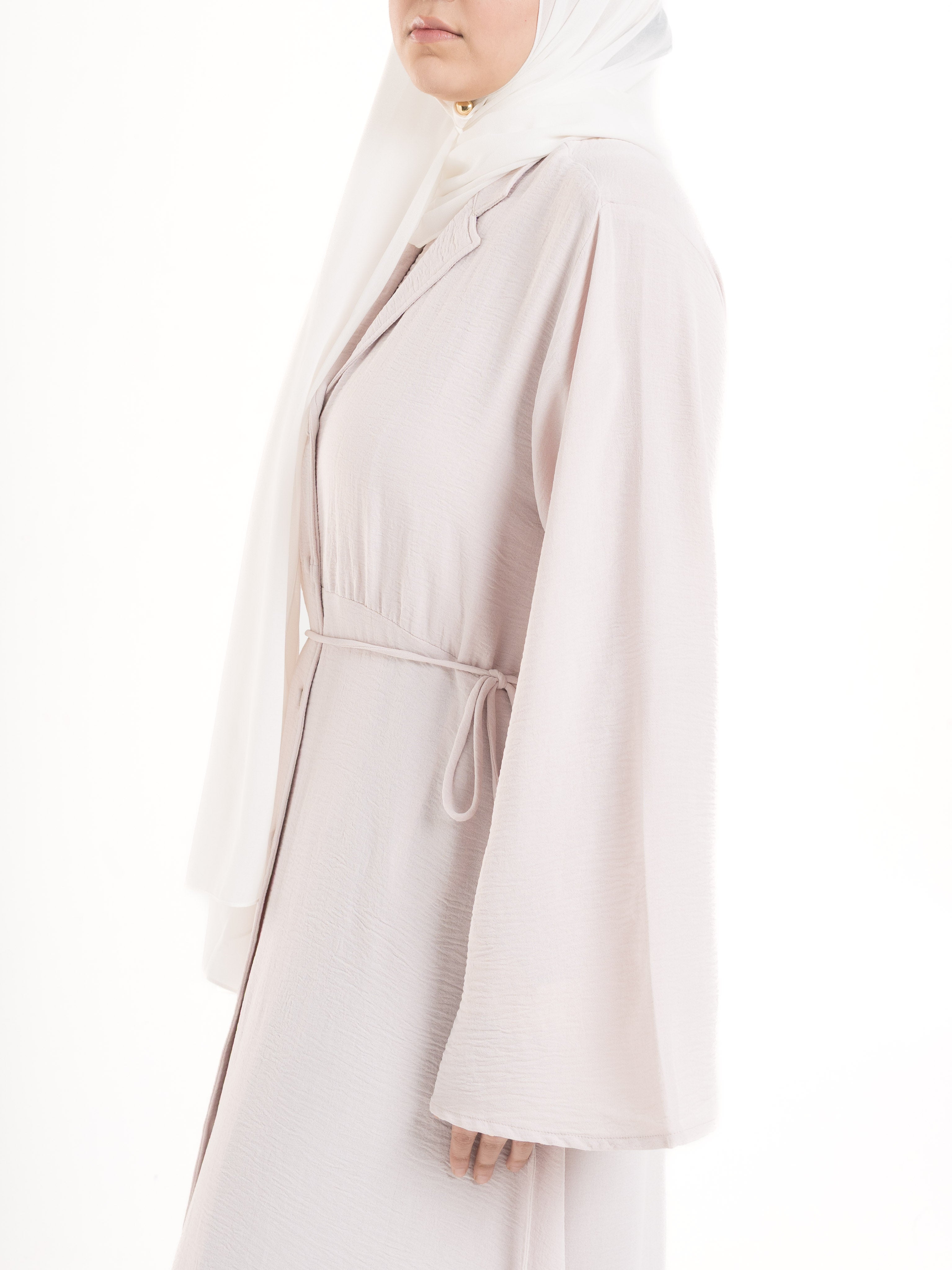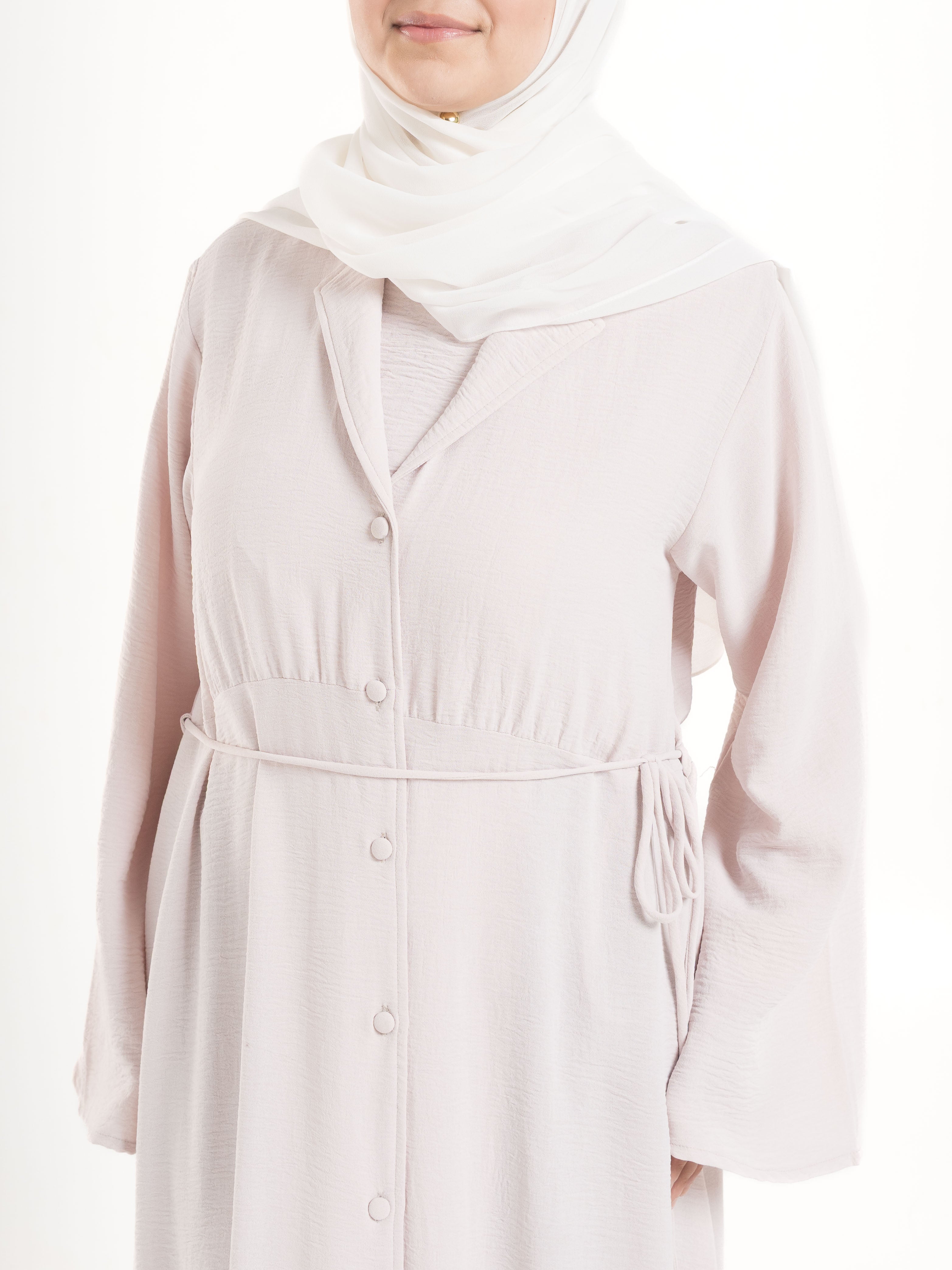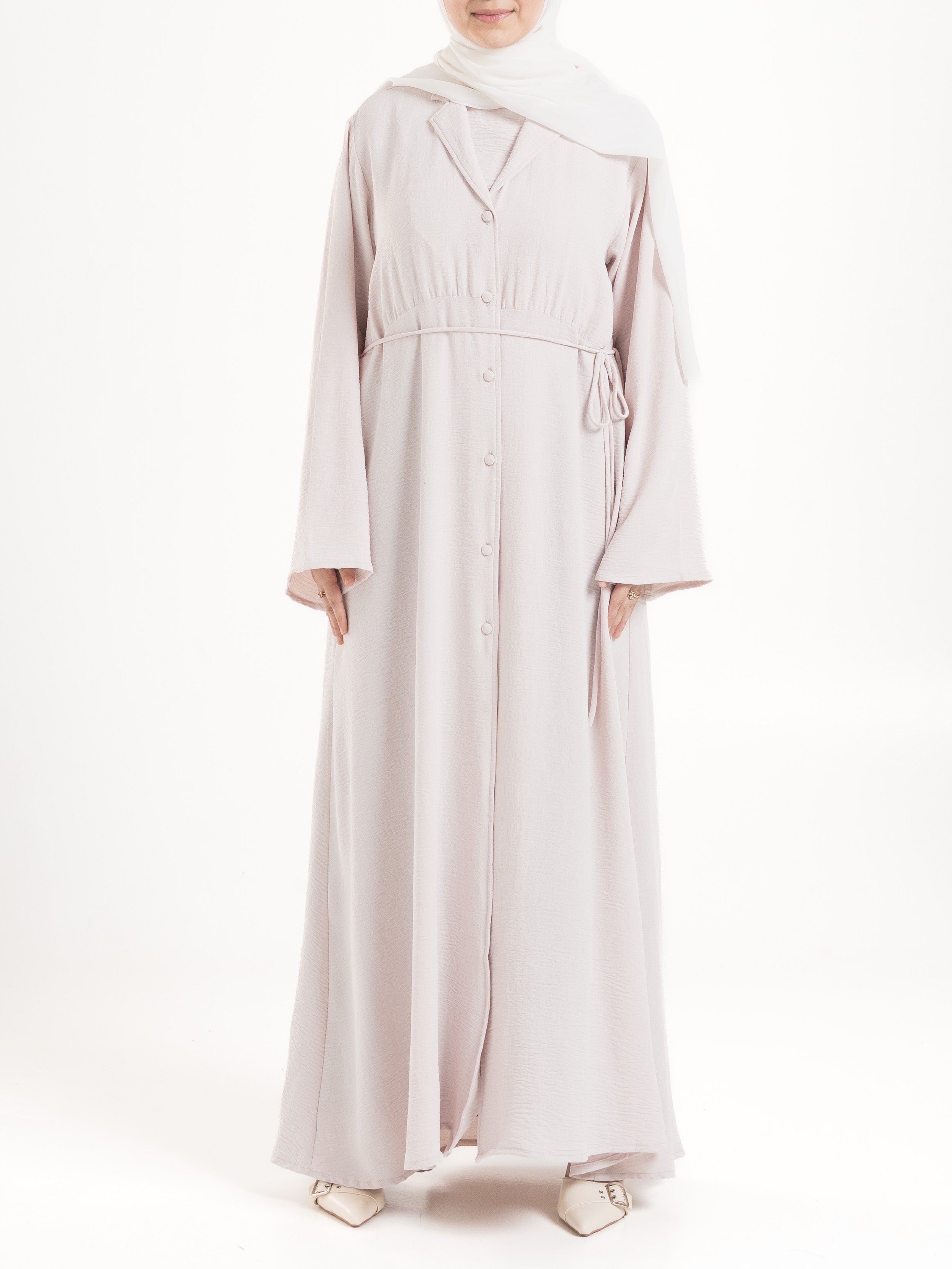 A refined statement piece, this abaya blends contemporary tailoring with timeless modesty. Designed with an attached inner flap and full button-down front, it offers both structure and versatility. The coat-inspired collar and coordinating belt add a polished touch, making it perfect for formal settings or elevated everyday wear.
