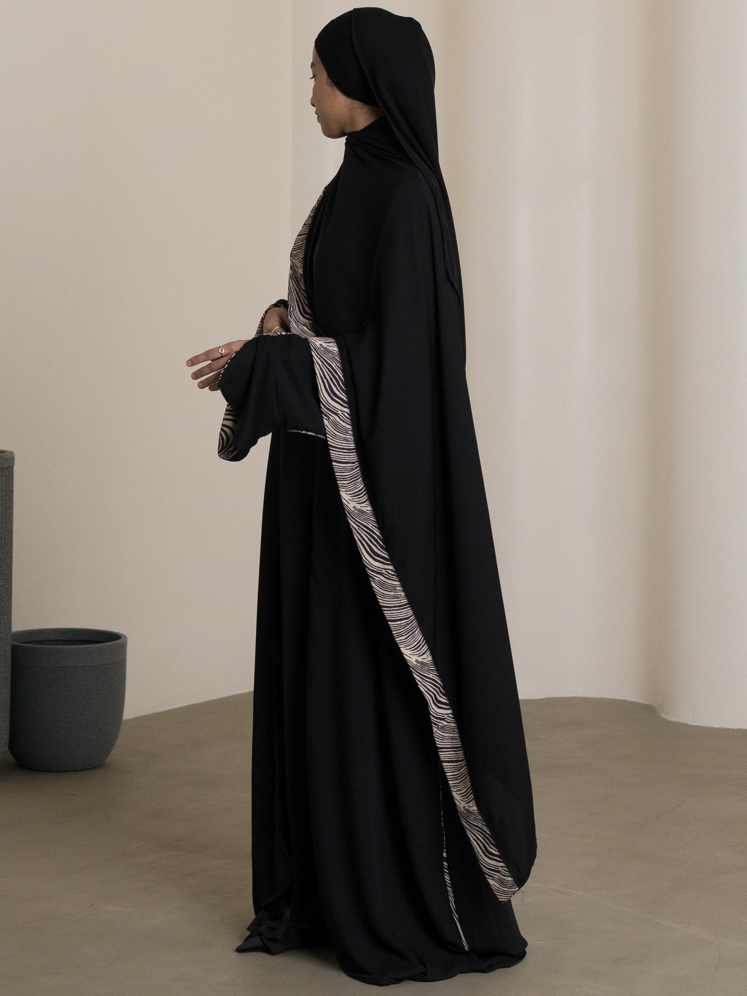 - Elegant printed accents on the abaya sides and hijab.
