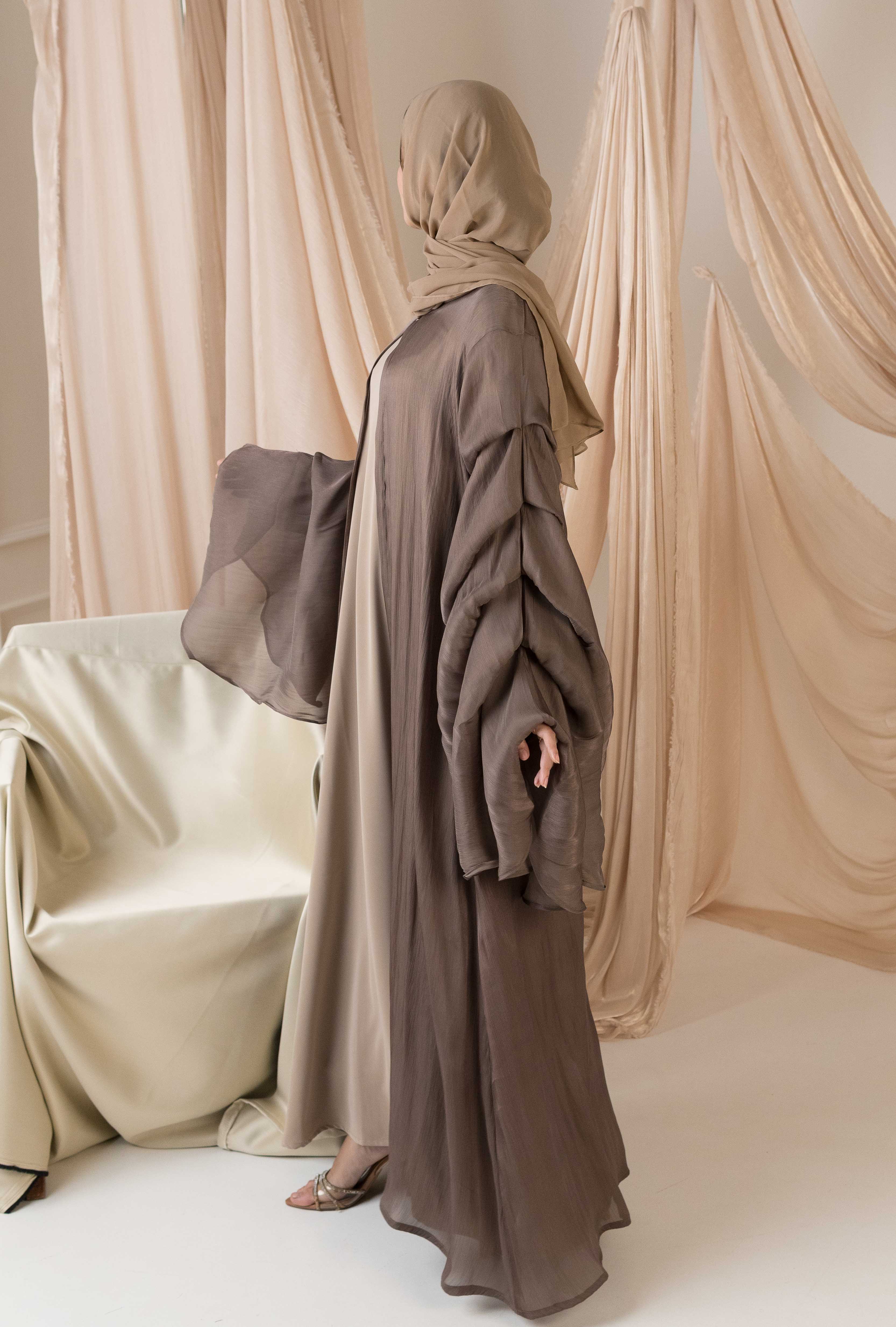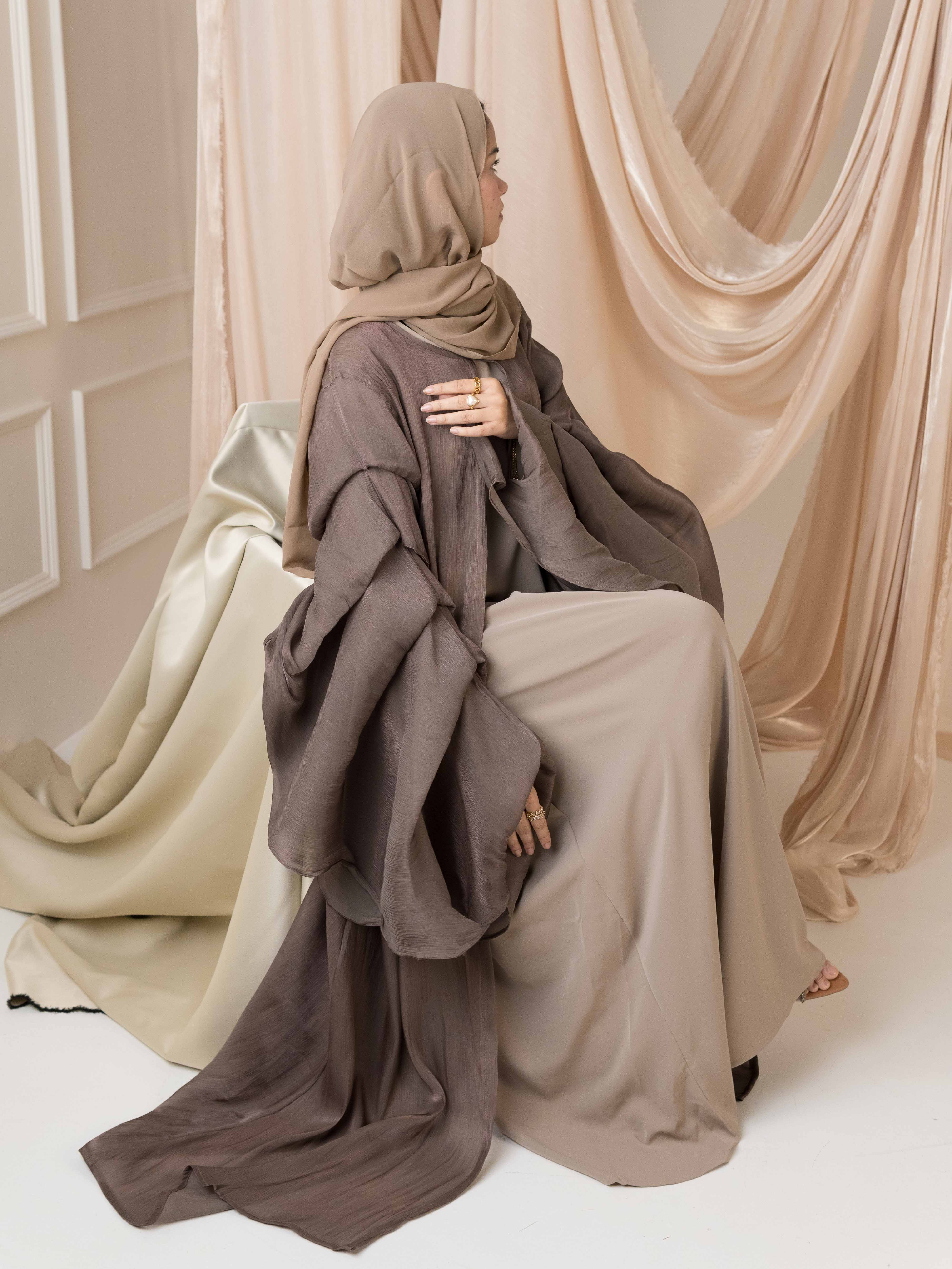 The Alfiya Organza Abaya stands out with its unique layered sleeves and elegant design. This two-piece set includes an inner, offering a chic yet comfortable look, perfect for any minimal function.