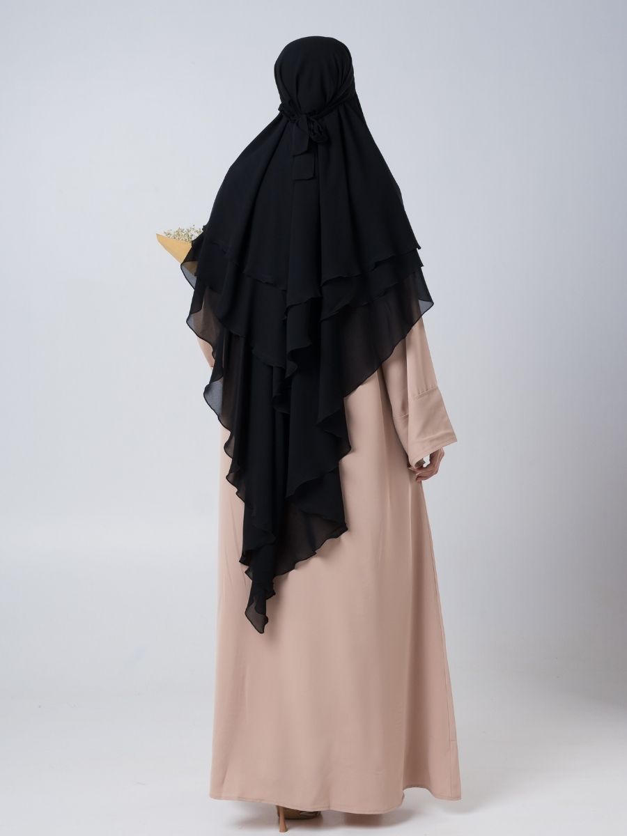 Introducing the 3-Layered Princess Khimar by Modest Essentials, designed for the ultimate blend of elegance and modesty. This stunning khimar features a beautifully tiered, 3-layered design that adds a touch of regal grace to your wardrobe.