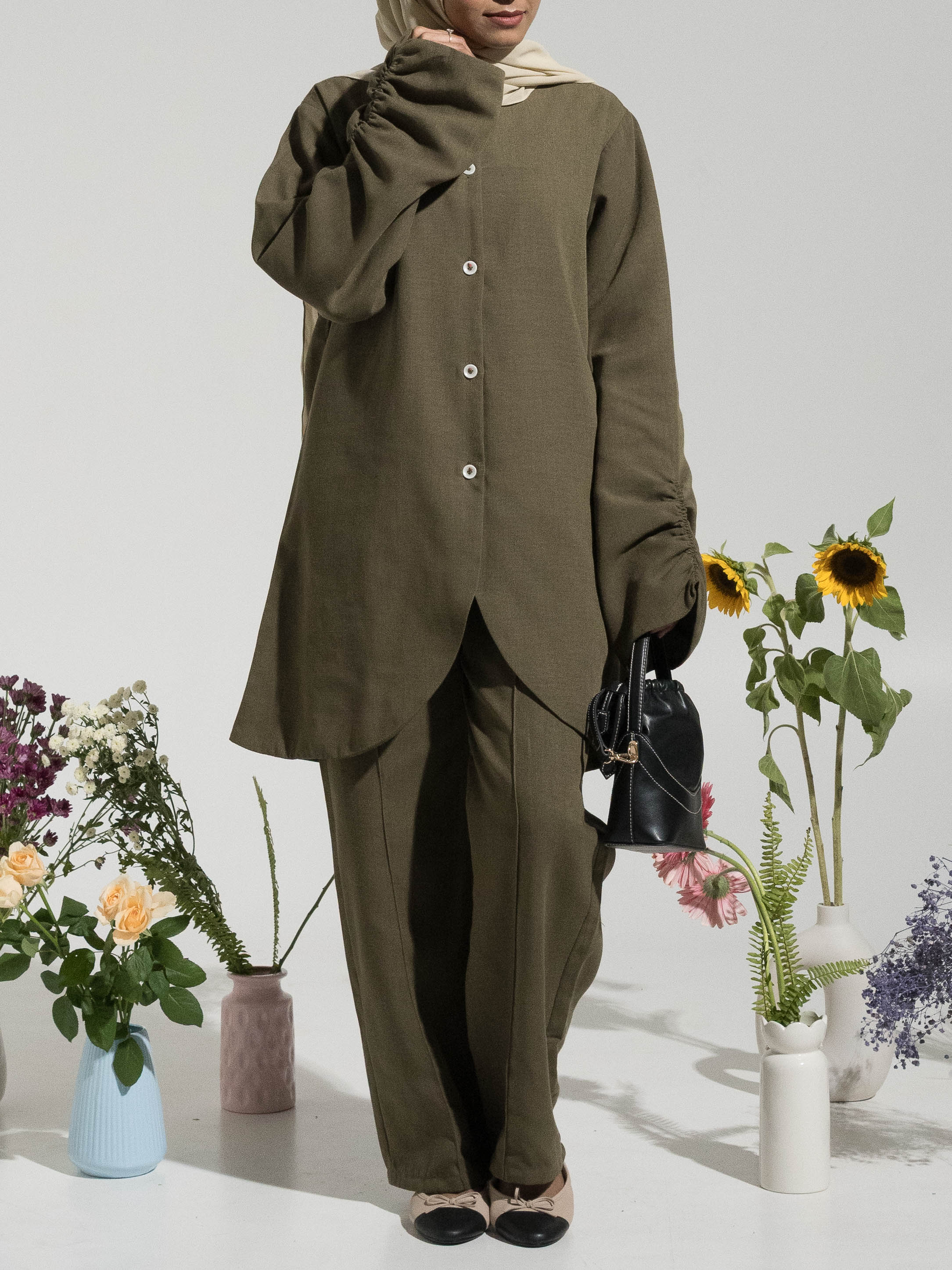 The Chloe Co-ord Set is a beautifully crafted summer essential with thoughtful details that make it stand out. Featuring delicate tulip-embroidered buttons down the front, ruched sleeves, and a chic cut at the hem, the top brings a touch of elegance to everyday dressing.