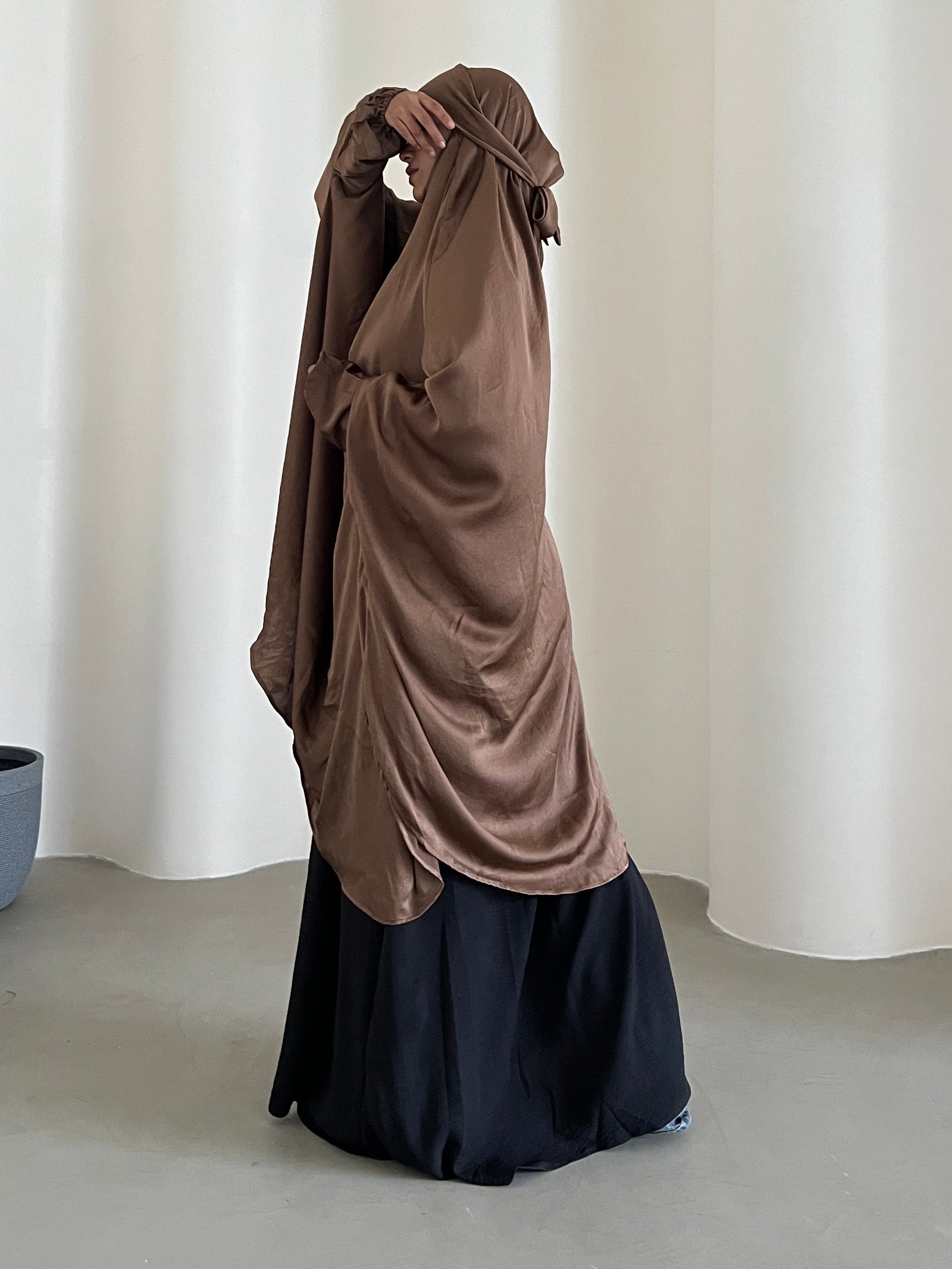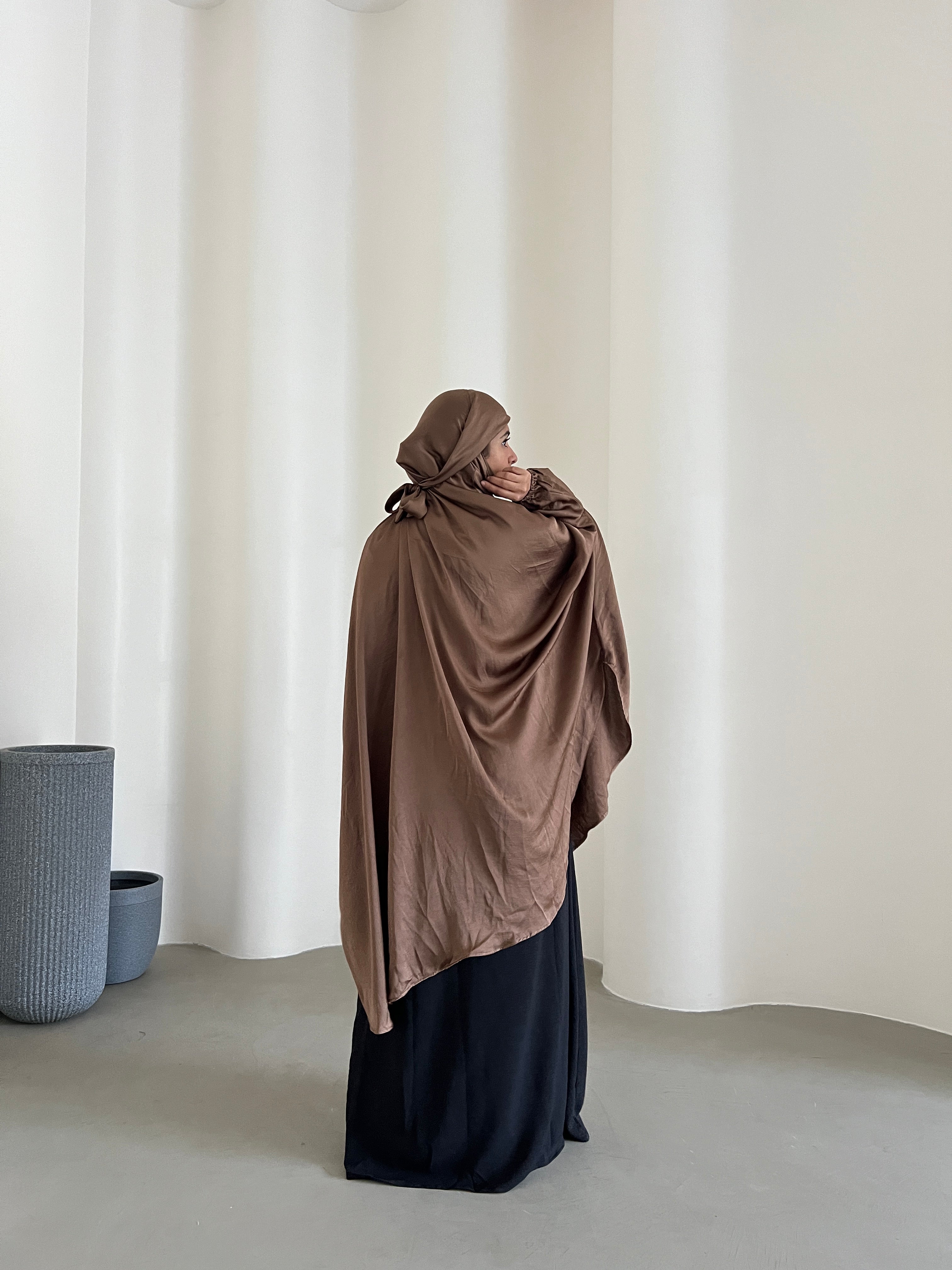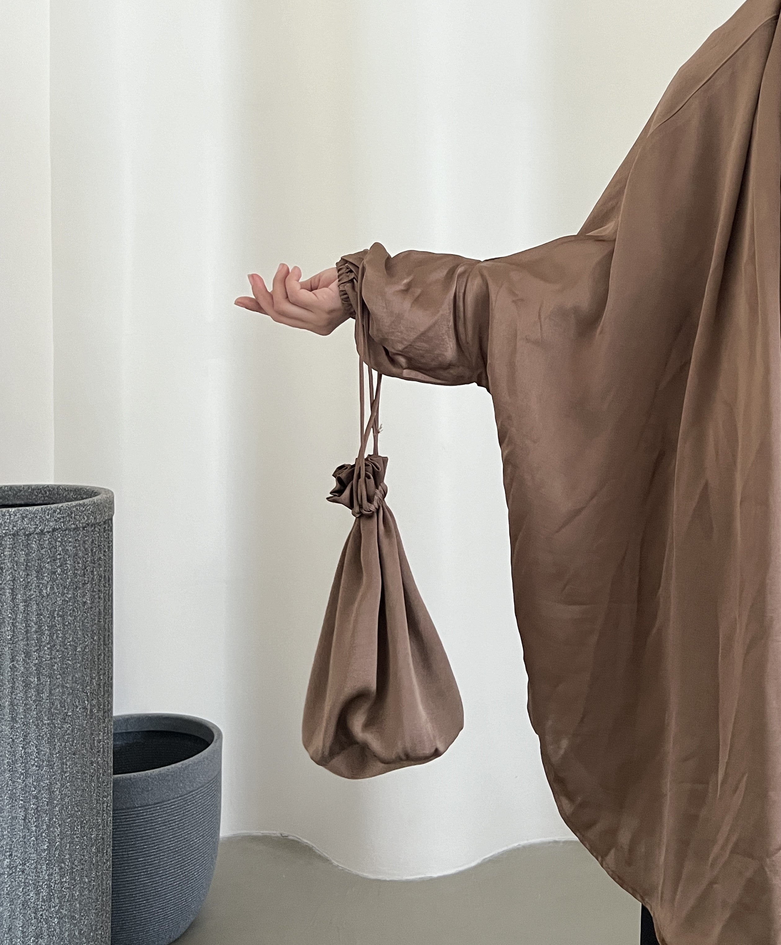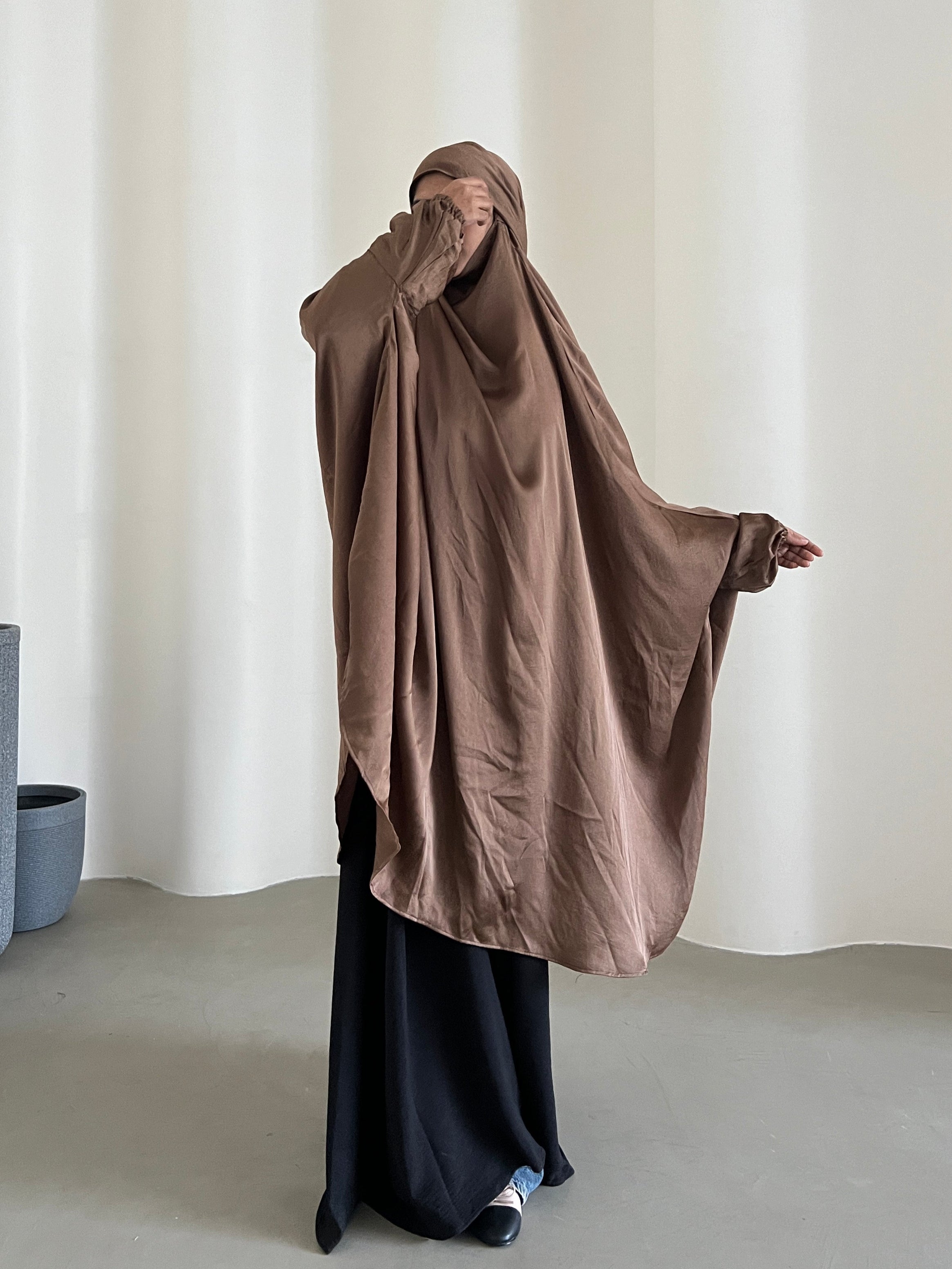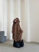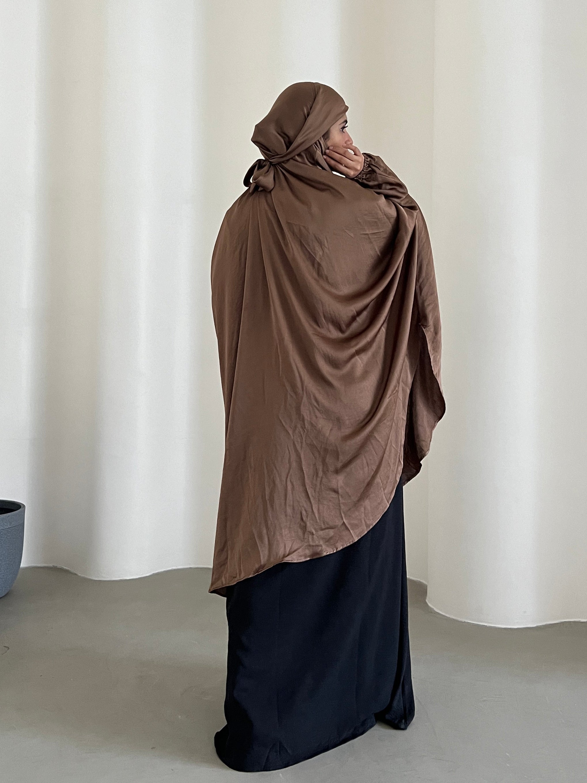 The Travel Jilbab features a tie-up at the back for an adjustable fit and sleeved design cuffs for added comfort. It comes with a matching compact bag, making it perfect for travel and everyday wear.
