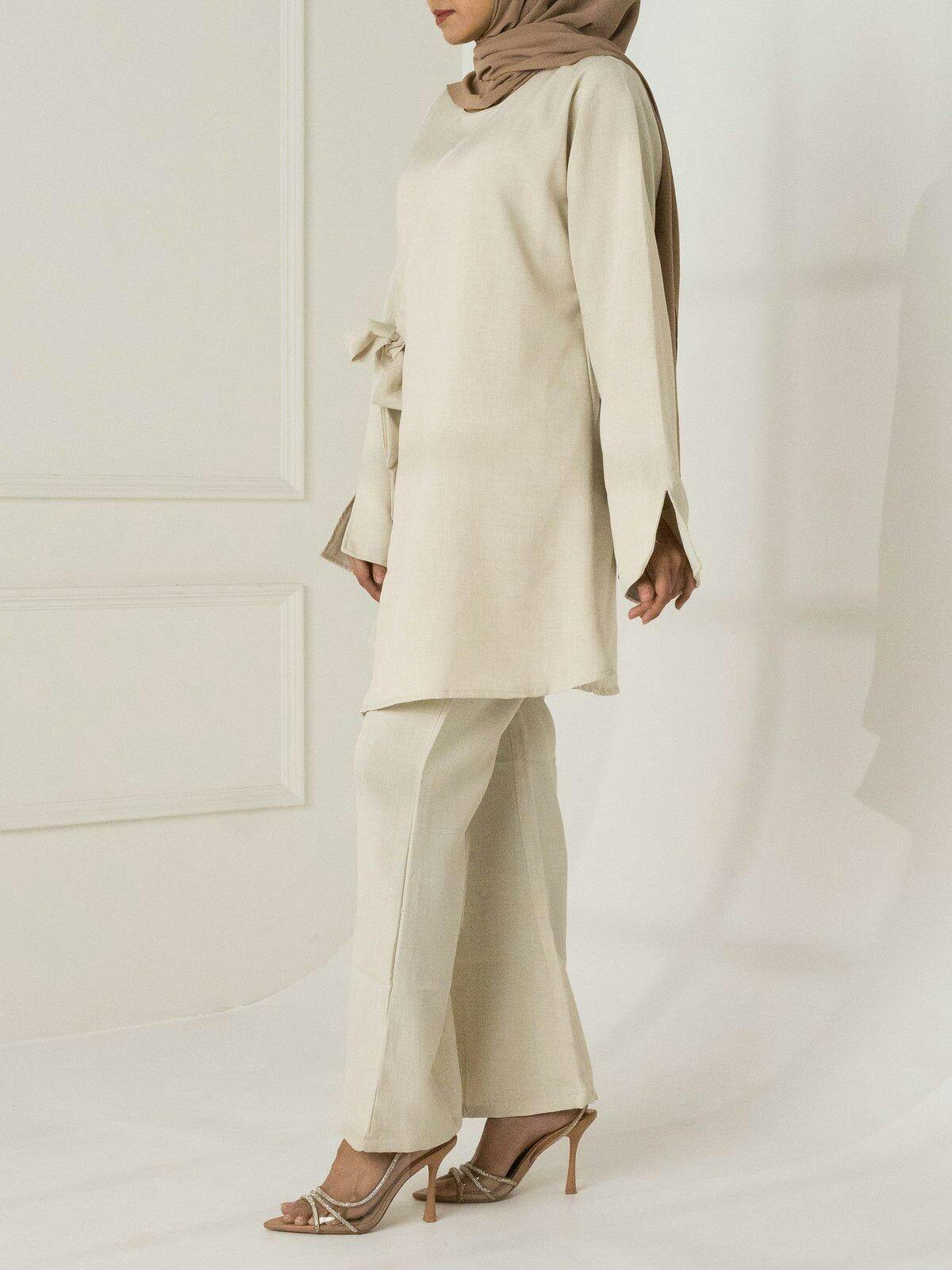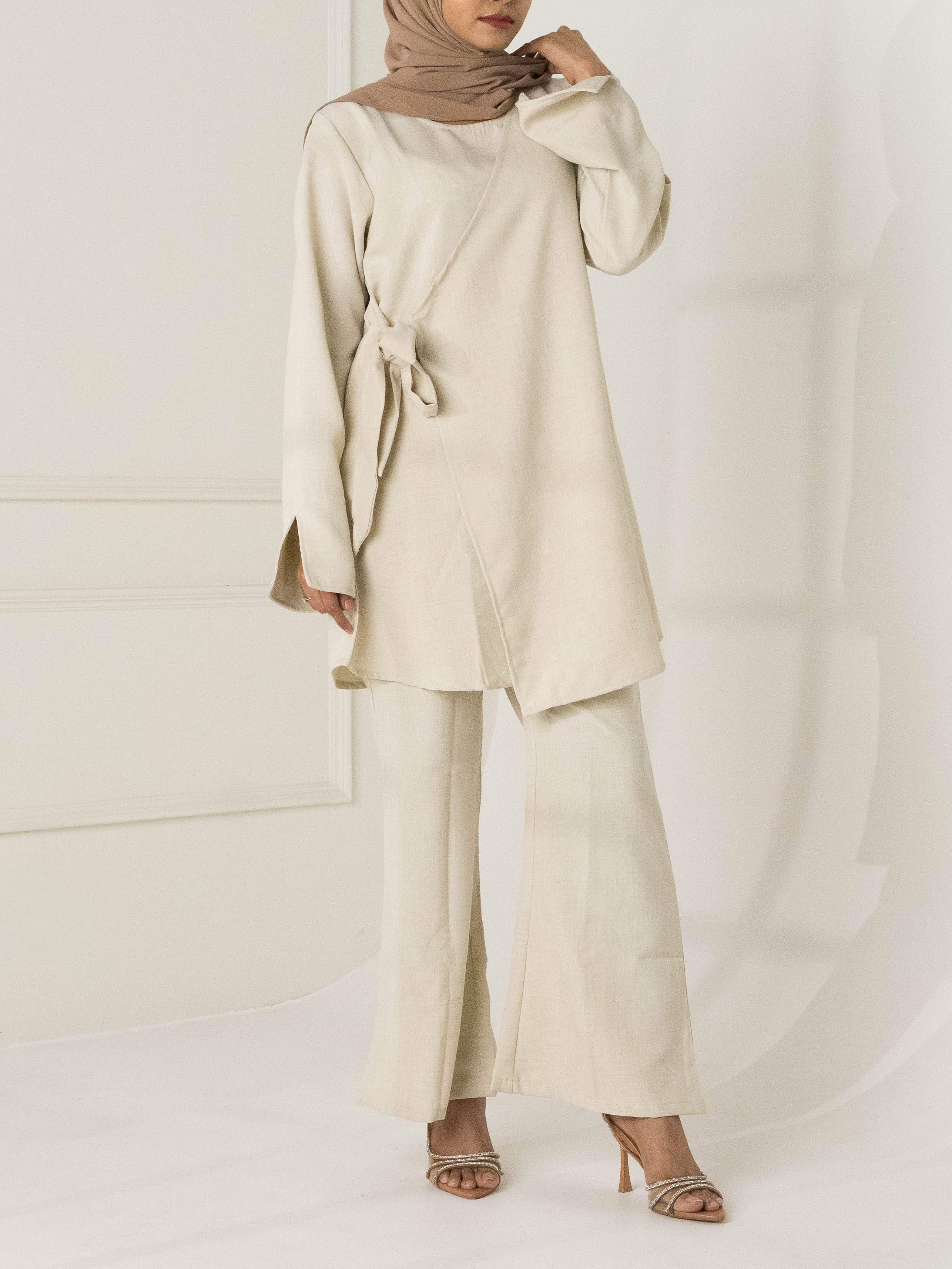 The Maha Wrap Co-Ord Set in Beige is the ultimate combination of elegance and comfort, making it a must-have addition to your wardrobe. This chic two-piece set features a wrap-style top with a flattering, adjustable tie closure, ensuring a customizable fit that flatters your figure while maintaining a modest silhouette. Whether you're dressing for a brunch outfit or a polished event, this wrap co-ord set offers effortless style and versatility. Embrace sophistication with this must-have co-ord set.