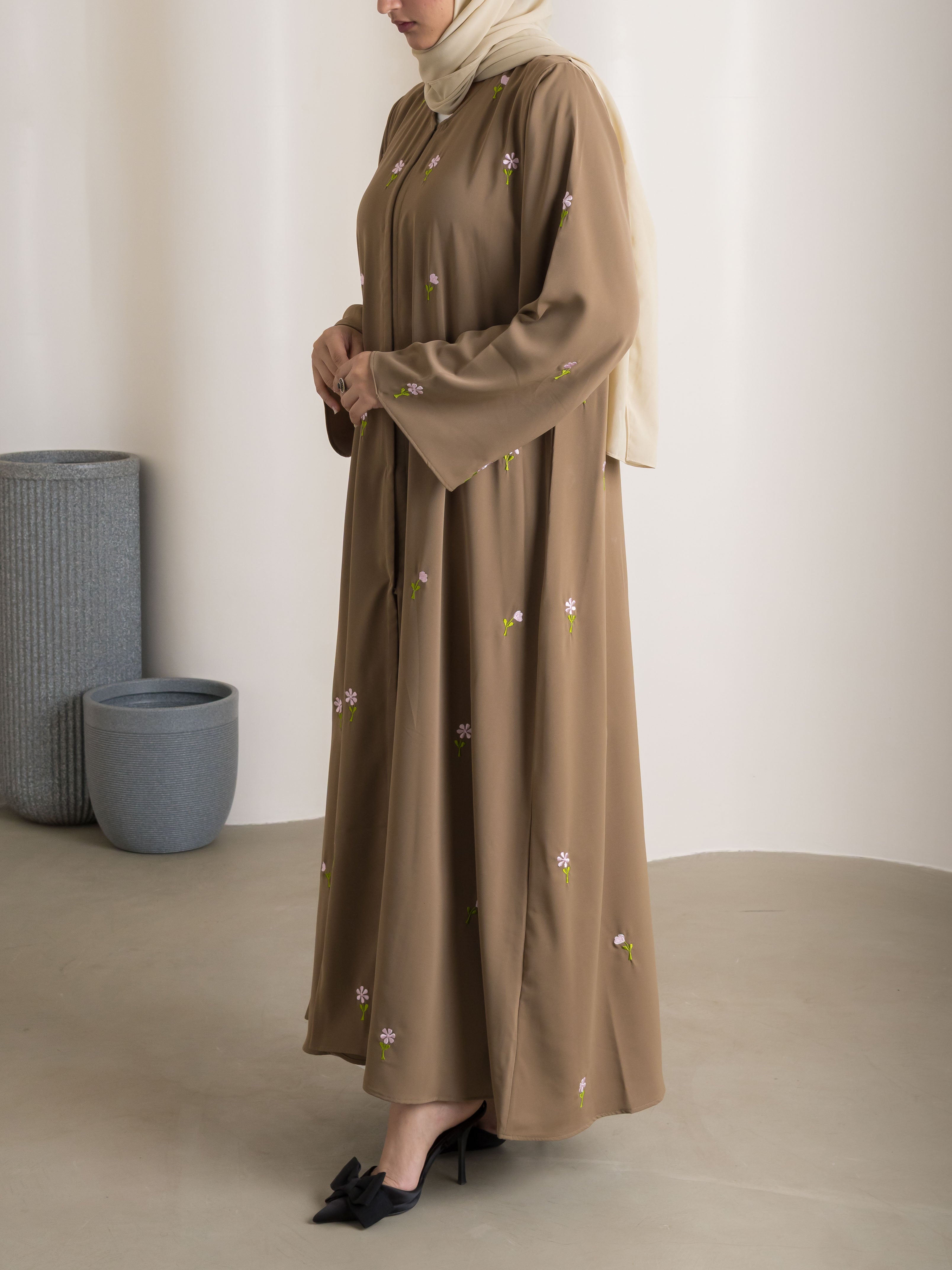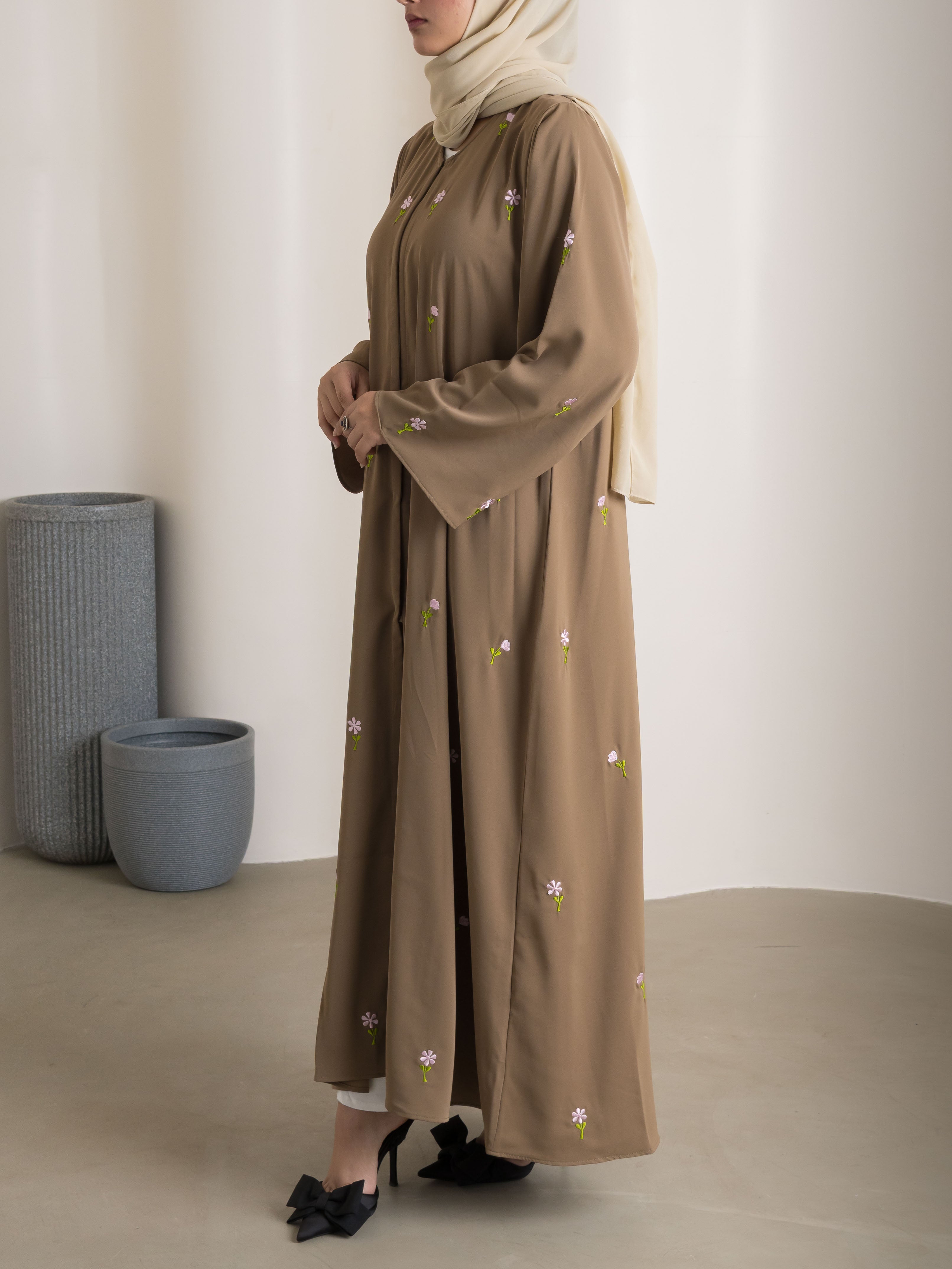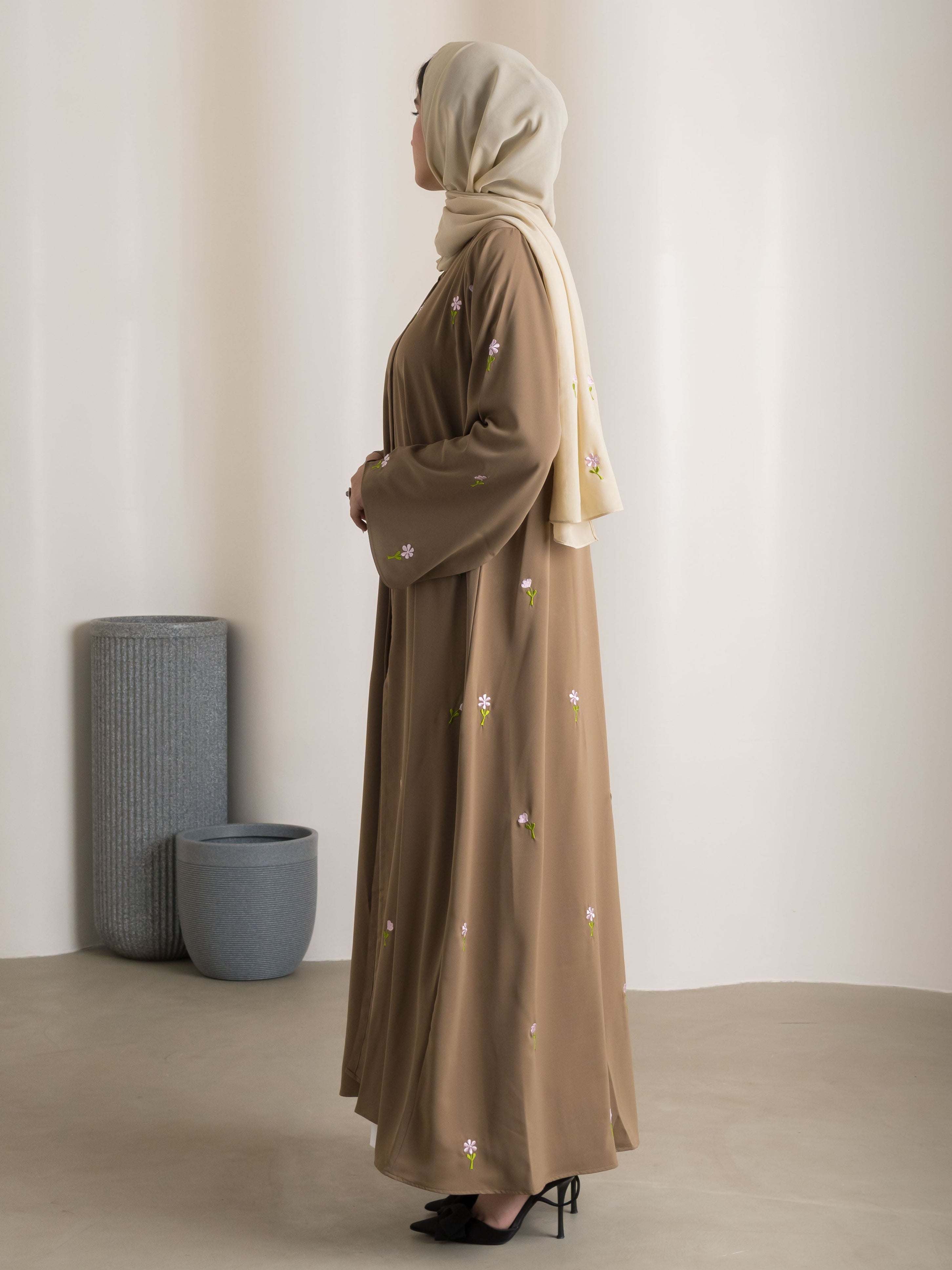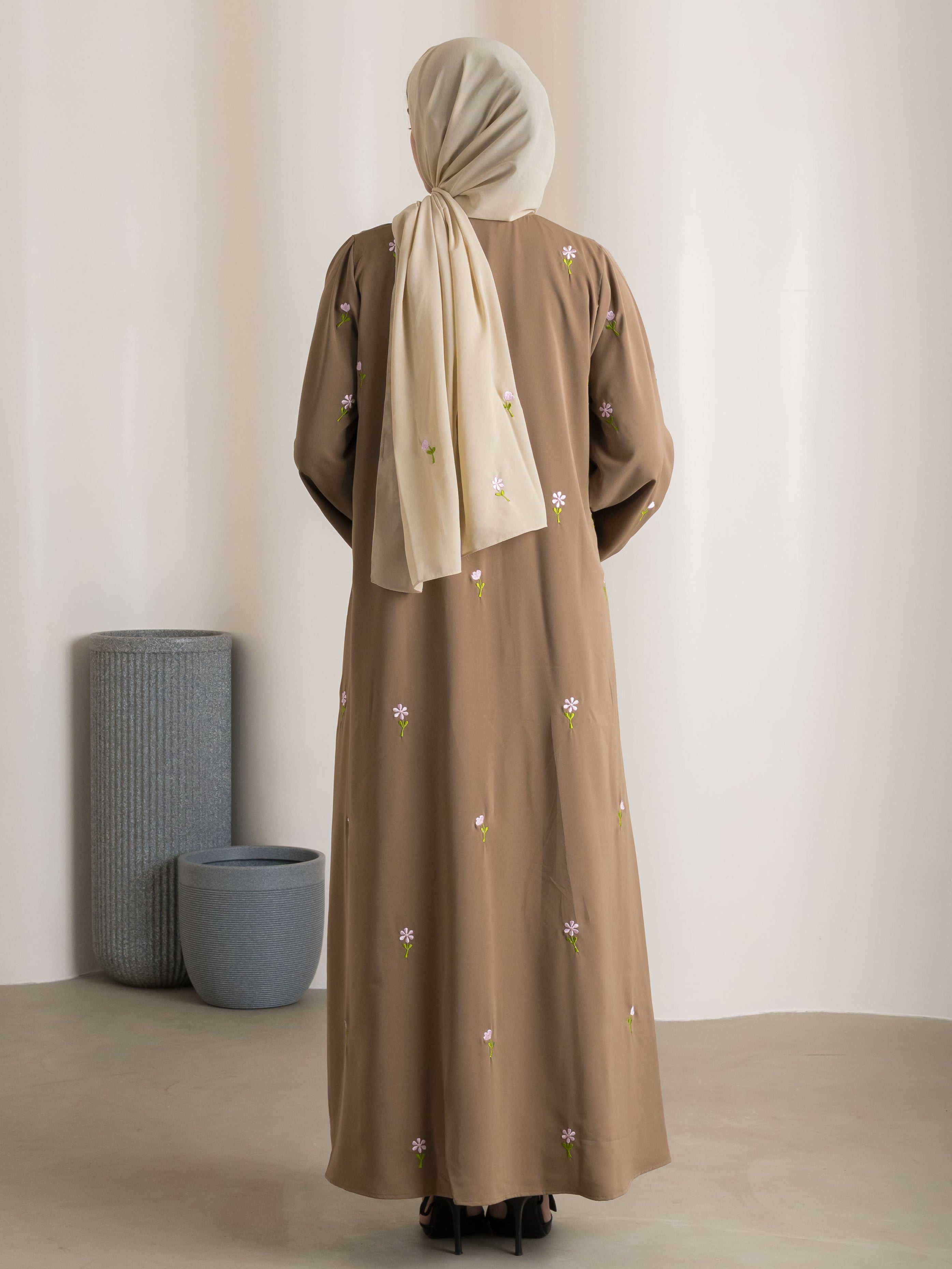 The Zuhur Abaya, a stunning blend of elegance and charm. Adorned with delicate floral details, this abaya embodies sophistication with a touch of femininity. The matching hijab completes the look, offering effortless grace and modesty.
